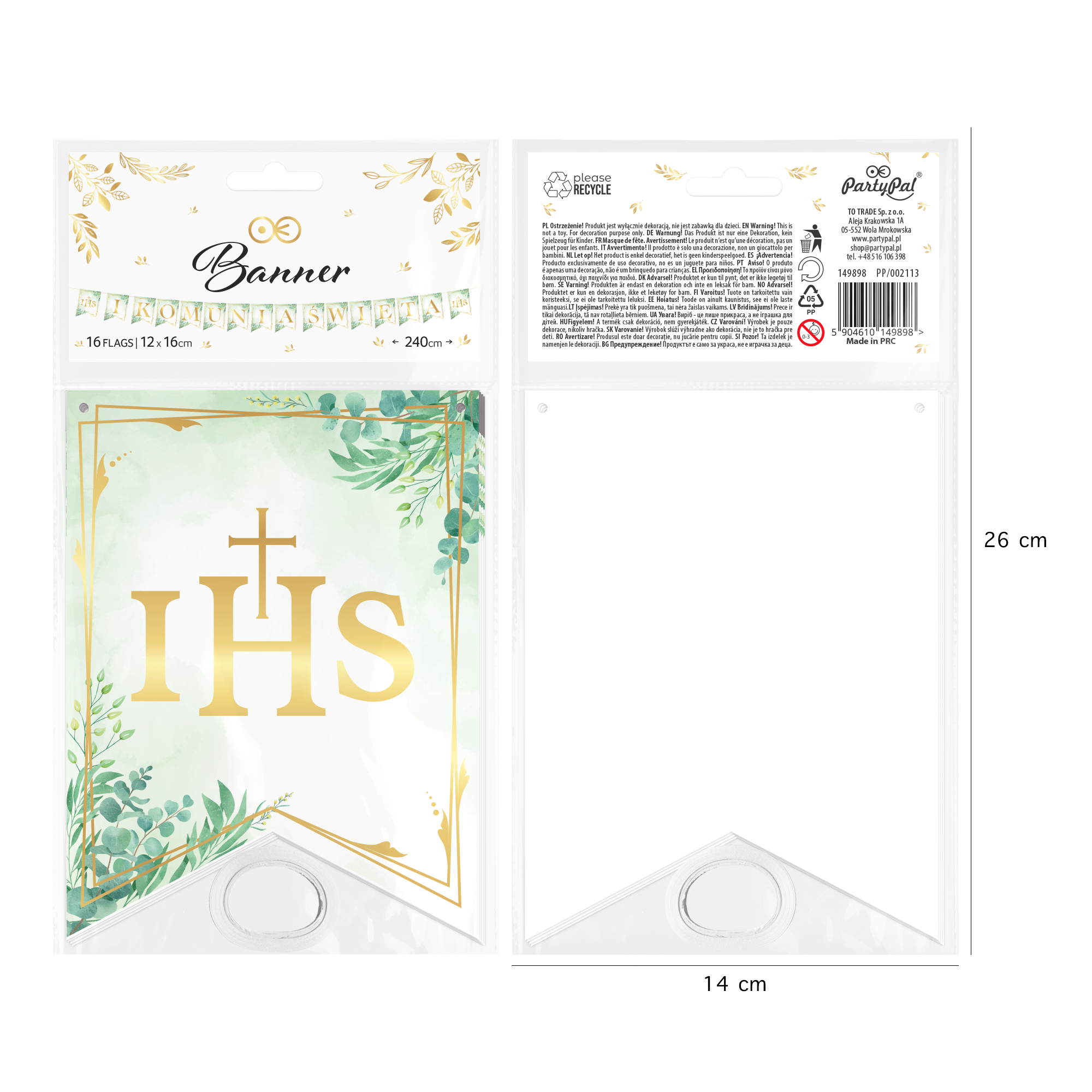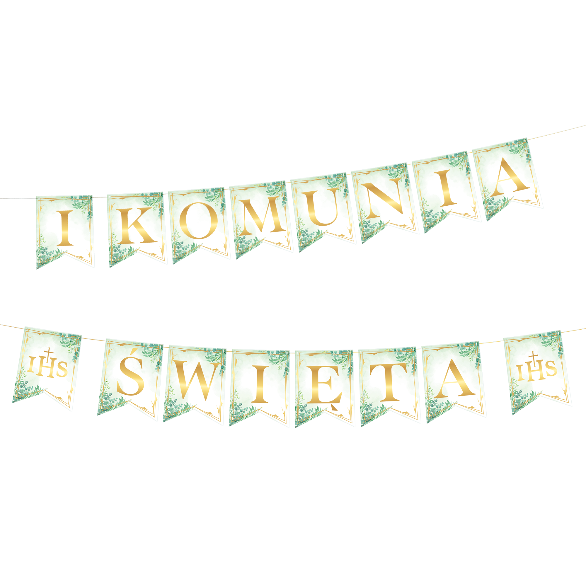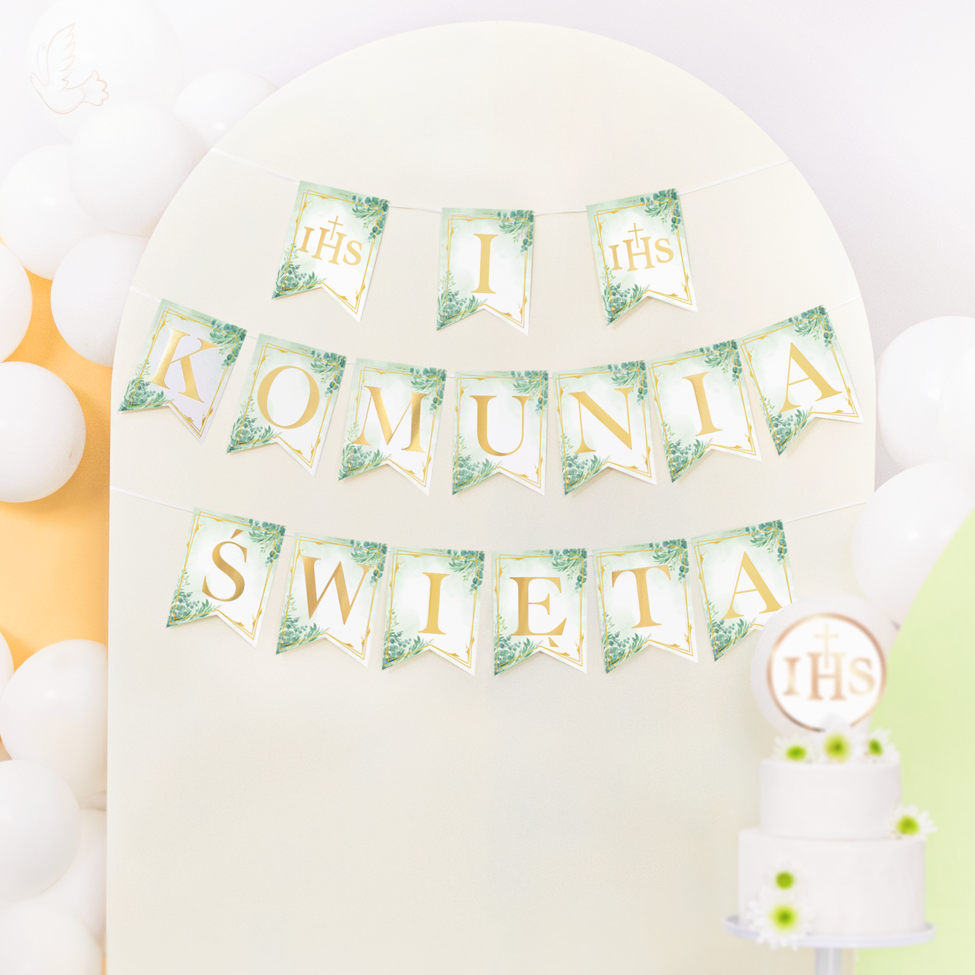Gałązki z zielonymi listkami stanowią doskonałe tło dla złotych liter umieszczonych na flagach komunijnego banera. Ta elegancka dekoracja w szczególny sposób podkreśli uroczysty charakter tego wyjątkowego rodzinnego spotkania.