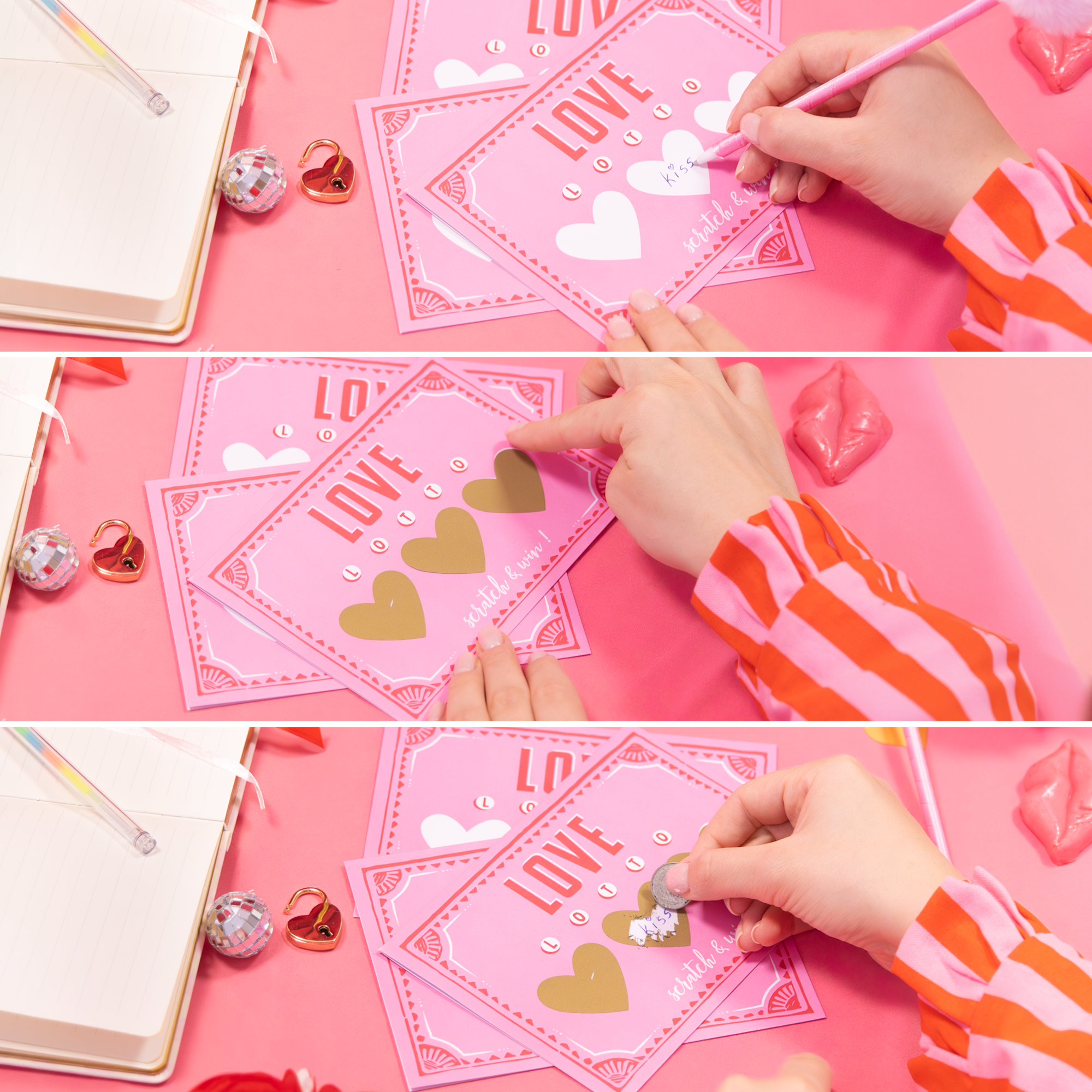 Walentynkowe kartki ze zdrapką, na każdej kartce 3 serduszka do zdrapania, w zestawie 9 naklejek-zdrapek. Na serduszkach samodzielnie zapisujemy dedykację, myśl lub nagrodę. W oryginalny sposób można wyrazić słowa Kocham Cię.