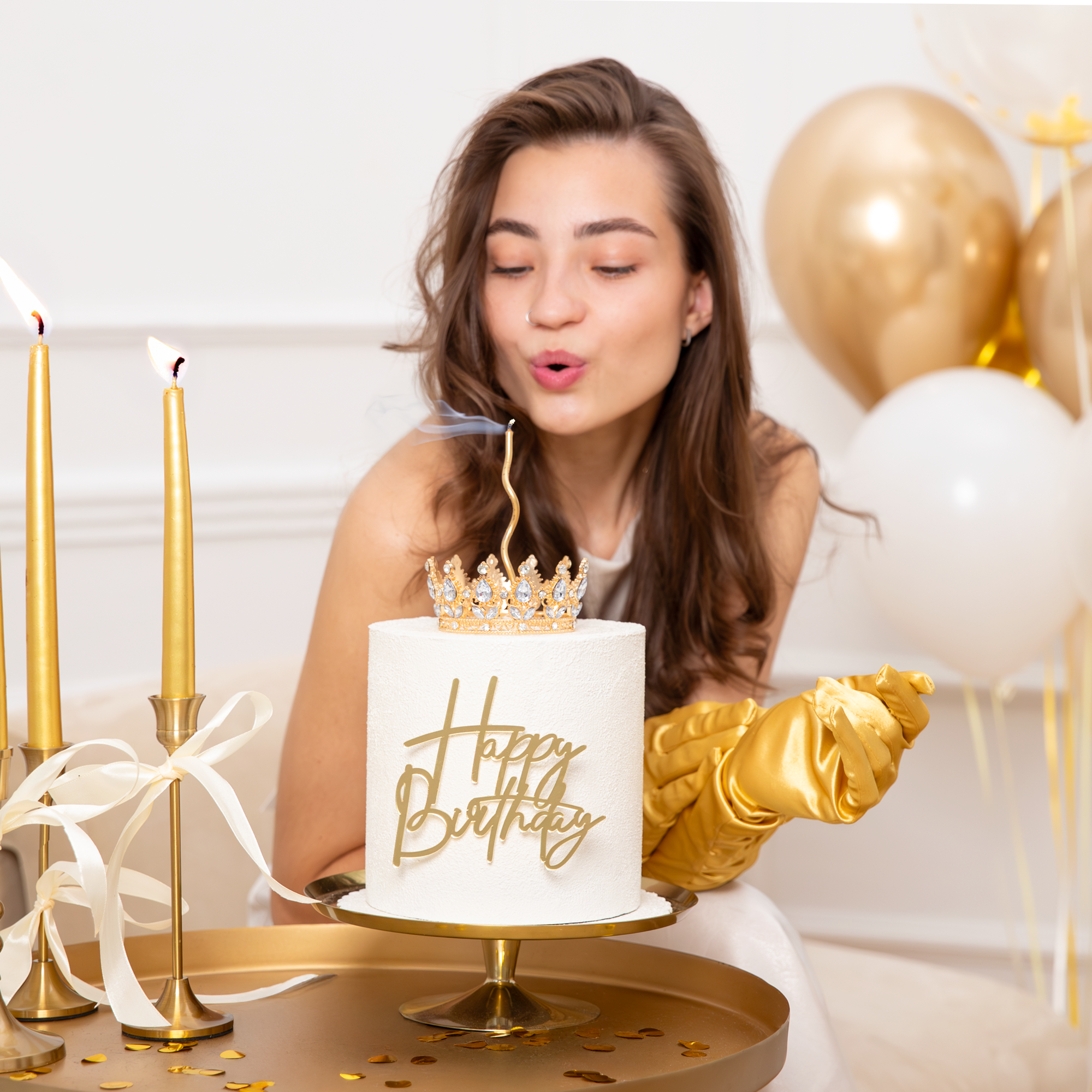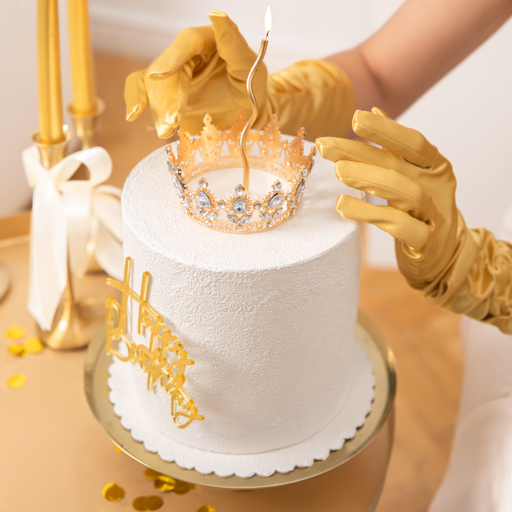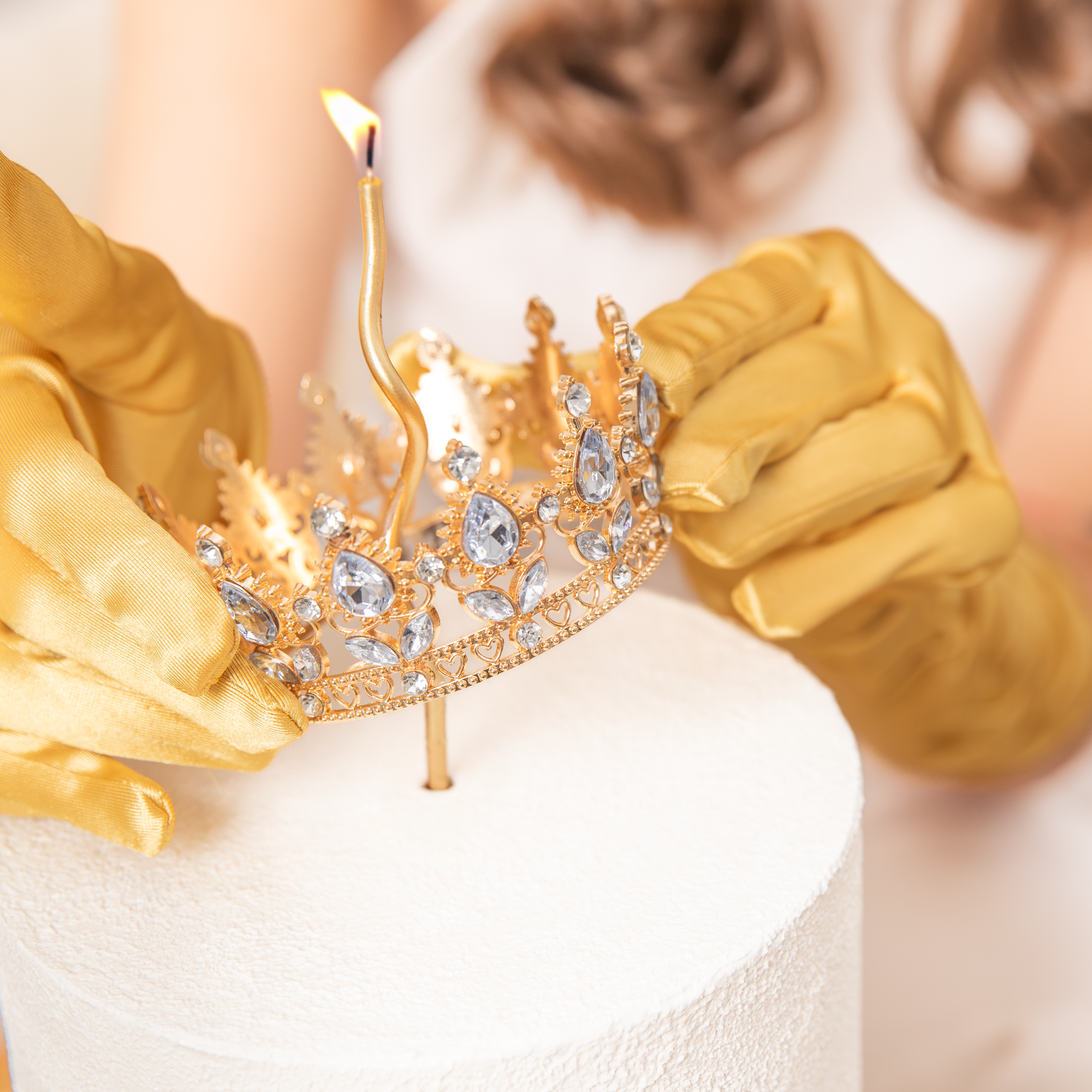 Piękna ozdoba na tort w postaci korony, idealna zarówno dla małych, jak i dużych księżniczek. Produkt wykonany z niezwykłą starannością, łączący w sobie elegancję oraz unikalny design. Korona w kolorze złotym ze srebrnymi kryszt.ałkami doda blasku każdemu przyjęciu, podkreślając jego wyjątkowy charakter.