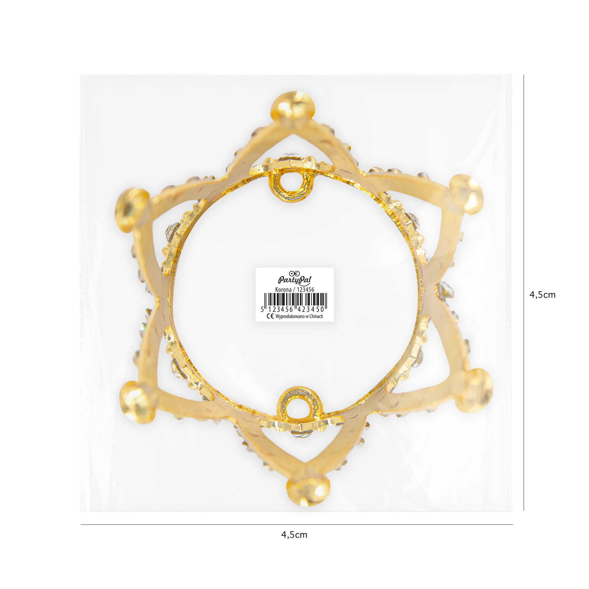 Piękna ozdoba na tort w postaci korony, idealna zarówno dla małych, jak i dużych księżniczek. Produkt wykonany z niezwykłą starannością, łączący w sobie elegancję oraz unikalny design. Korona w kolorze złotym ze srebrnymi kryszt.ałkami doda blasku każdemu przyjęciu, podkreślając jego wyjątkowy charakter.