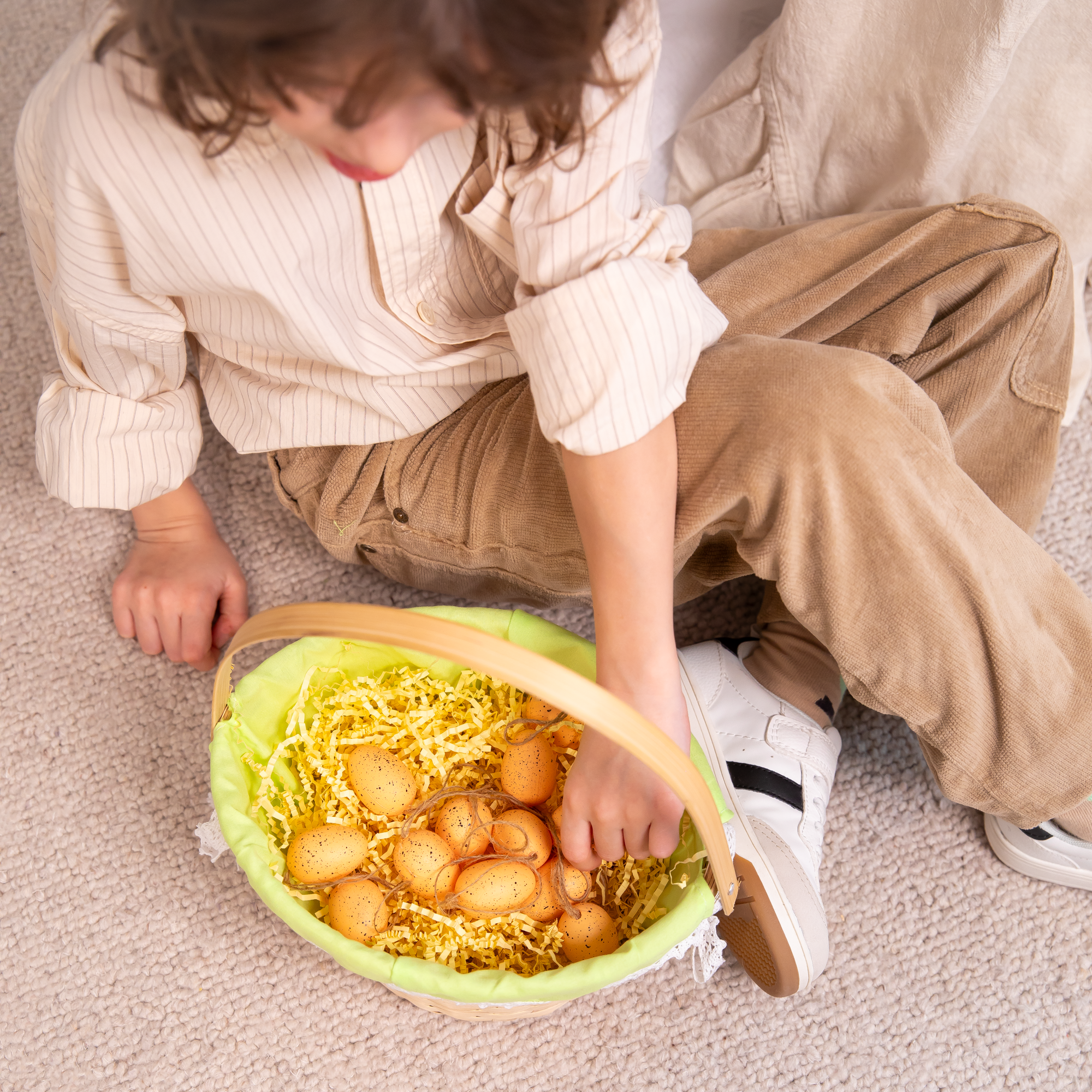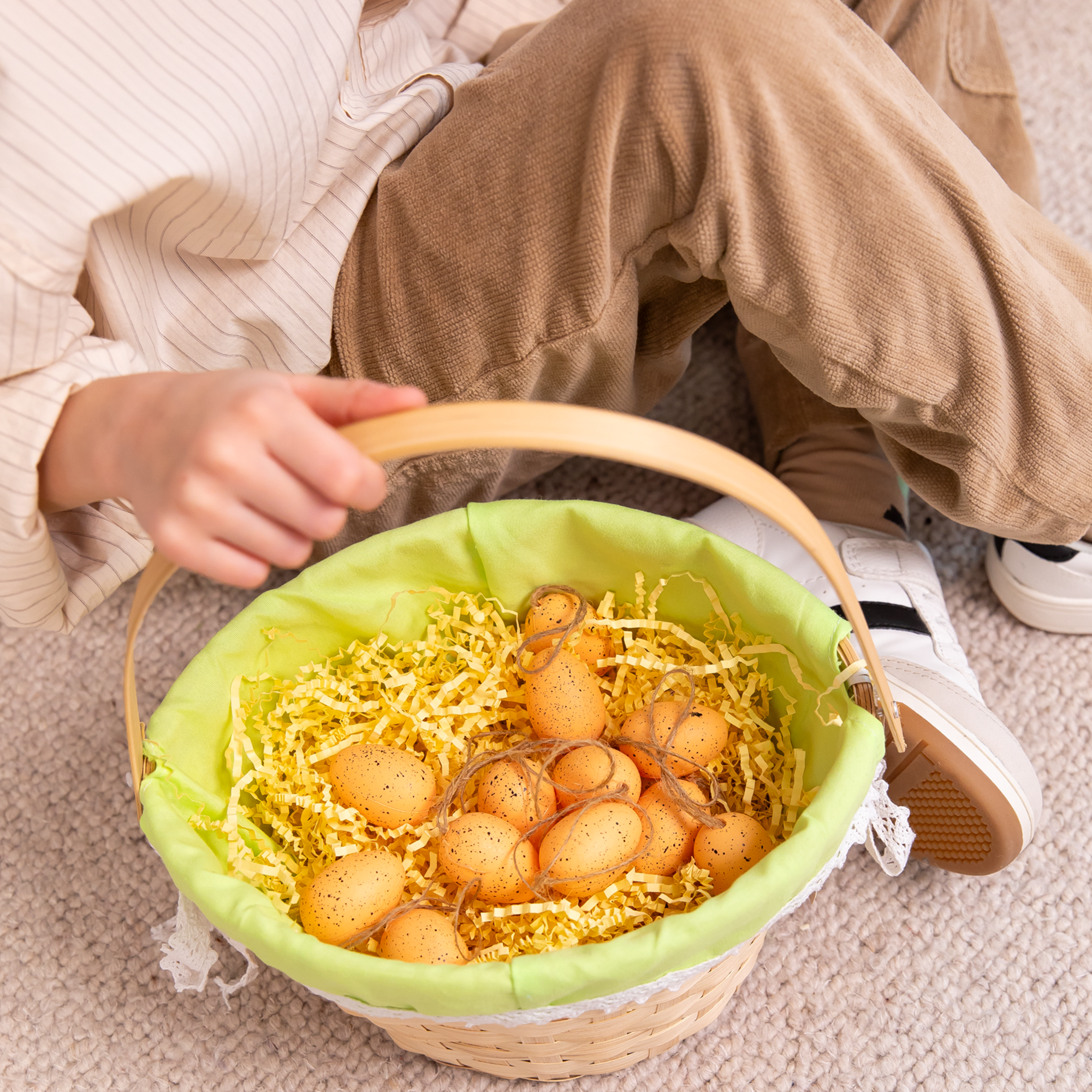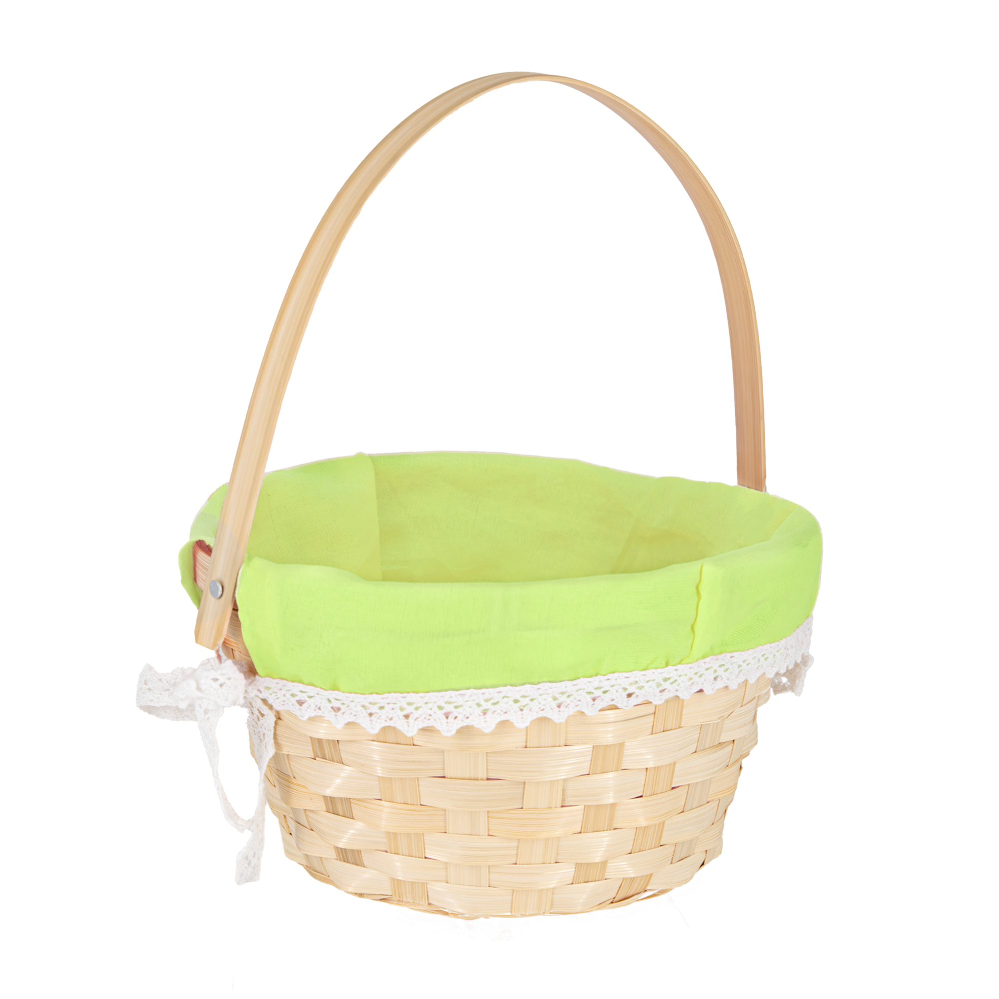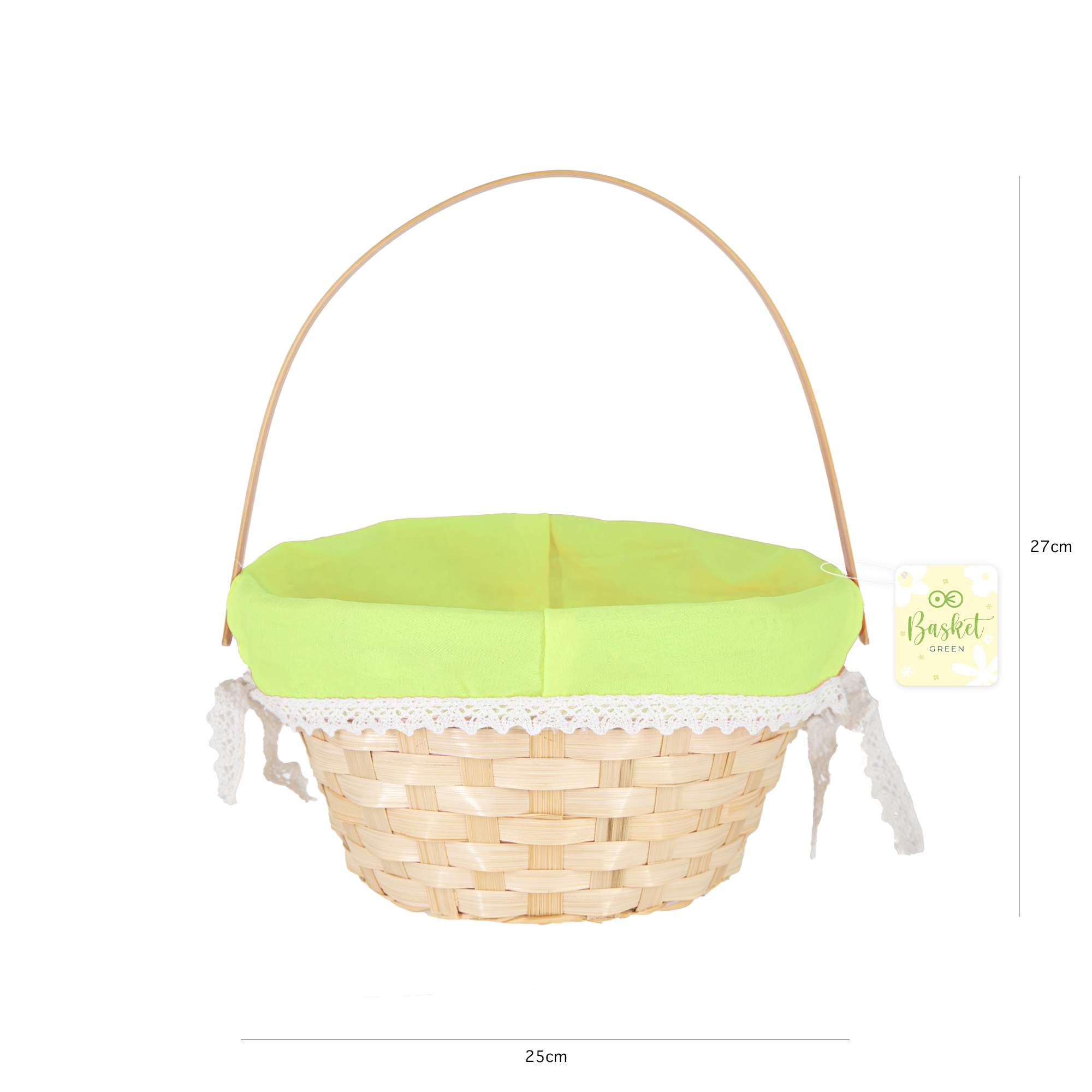Koszyczek bambusowy na Wielkanoc, Boże Ciało, kwiaty lub do pakowania prezentów, wyłożony zieloną tkaniną wykończoną koronką