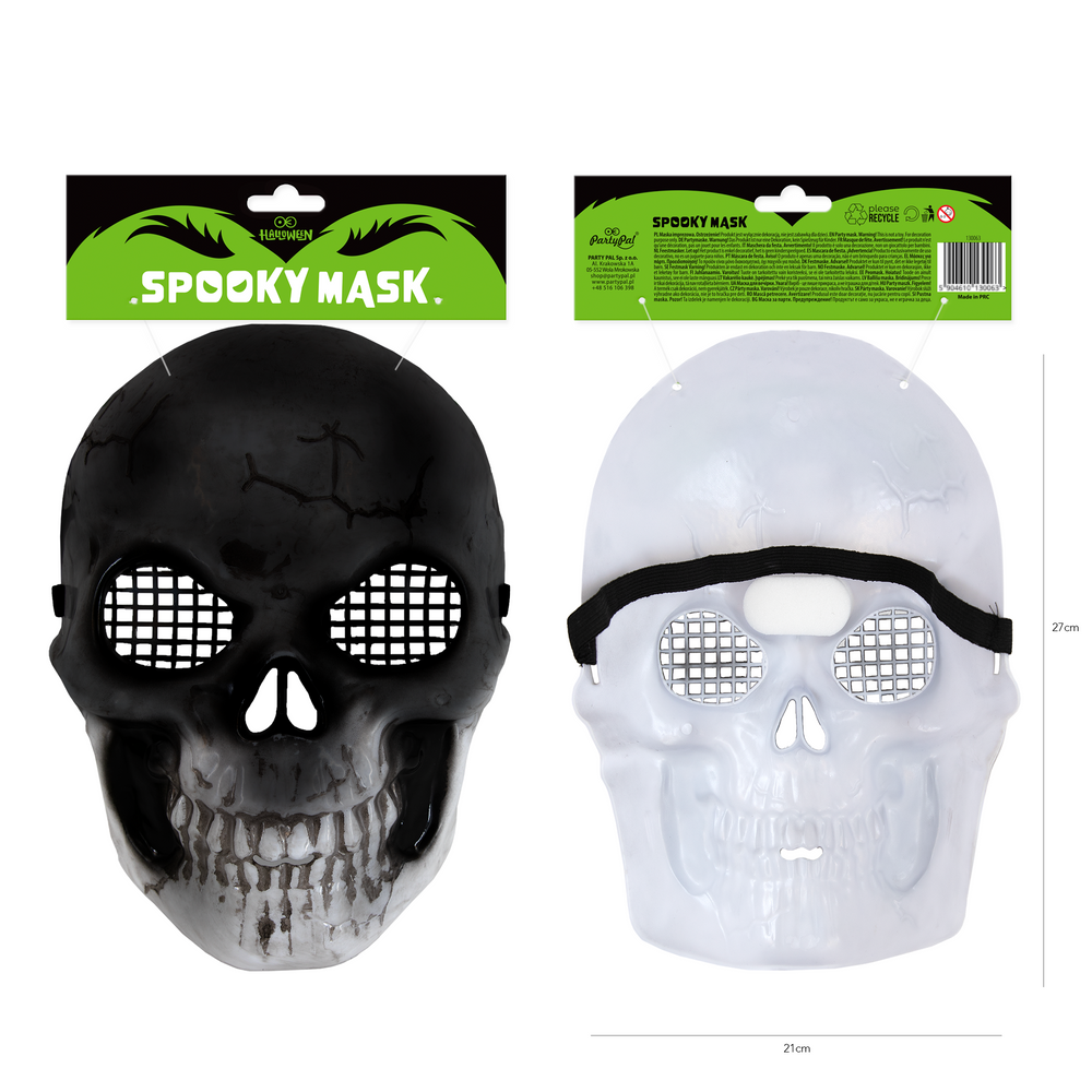 Idealna maska na Halloween, bal przebierańców czy tematyczne przedstawienia. Mocowana za pomocą elastycznej gumki, plastikowa czaszka wyposażona jest od wewnętrznej strony na wysokości czoła w miękką gąbeczkę, zwiększającą komfort użytkowania.