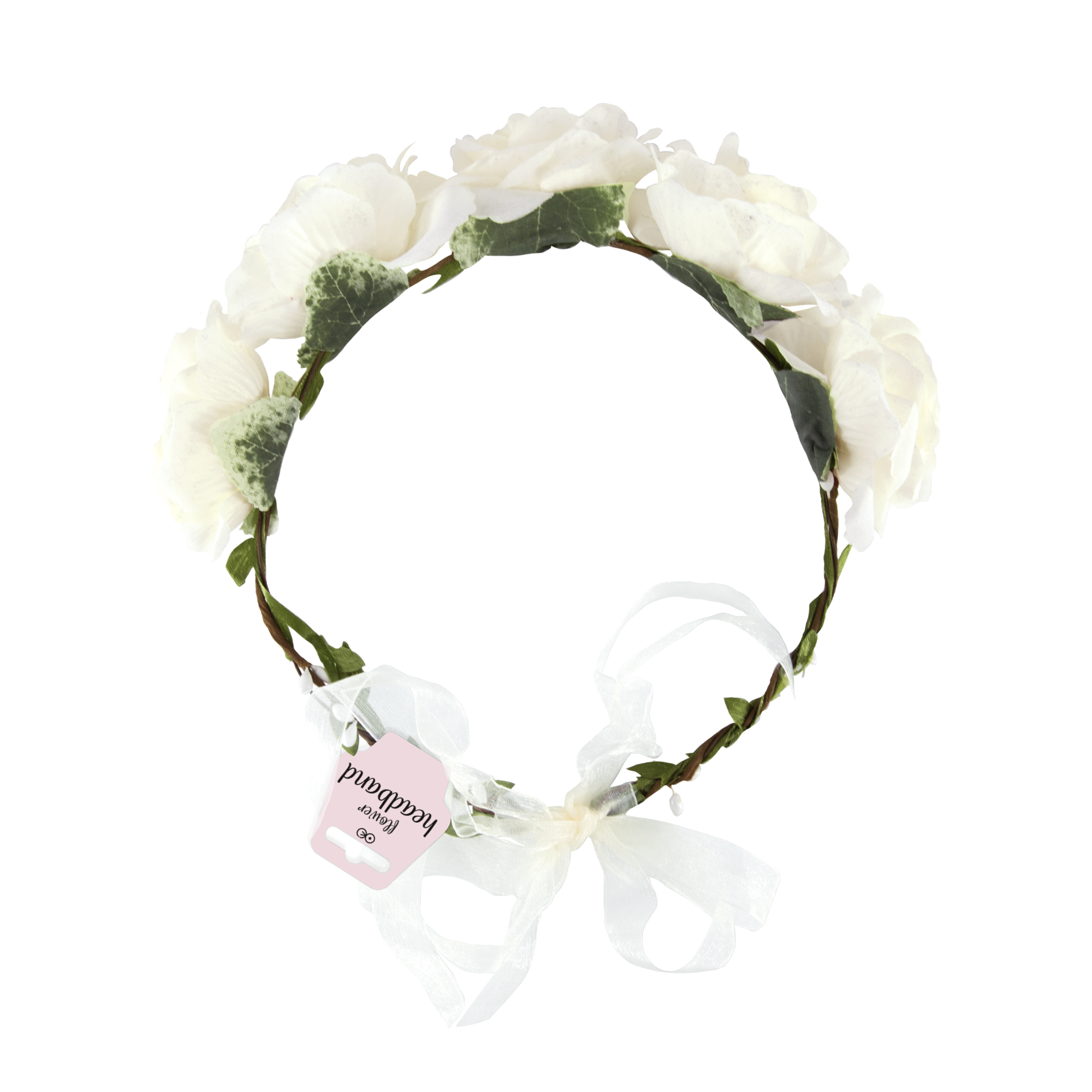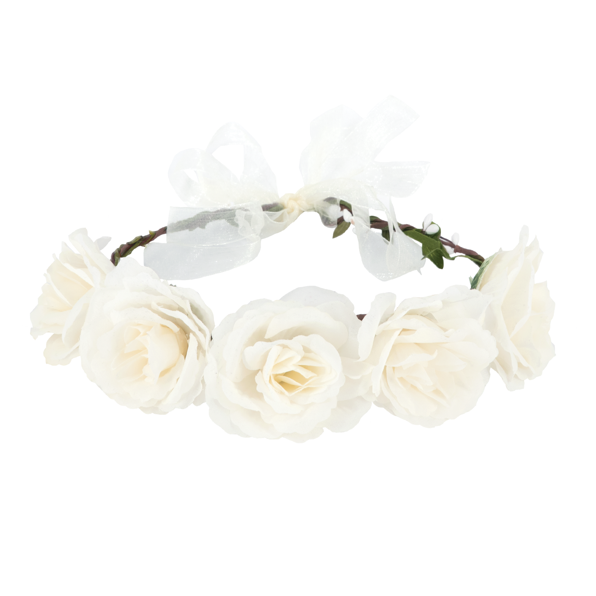 Główną ozdobą wianka jest pięć różyczek, których biel podkreślają delikatne zielone listeczki rozmieszczone na całym obwodzie. Dzięki regulowanemu rozmiarowi, wianek może upiększyć głowy dziewcząt w różnym wieku.