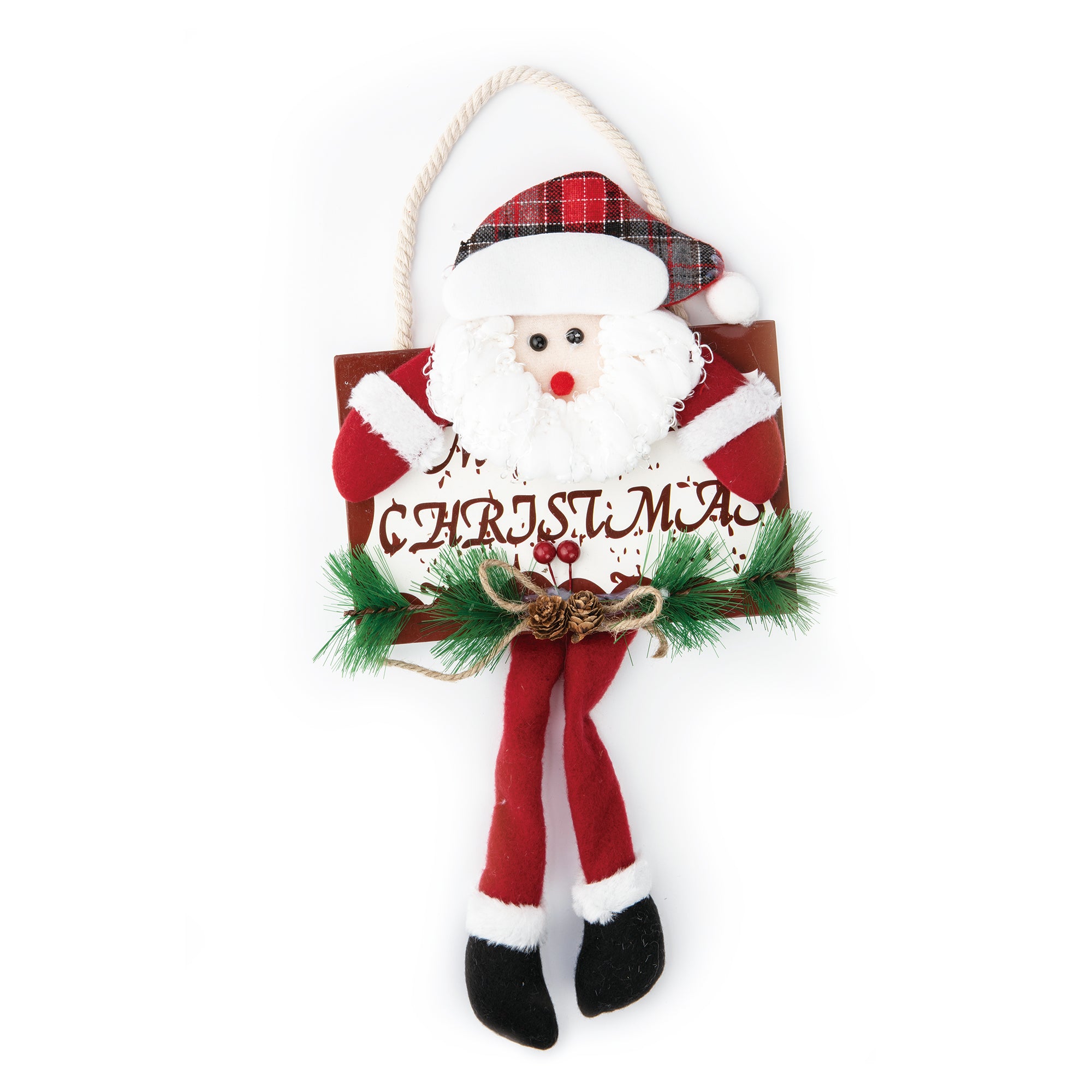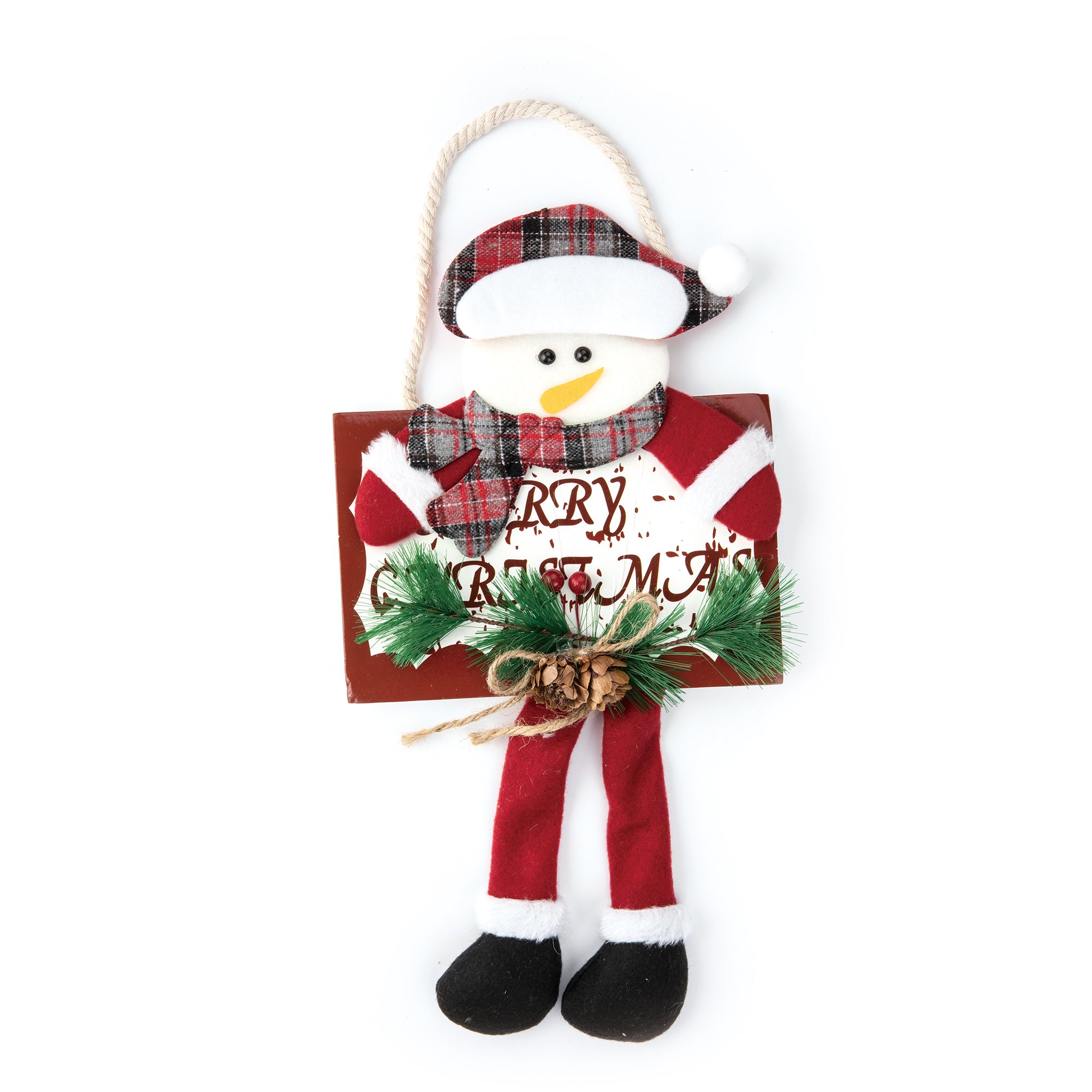 Zawieszki świąteczne w klimacie rustykalnym z tabliczką Merry Christmas ozdobioną zielonymi gałązkami, szyszkami i kokardką ze sznureczka. Tabliczka wygląda tak, jakby była trzymana przez św. Mikołaja lub bałwanka. Obie sympatyczne postacie mają czapeczki w kratkę, czerwone spodenki i czarne buciki.