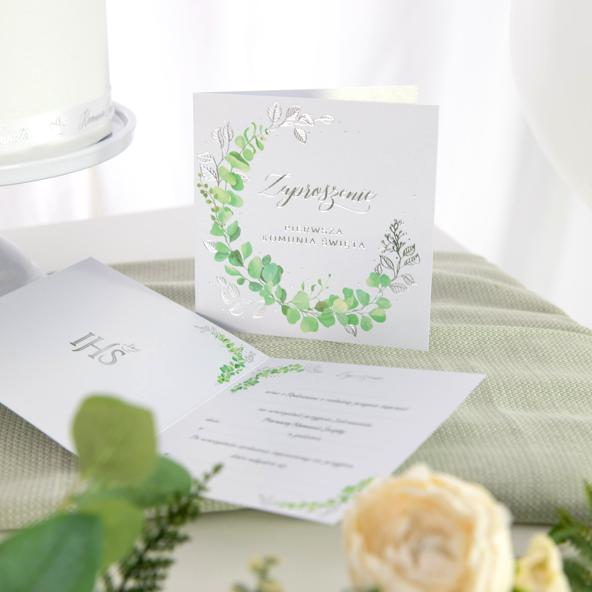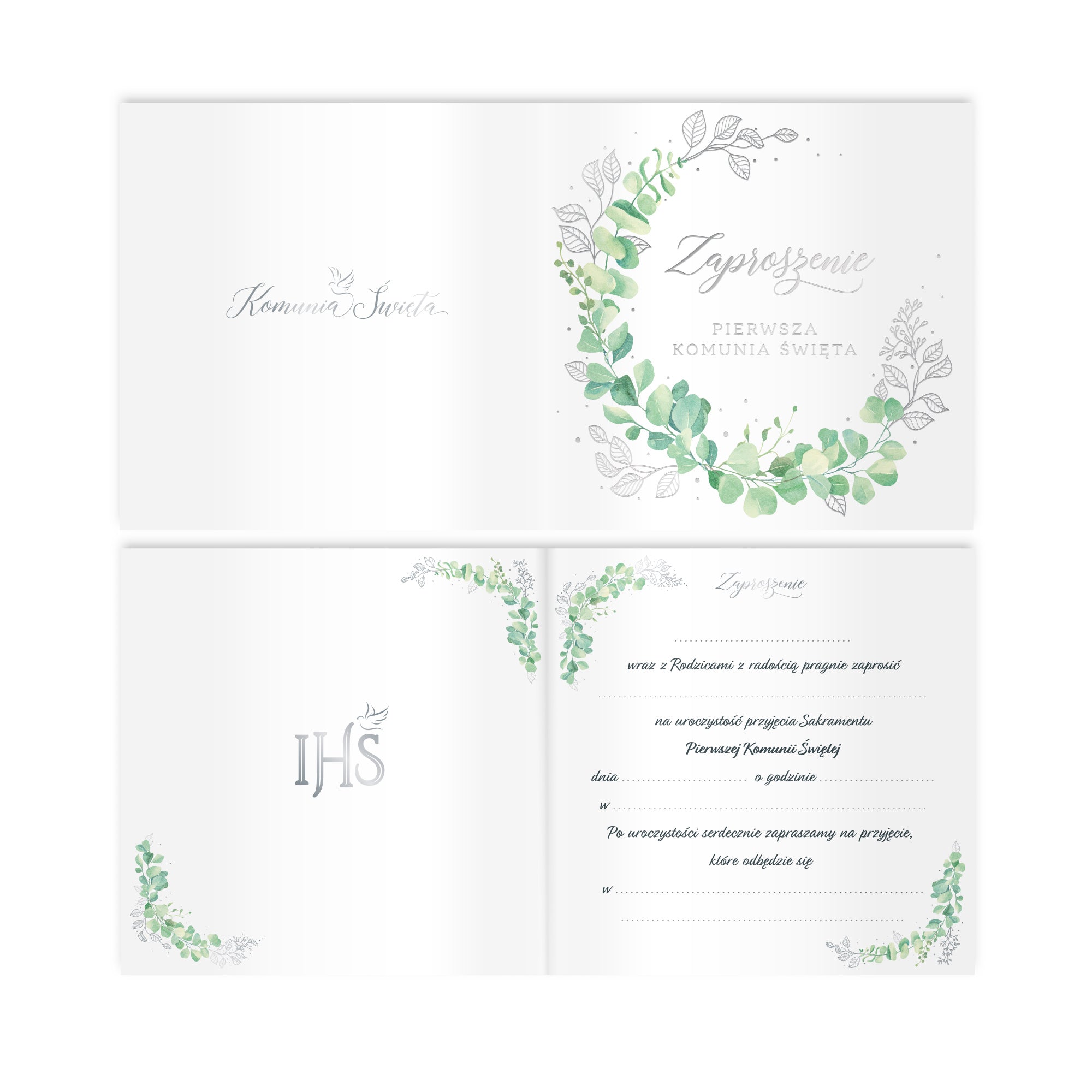 Piękne, gustowne zaproszenie na uroczystość sakramentu Pierwszej Komunii Świętej oraz przyjęcie. Na pierwszej stronie zaproszenia delikatnie błyszczy srebrny napis Zaproszenie i Pierwsza Komunia Święta oraz część srebrnych listków z gałązki otaczającej napisy. Pozostałe, zielone listki na wianuszku pięknie podkreślają srebrny kolor na motywie.