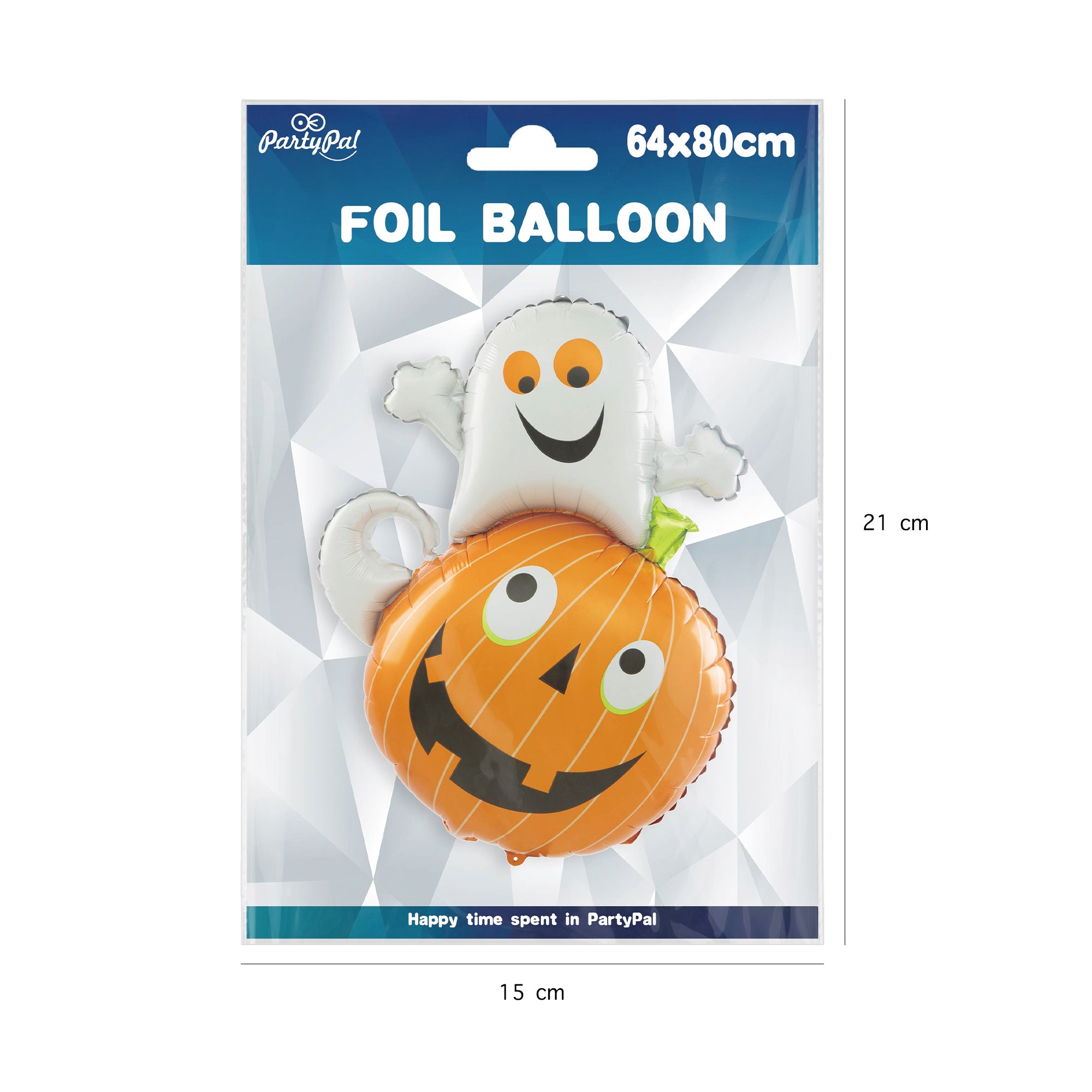 Roześmiane i sympatyczne postacie pomarańczowej dyni i białego duszka. Ten foliowy balon będzie idealnym elementem wystroju w Halloween. Sprawi dużo radości najmłodszym dzieciom.