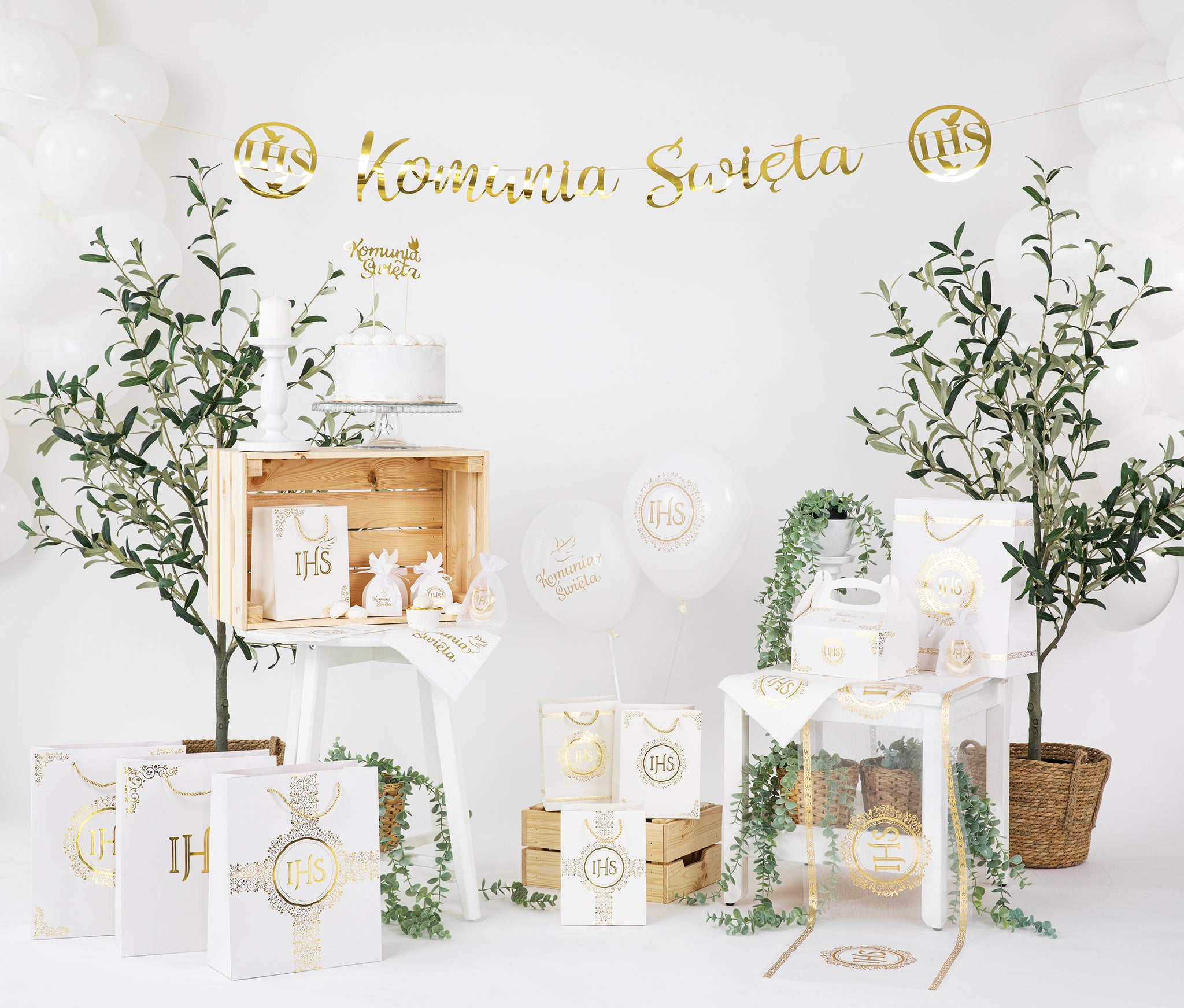 Elegancki, papierowy baner na komunię składa się z czterech części: napisu Komunia Święta i dwóch symboli IHS z gołąbkami. Tradycyjny złoty kolor oraz finezyjna czcionka napisu, podkreślą wagę tego istotnego wydarzenia.