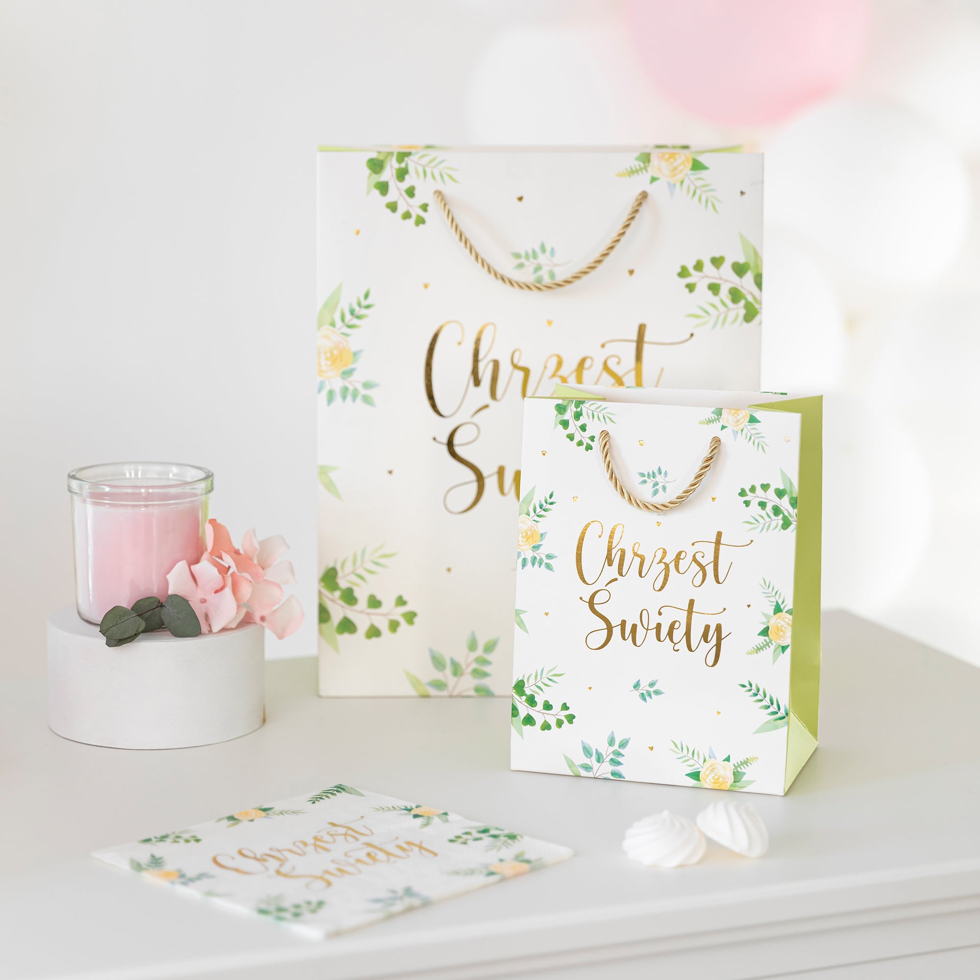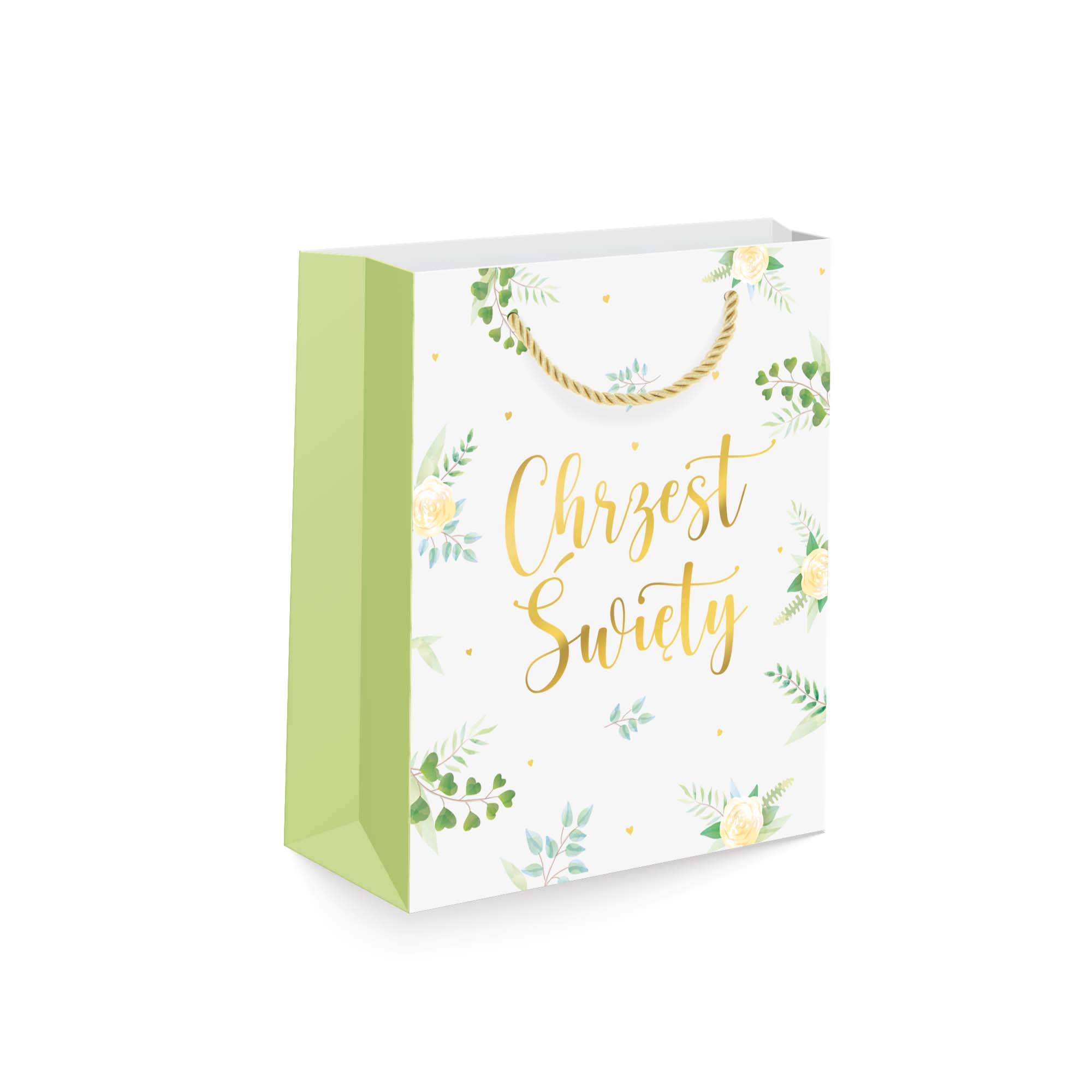 Idealne na prezenty torebki z okazji chrztu świętego . Delikatna zieleń gałązek i boków torebki doskonale współgra ze złotym napisem i maleńkimi złotymi serduszkami. Całości dopełniają małe kremowe różyczki. bardzo eleganckie a zarazem subtelne opakowanie prezentowe.