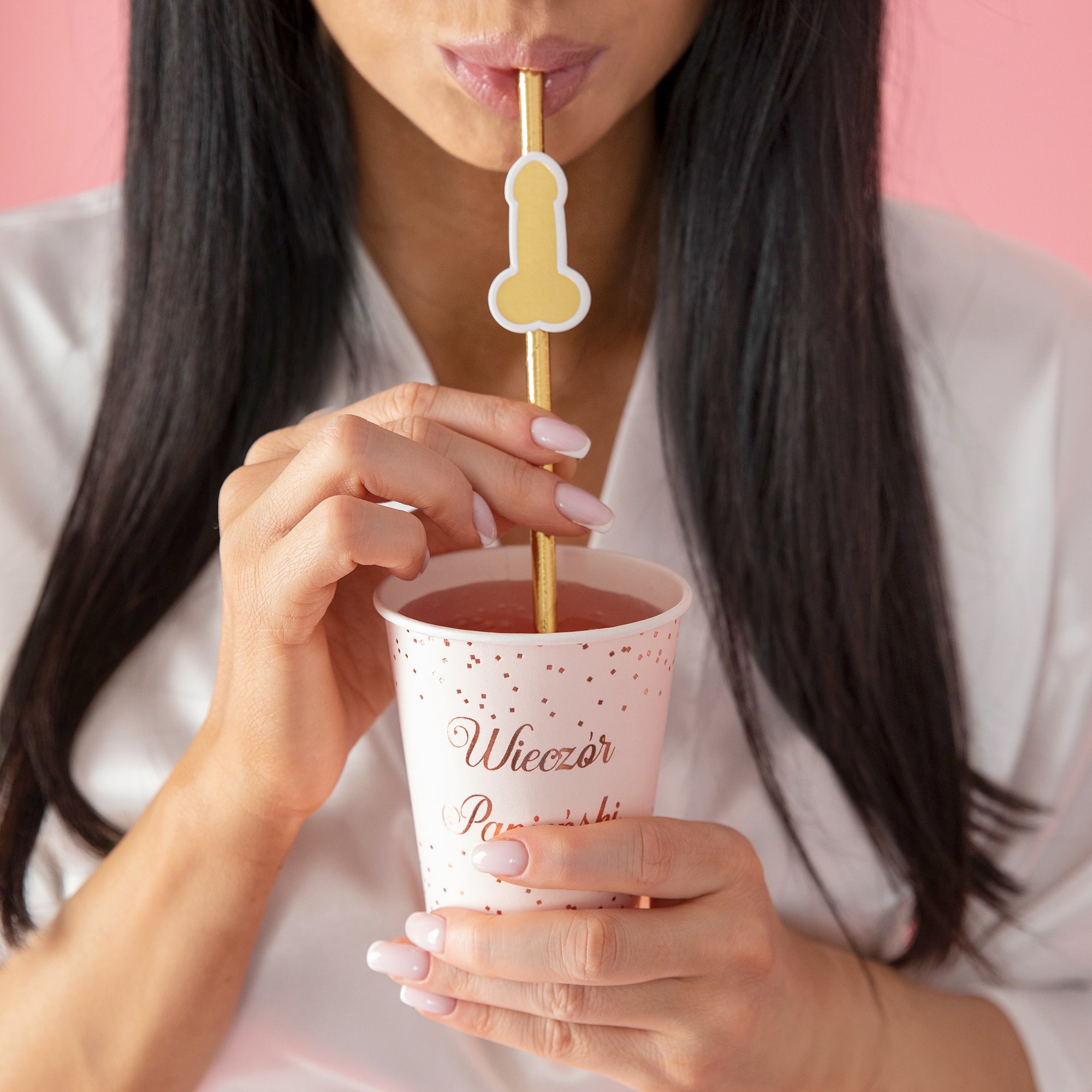 Modelka pijąca przez złotą słomkę z ozdobnym peniskiem