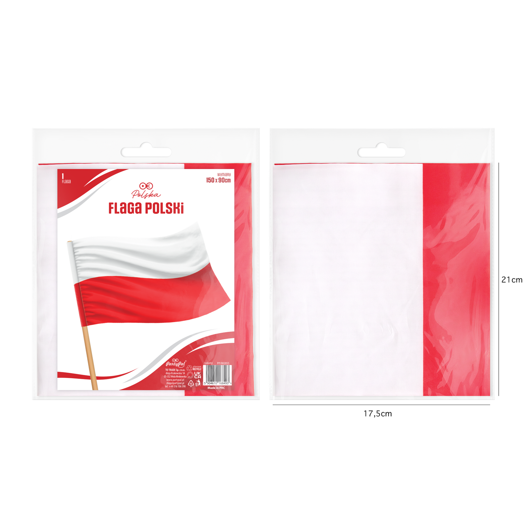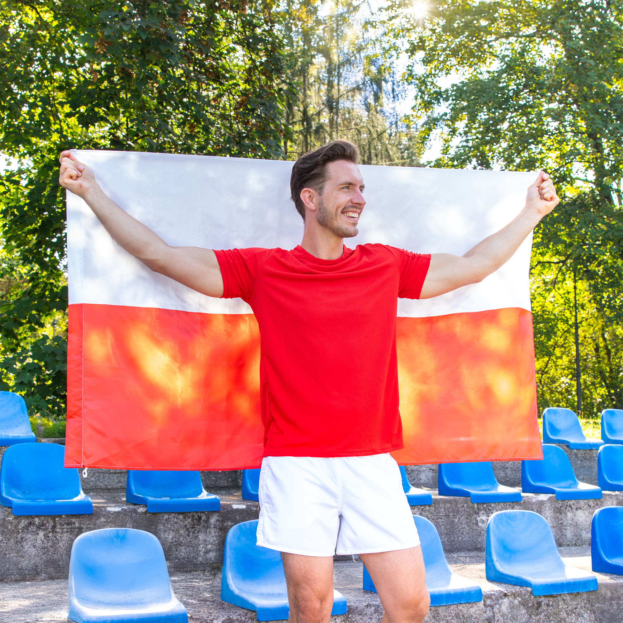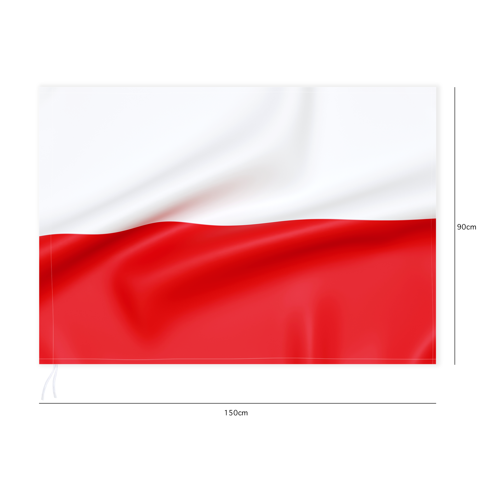 Flaga Polski wykonana z poliestru, idealna podczas świąt narodowcyh. Doskonała na imprezy sportowe, stadiony.