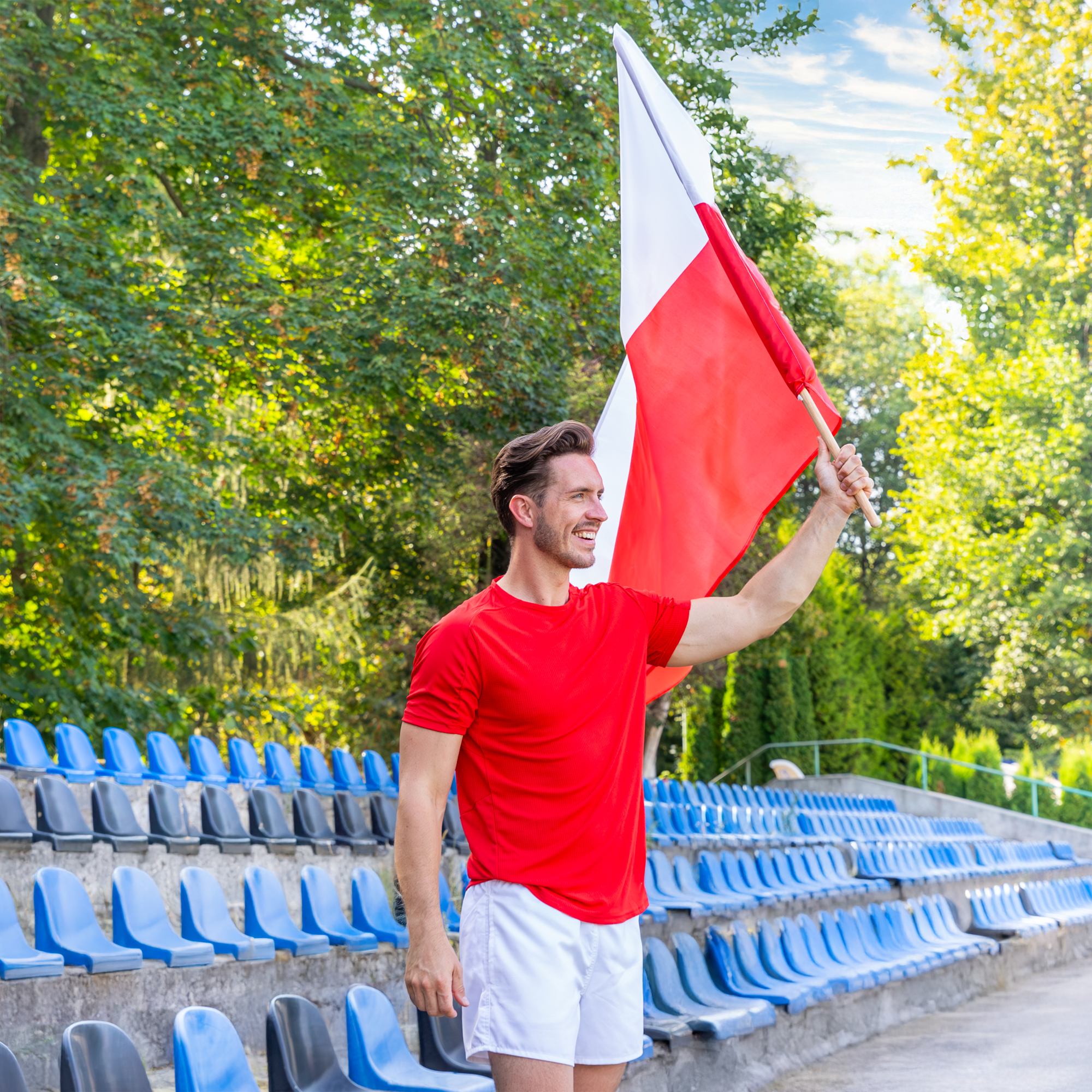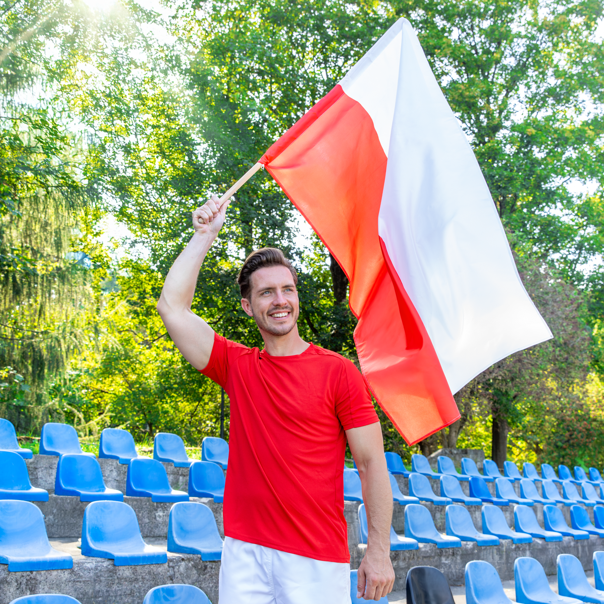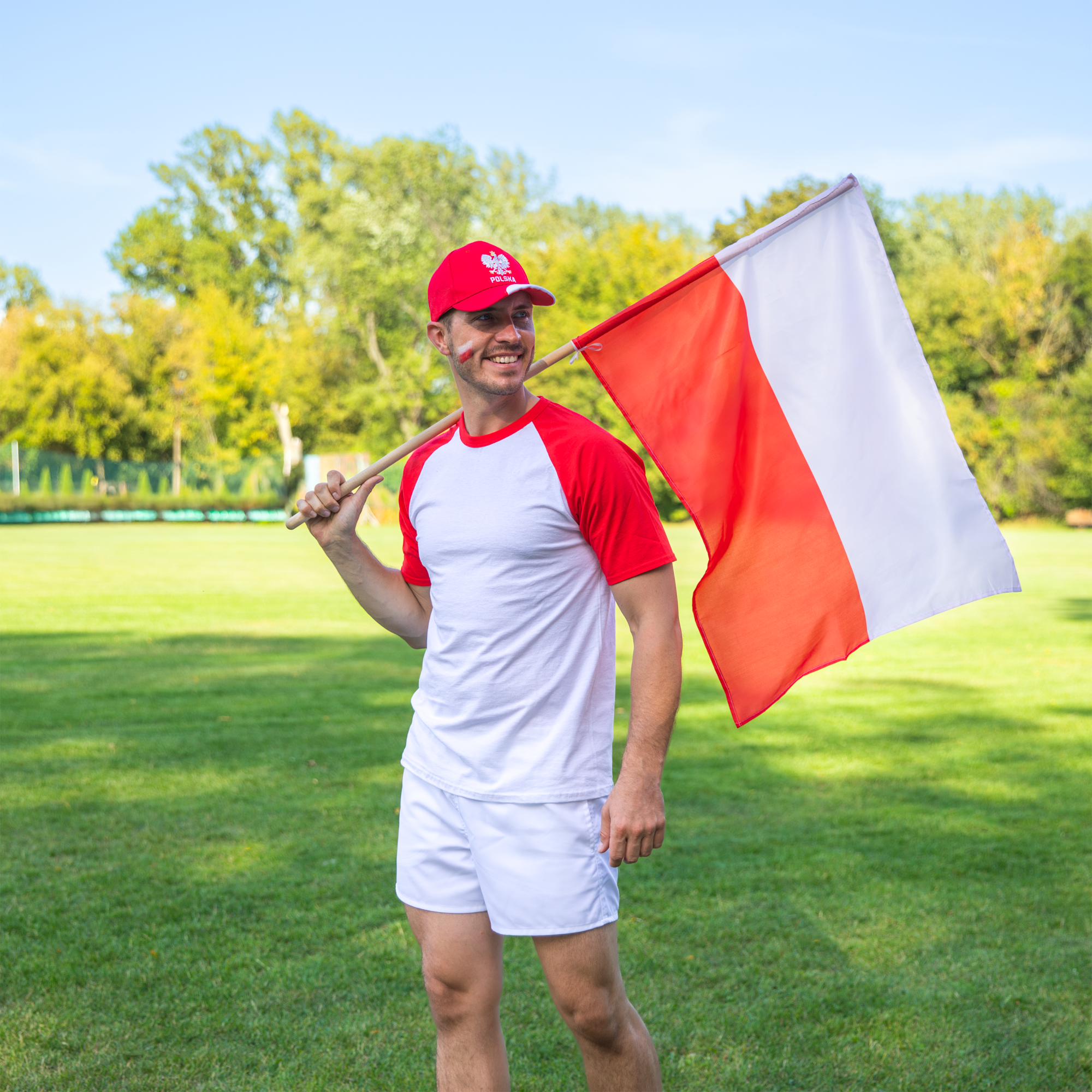 Flaga Polski wykonana z poliestru, idealna podczas świąt narodowcyh. Doskonała na imprezy sportowe, stadiony.
