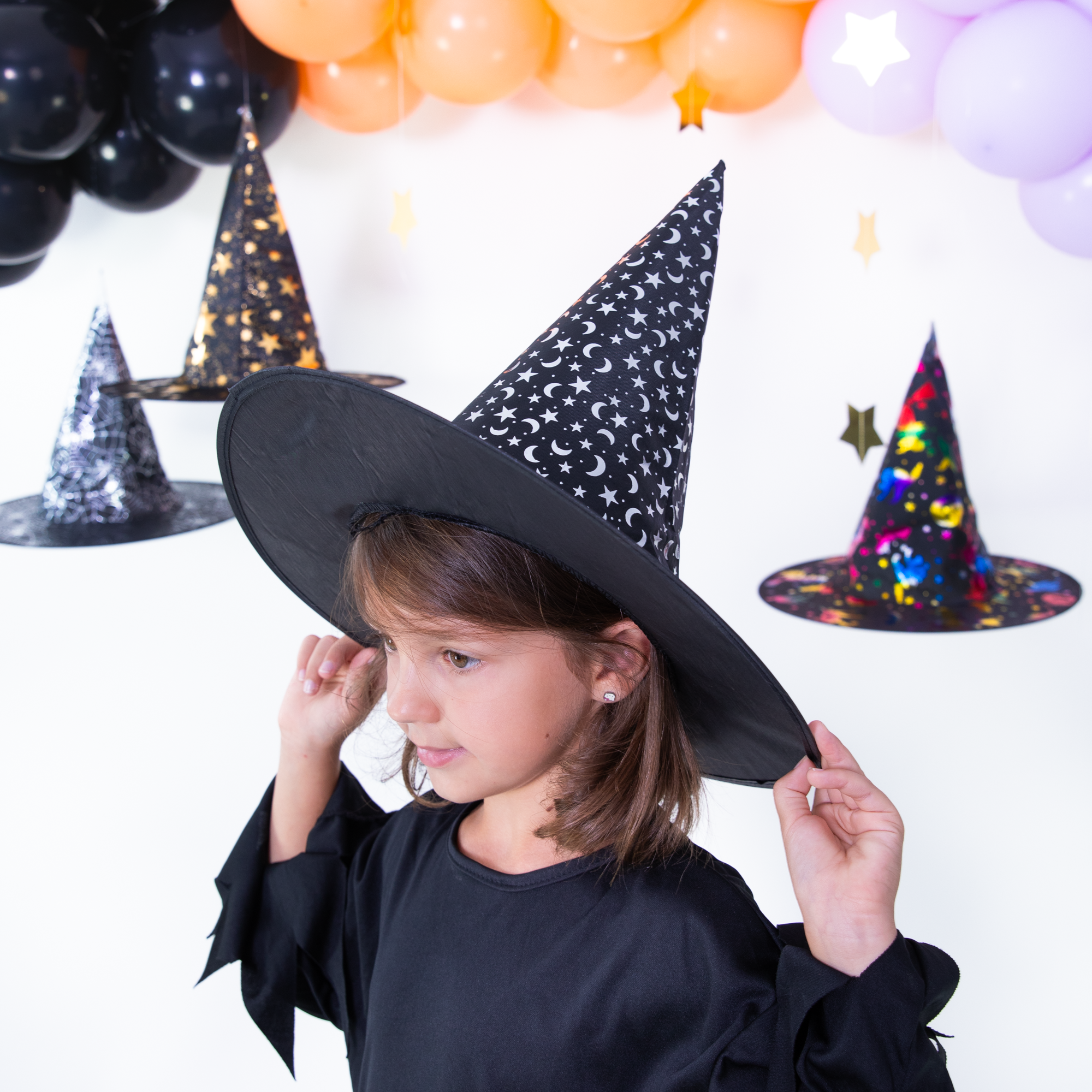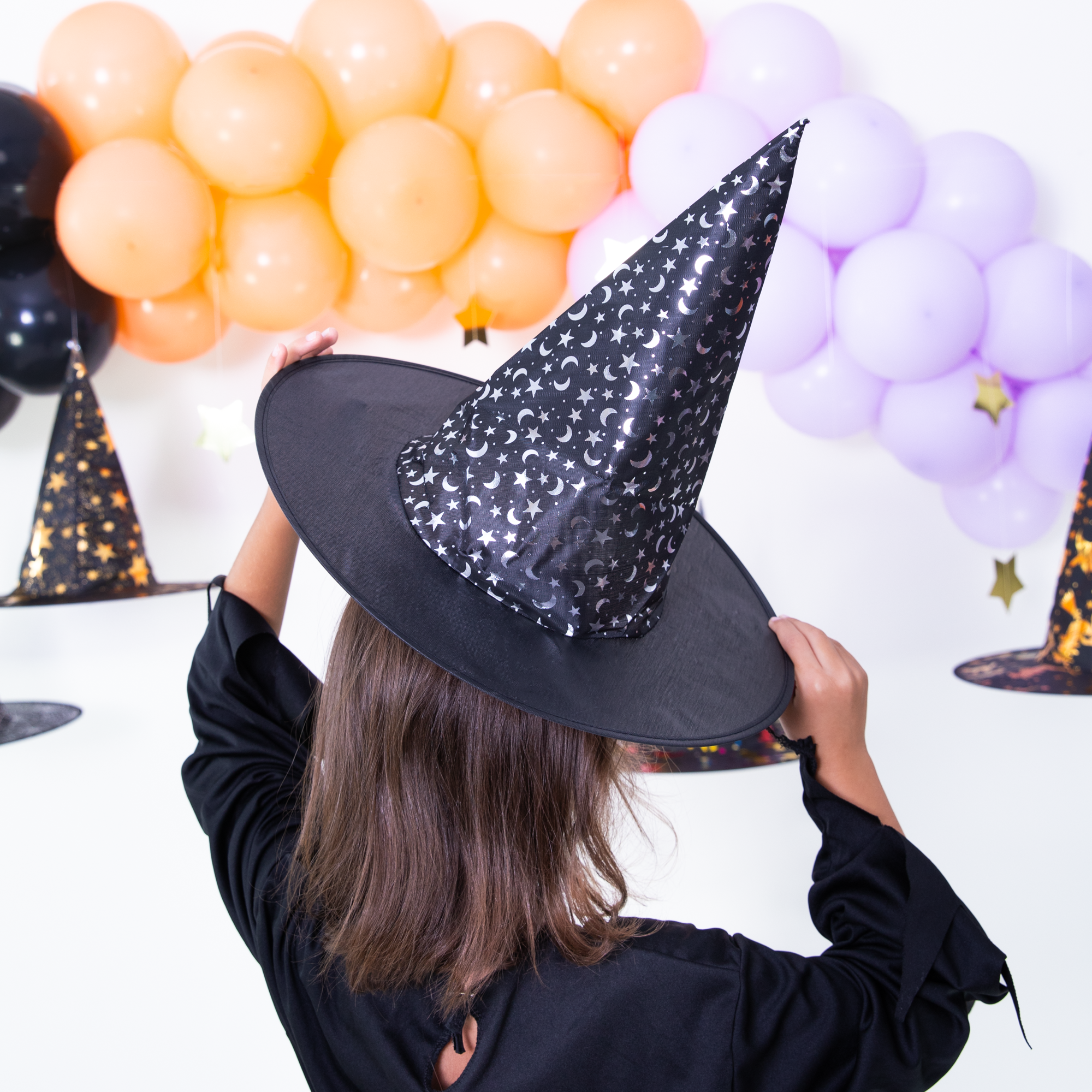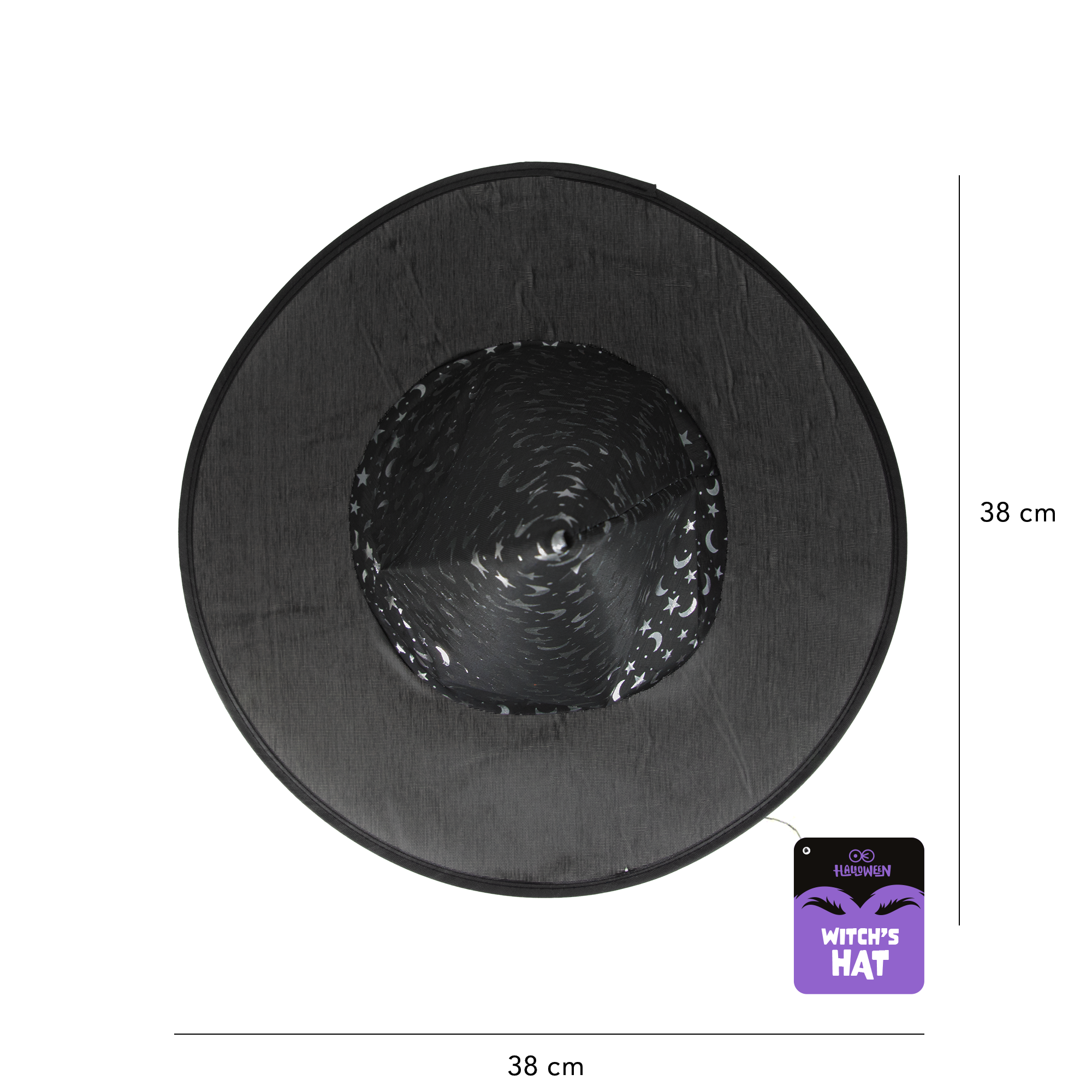 Wspaniały dodatek do przebrania na Halloween, zabawę karnawałową lub inne okazje, gdzie można wykazać się kreatywnością. Kapelusz wiedźmy, lub innej magicznej osoby, wykonany jest z delikatnego czarnego materiału. Gładkie rondo podkreśla srebrny, połyskujący wzór w górnej części kapelusza składający się z księżyców i gwiazdek.