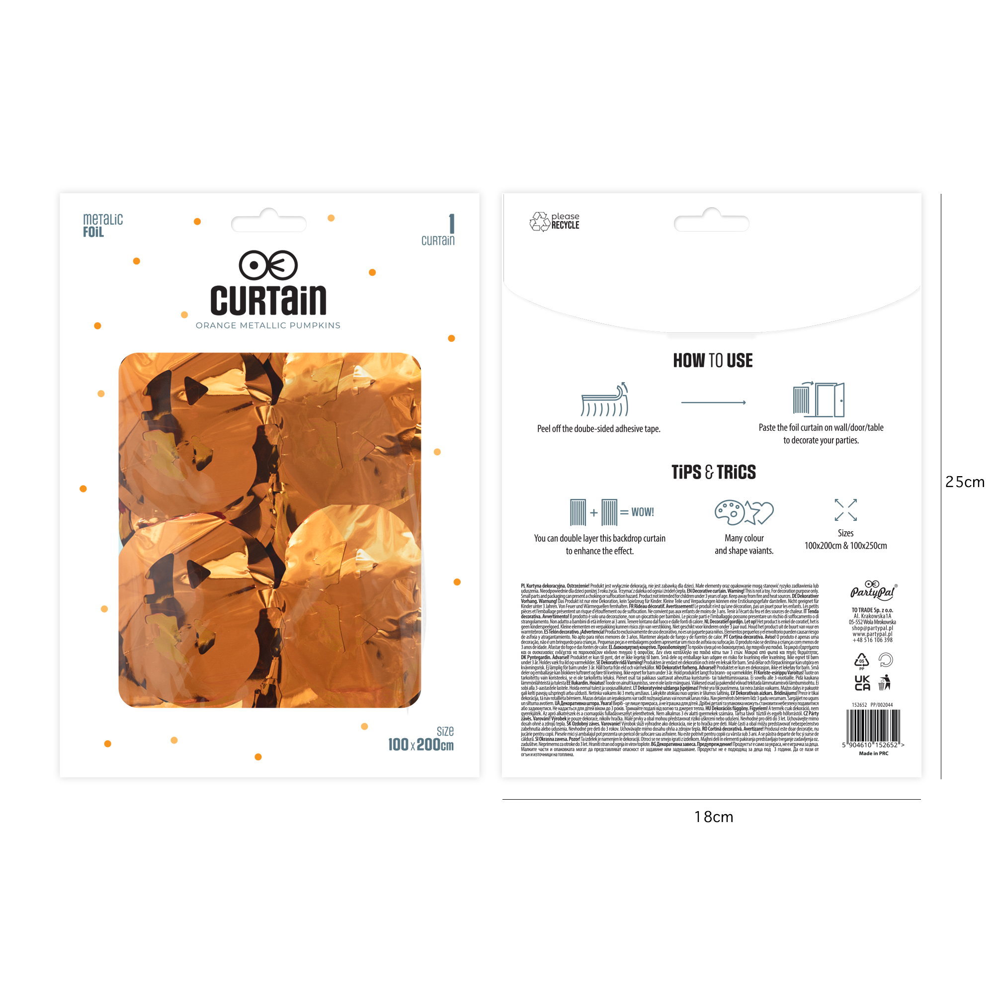 Kurtyna imprezowa Dynie wykonana została z pomarańczowej błyszczącej folii. Będzie wyróżniającym się elementem kompozycji udekorowanych na Halloween wnętrz.