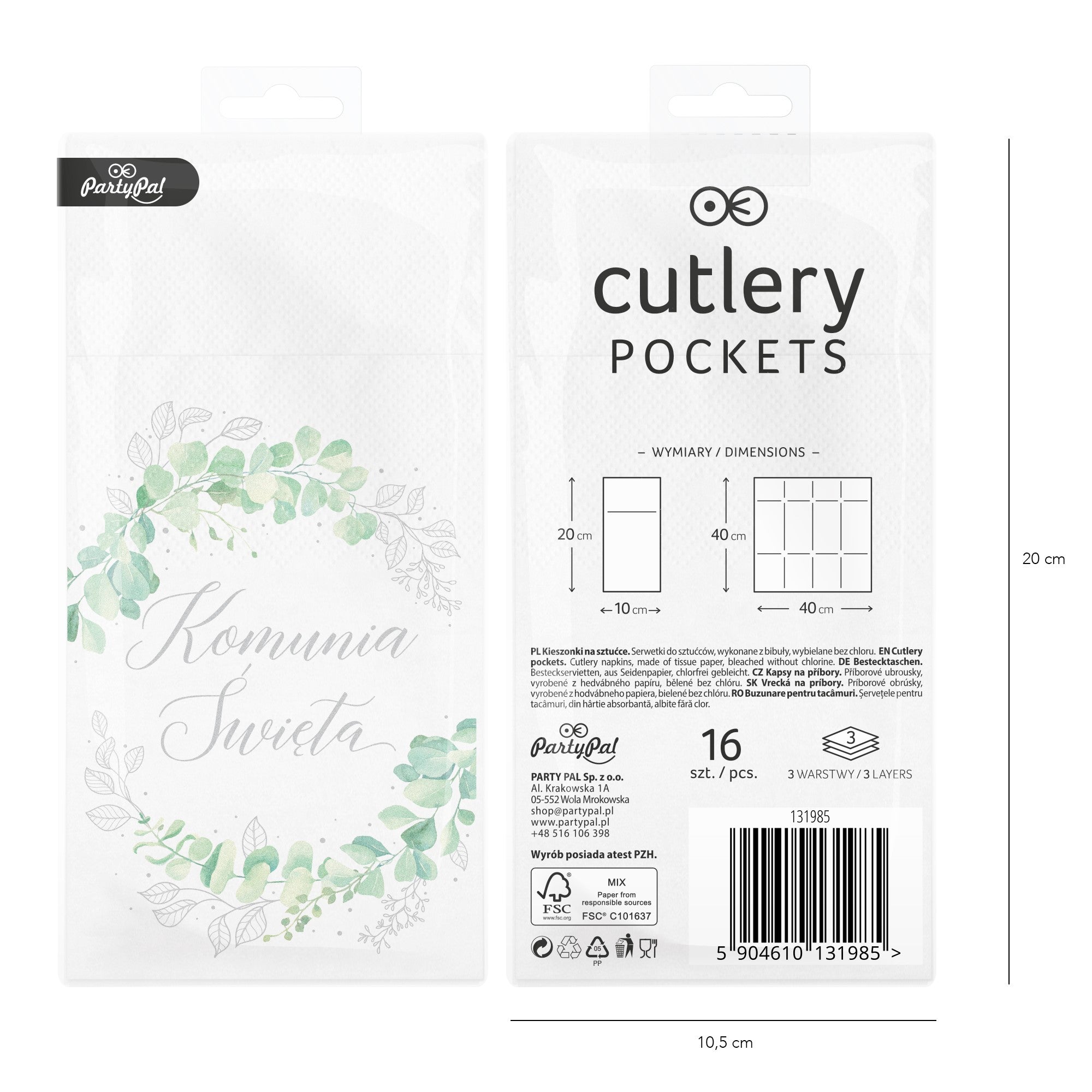 Kieszonki na sztućce Komunia Święta Eukaliptus srebrny 16szt.