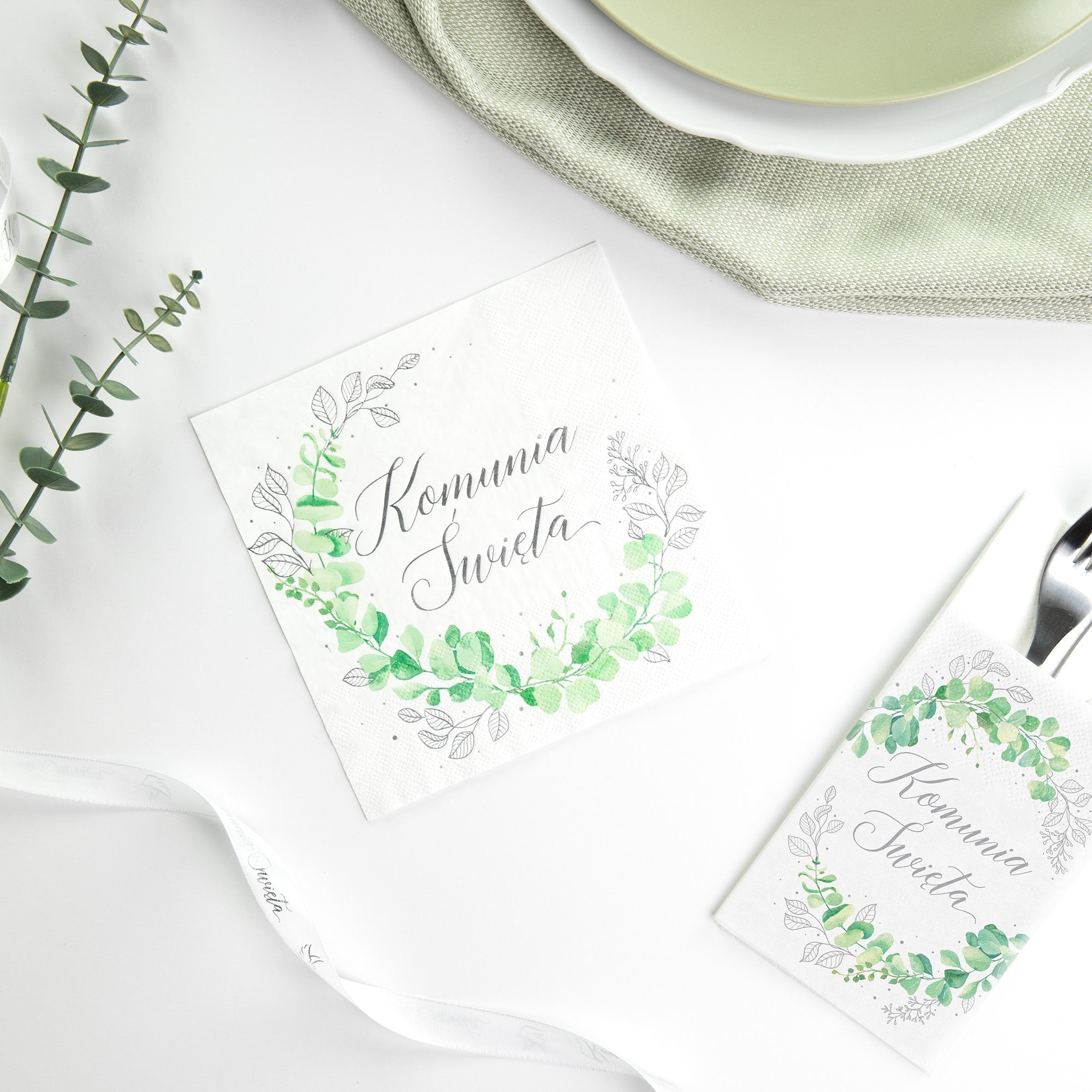 Serwetka i kieszonka na sztućce z kolekcji Eukaliptus srebrny na stole komunijnym