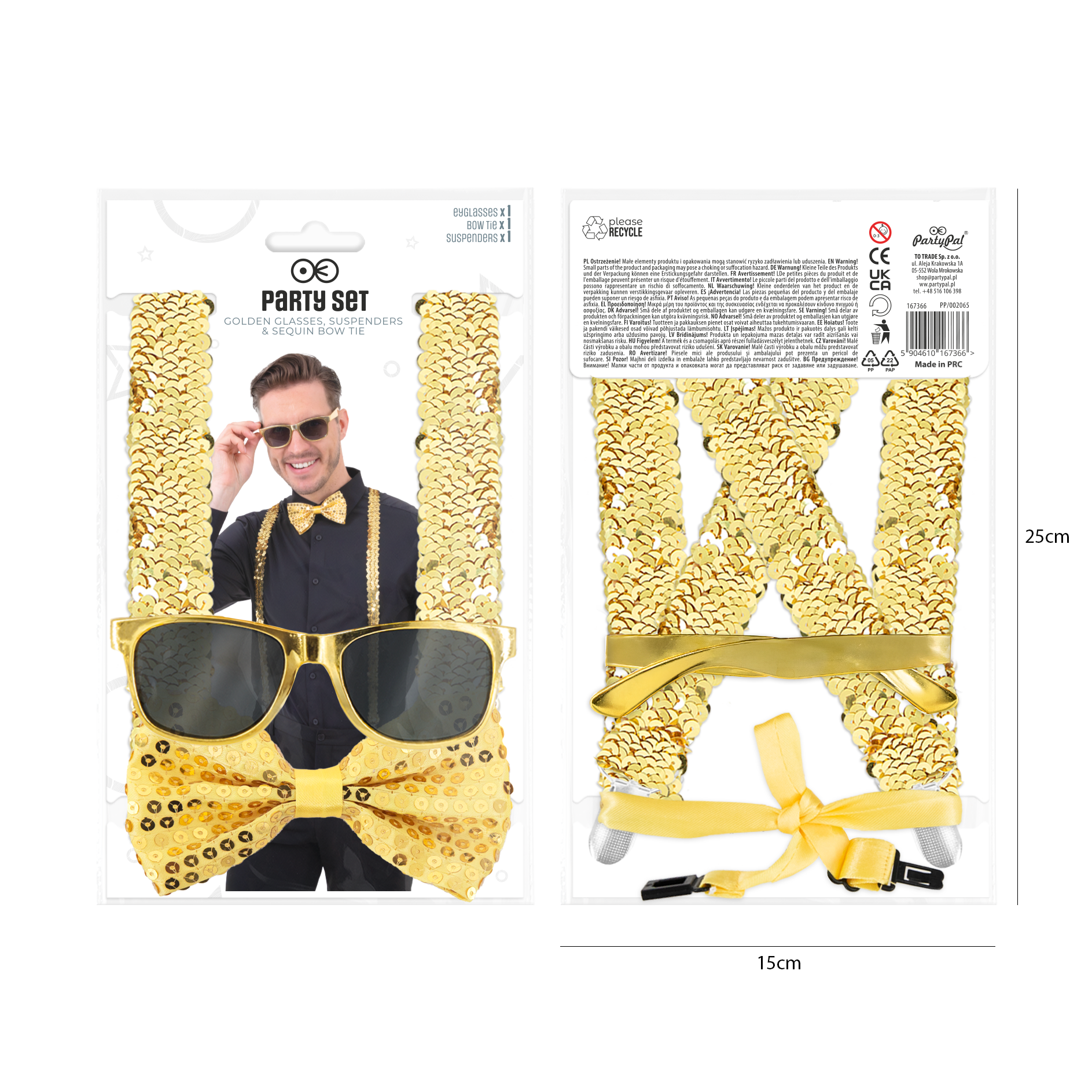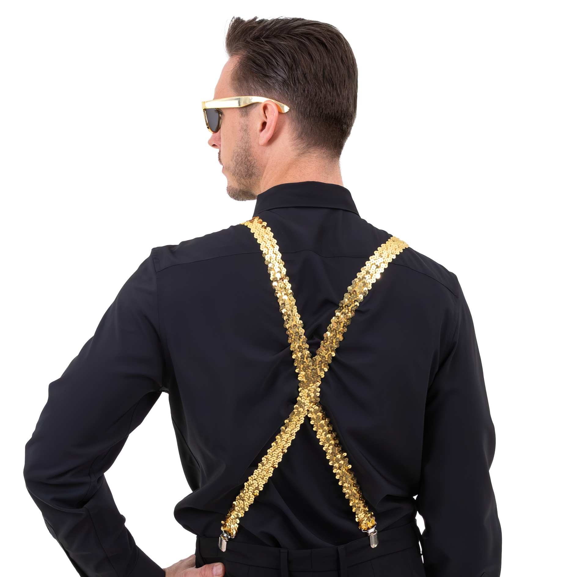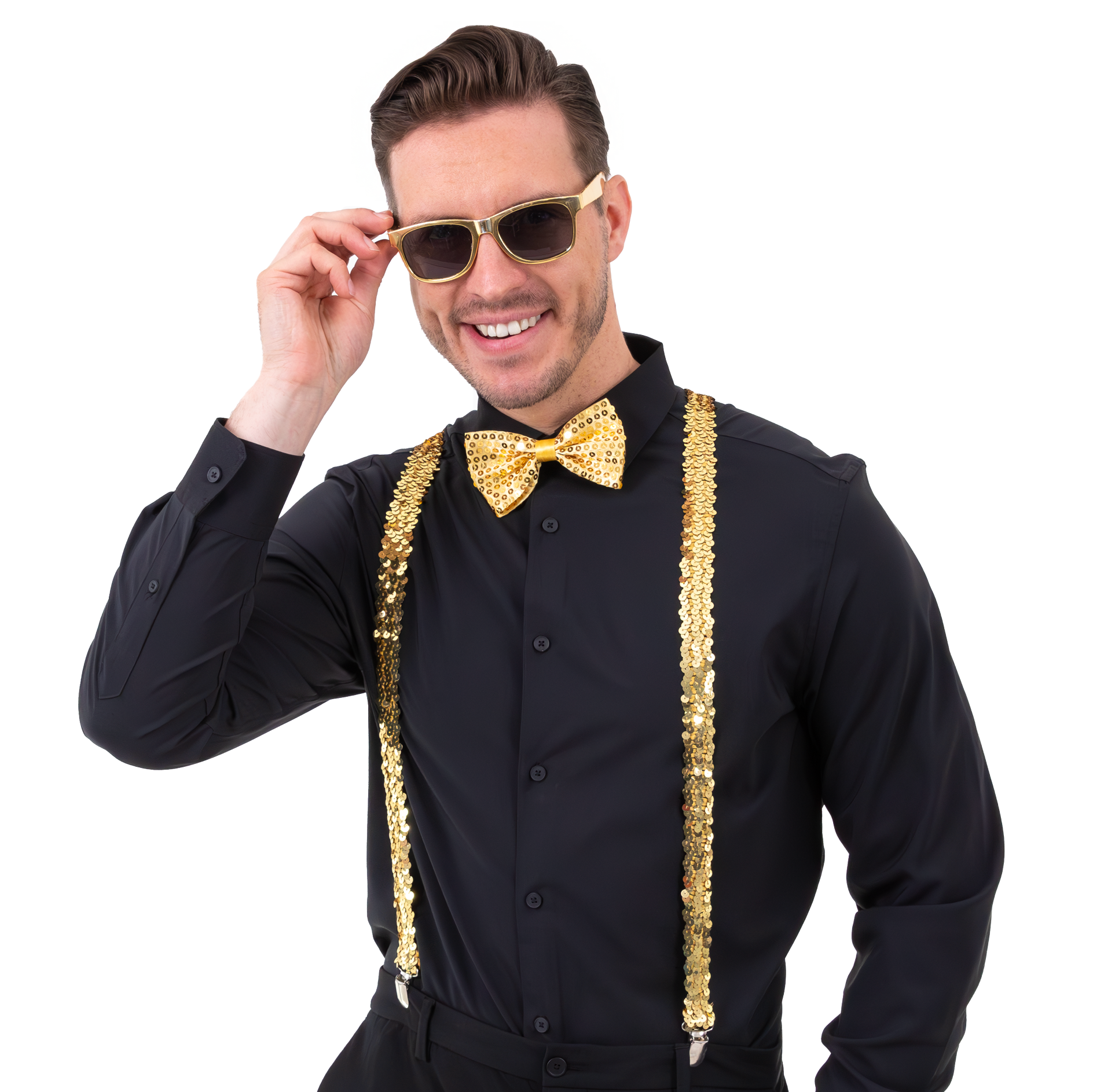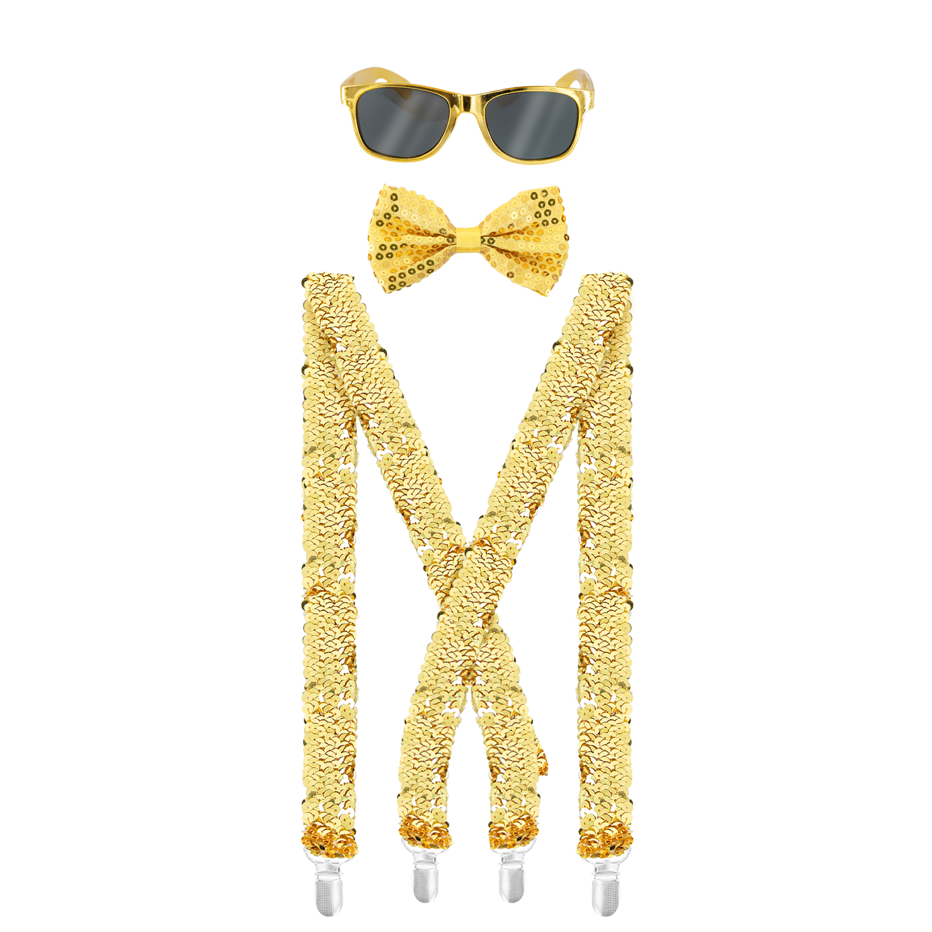 Okulary / Mucha / Szelki cekinowe złote - zestaw