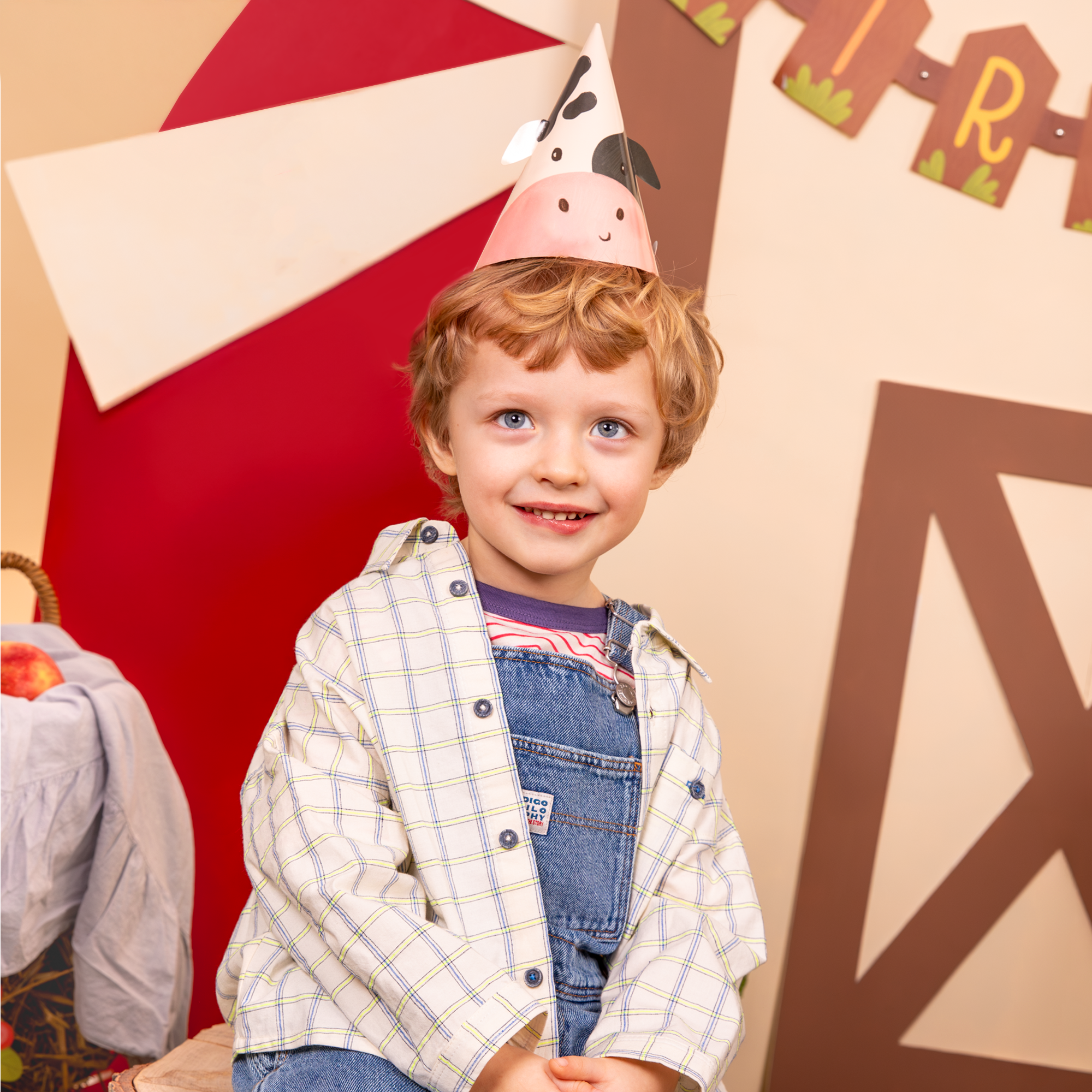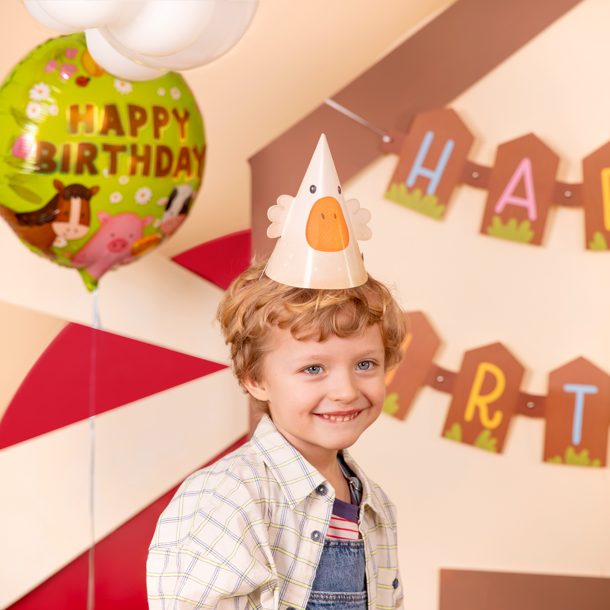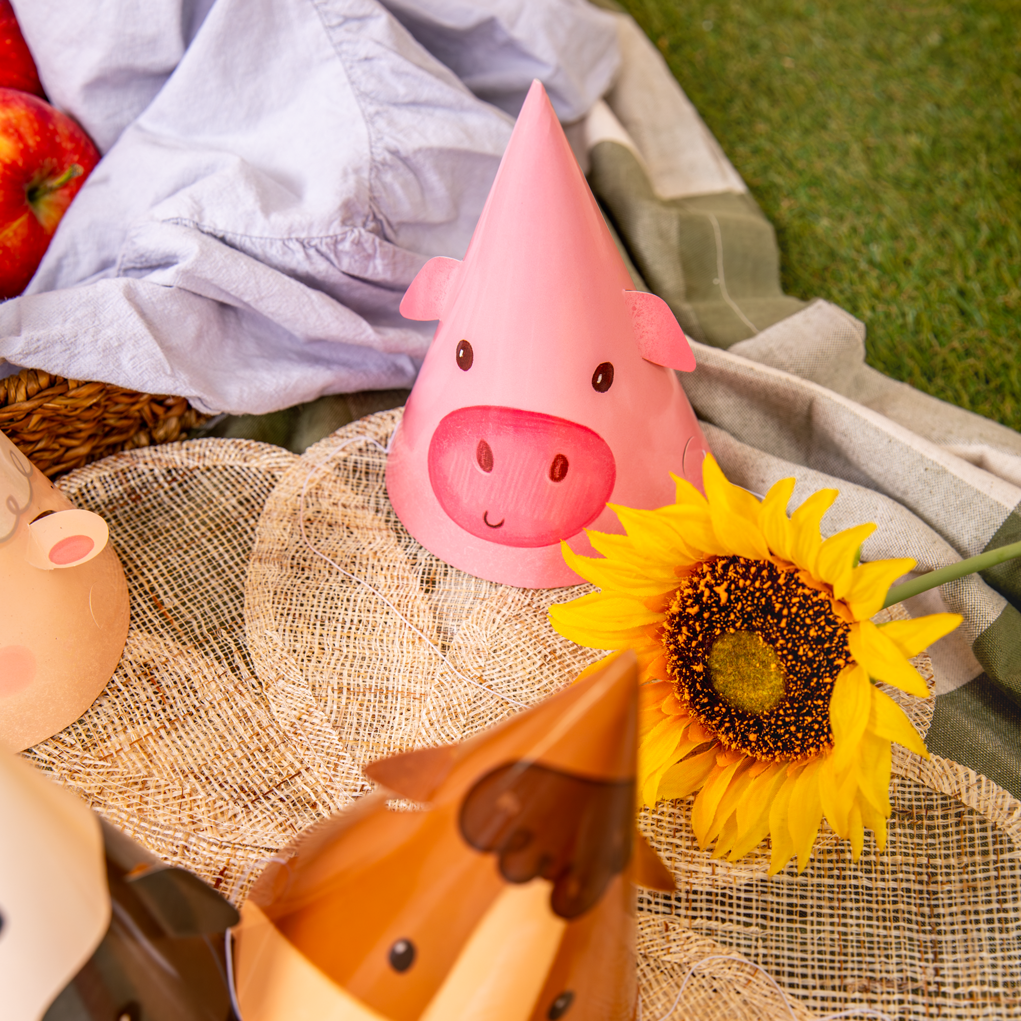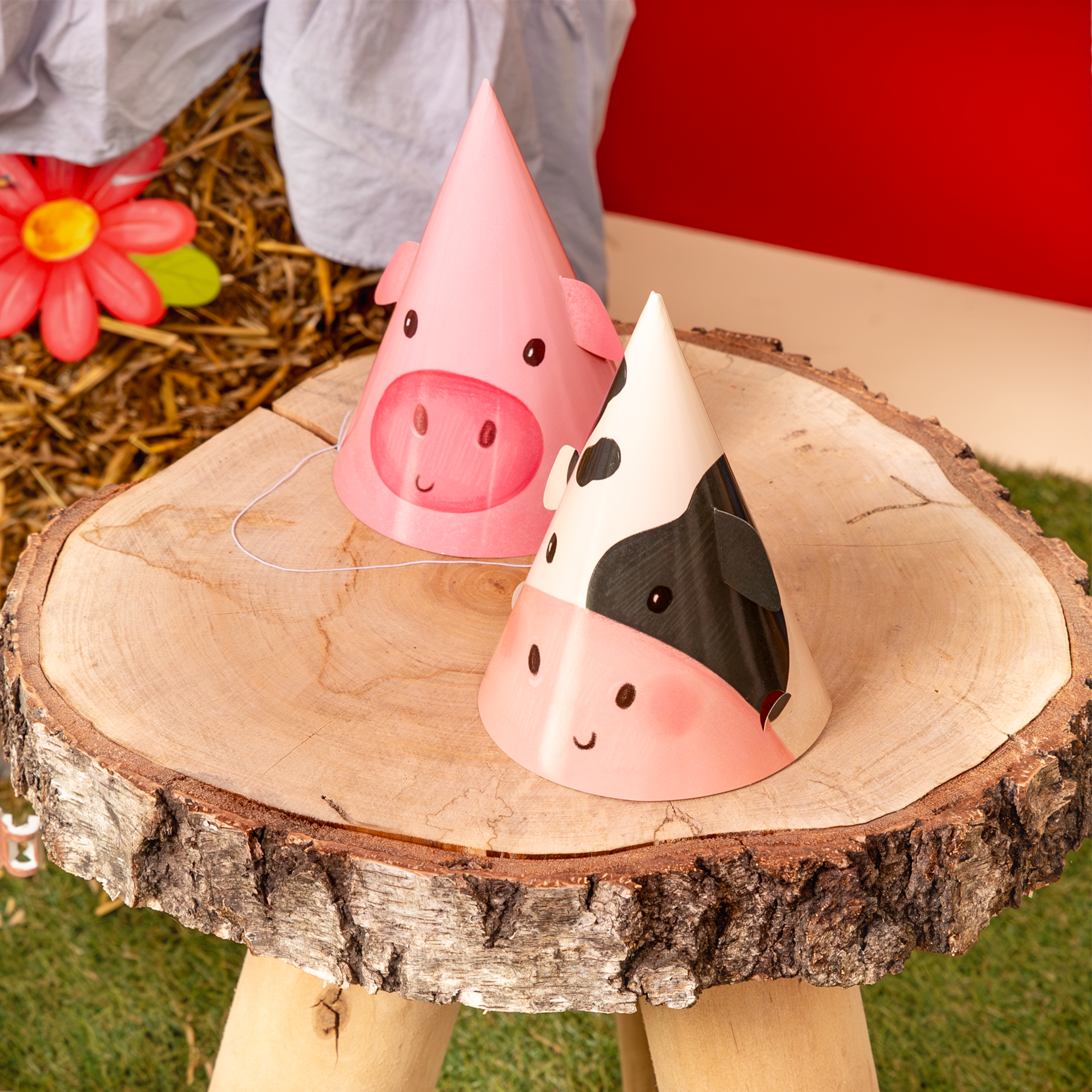 Czapeczki z nadrukiem zwierzątek z farmy: gąski, krówki, owieczki, kurki, świnki i konika.