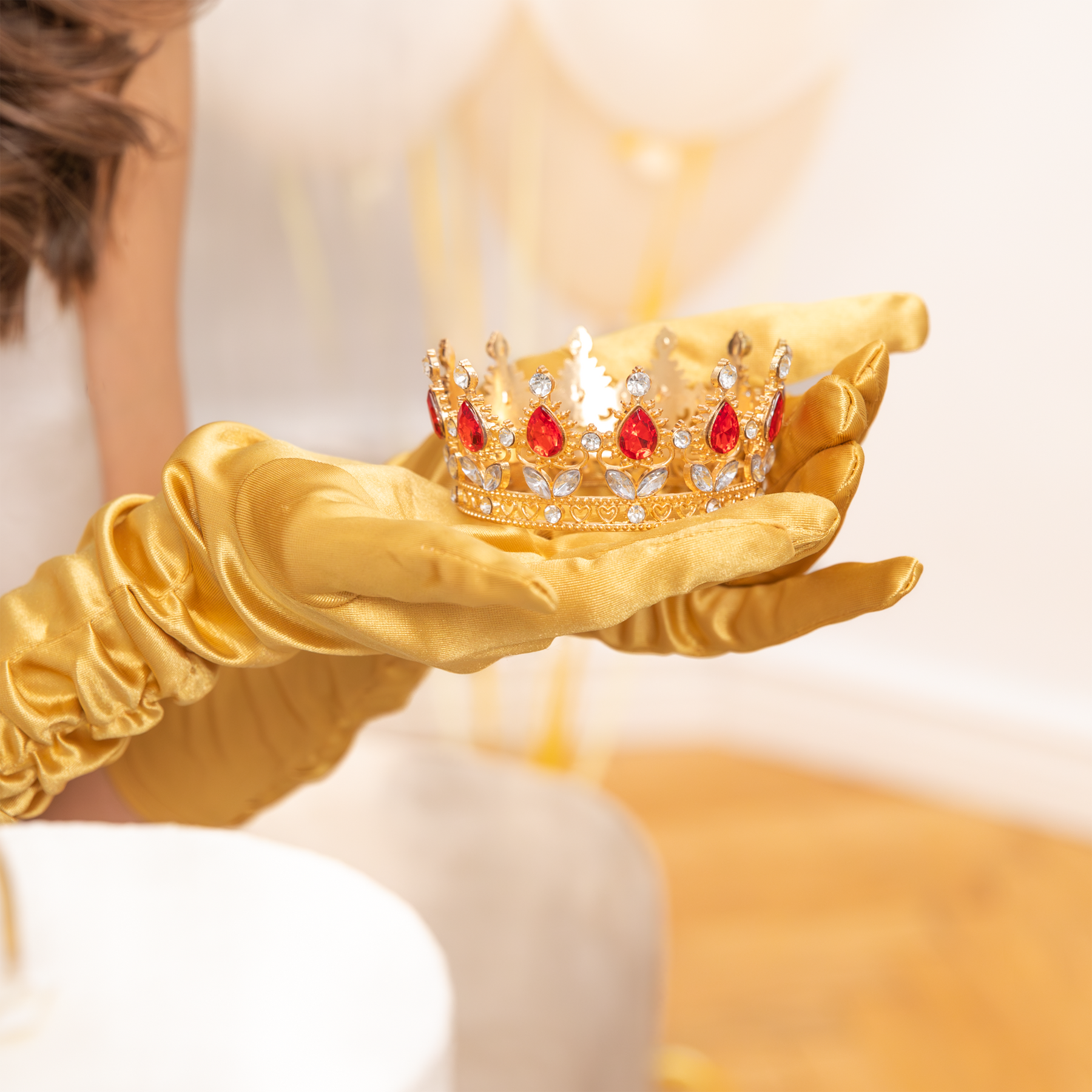 Piękna ozdoba na tort w postaci korony, idealna zarówno dla małych, jak i dużych księżniczek. Produkt wykonany z niezwykłą starannością, łączący w sobie elegancję oraz unikalny design. Korona w kolorze złotym z czerwonymi i srebrnymi kryszt.ałkami doda blasku każdemu przyjęciu, podkreślając jego wyjątkowy charakter.