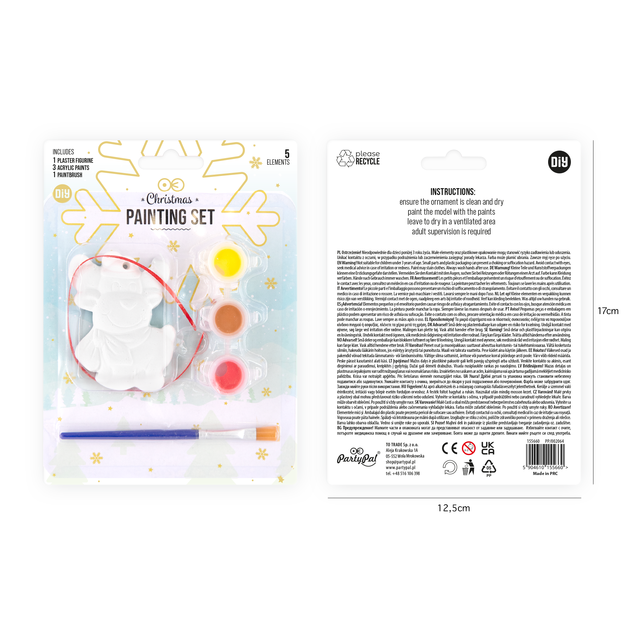 • Zestaw zawiera: gipsową figurkę, farby akrylowe - 3 kolory (brązowy, żółty, czerwony), pędzelek, czerwoną zawieszkę do samodzielnego zawiązania