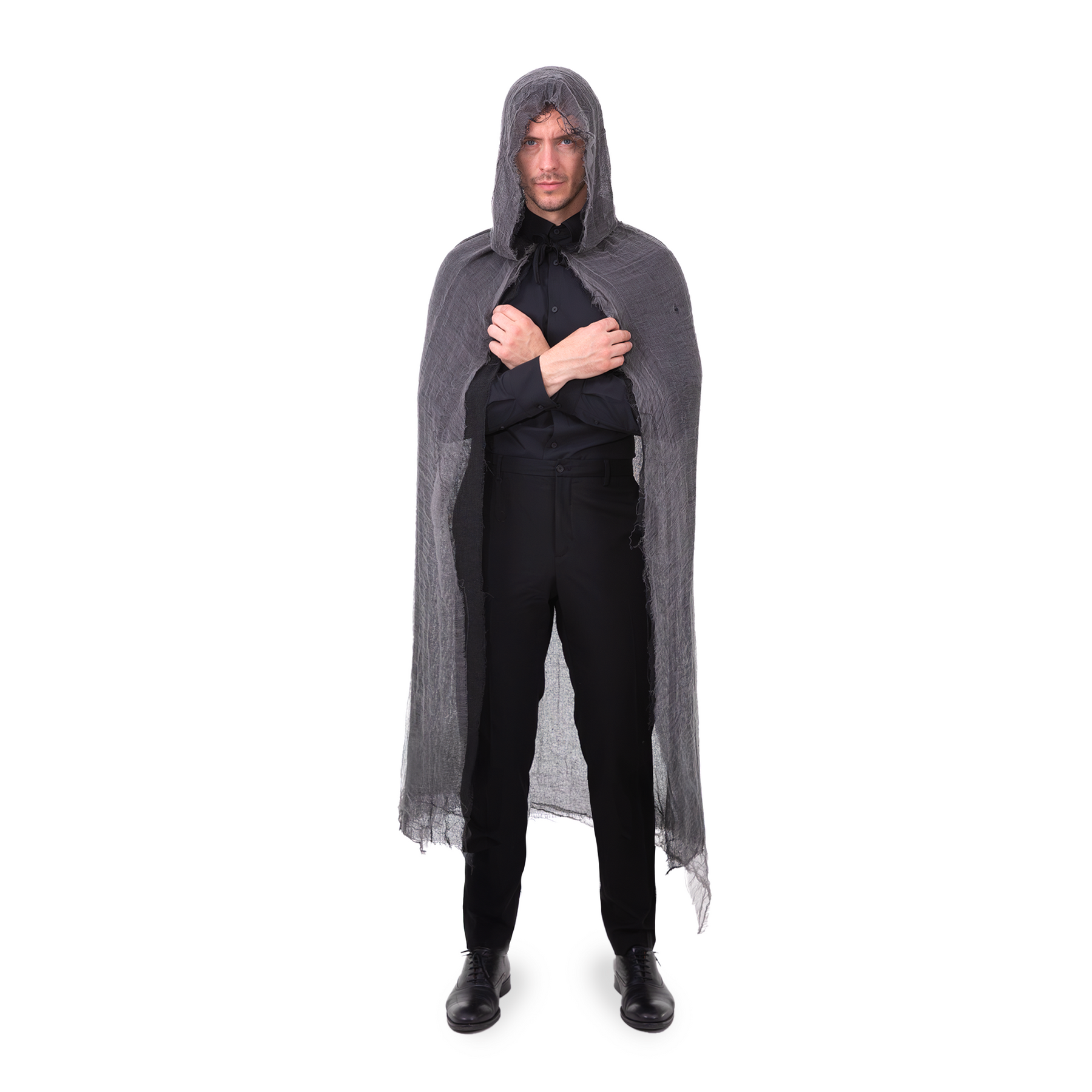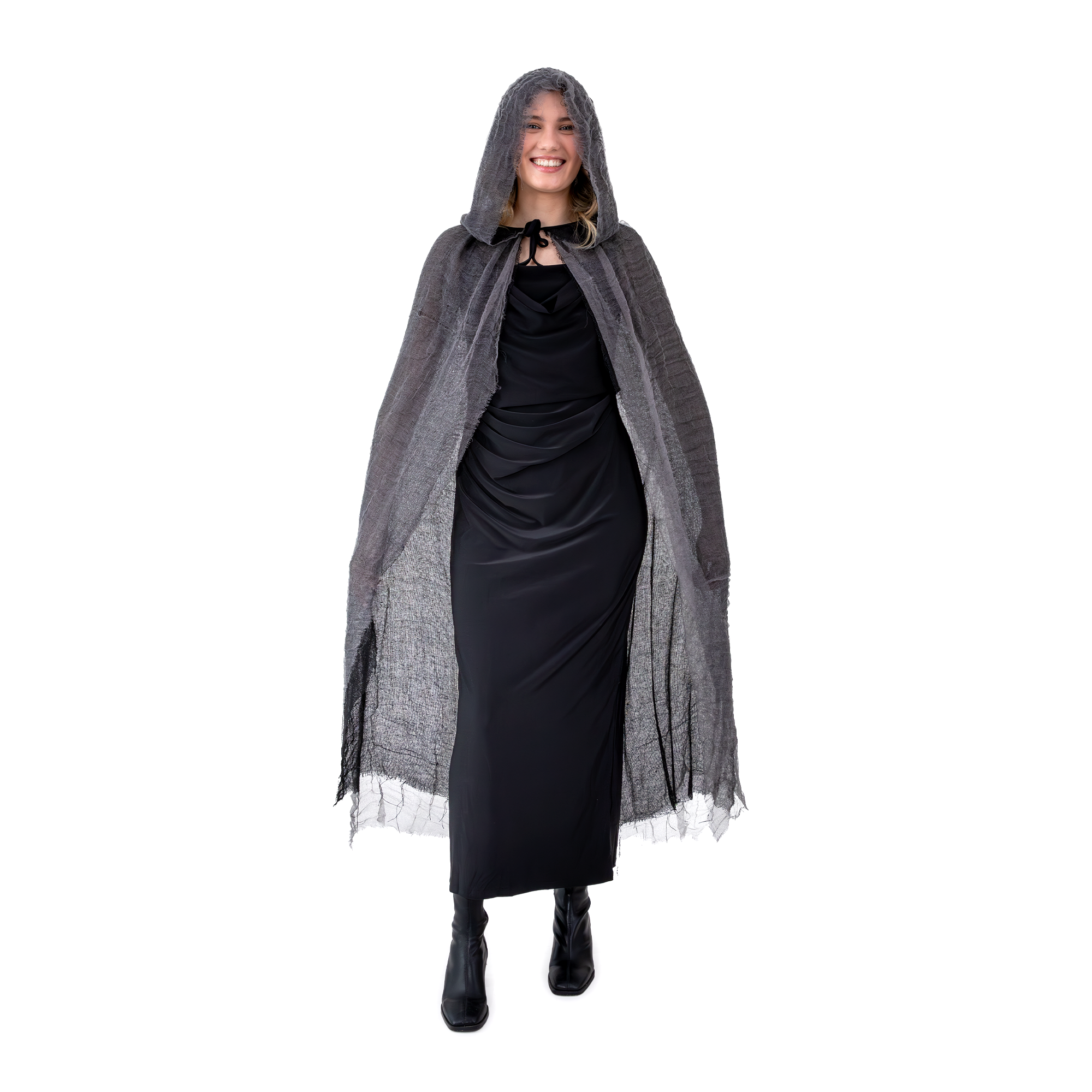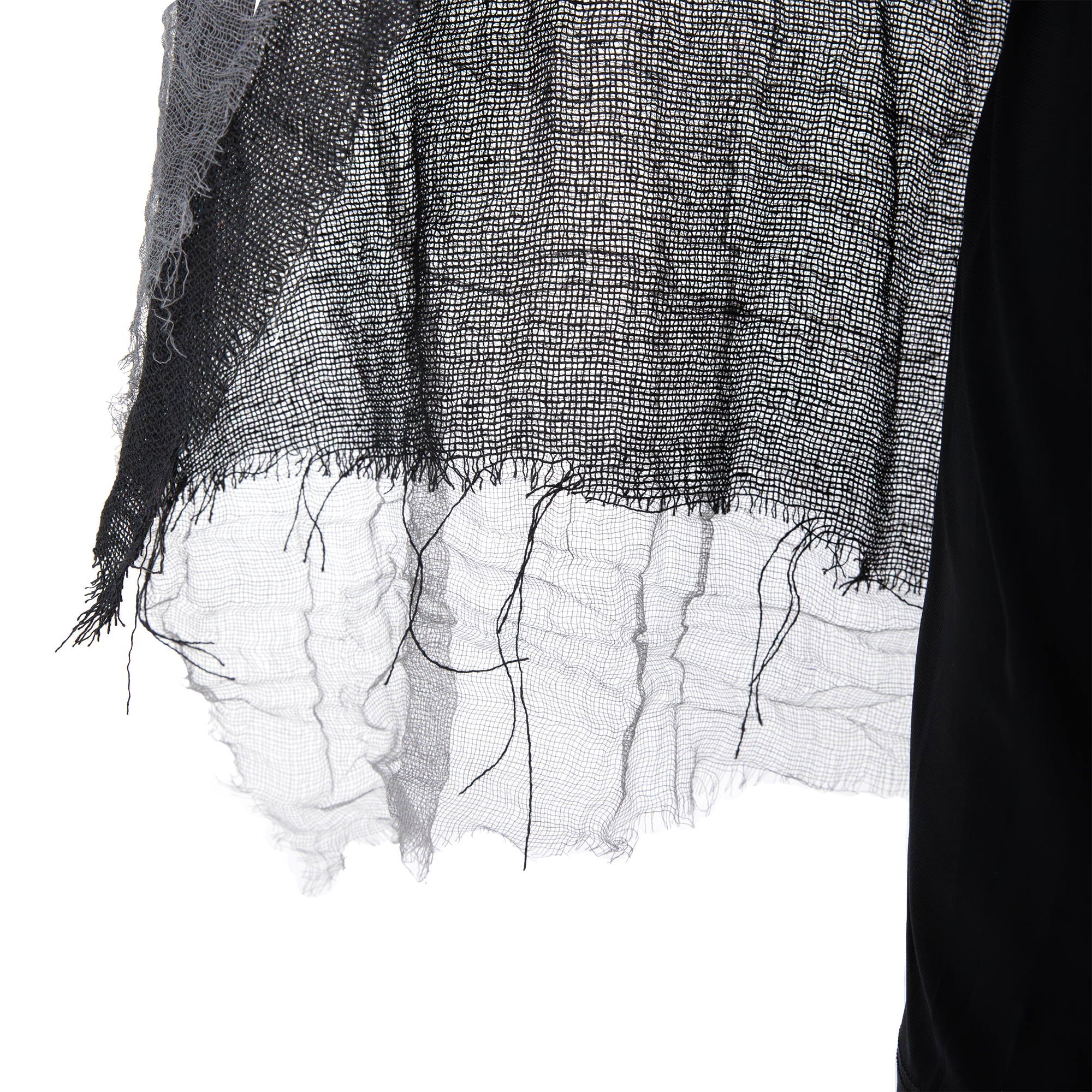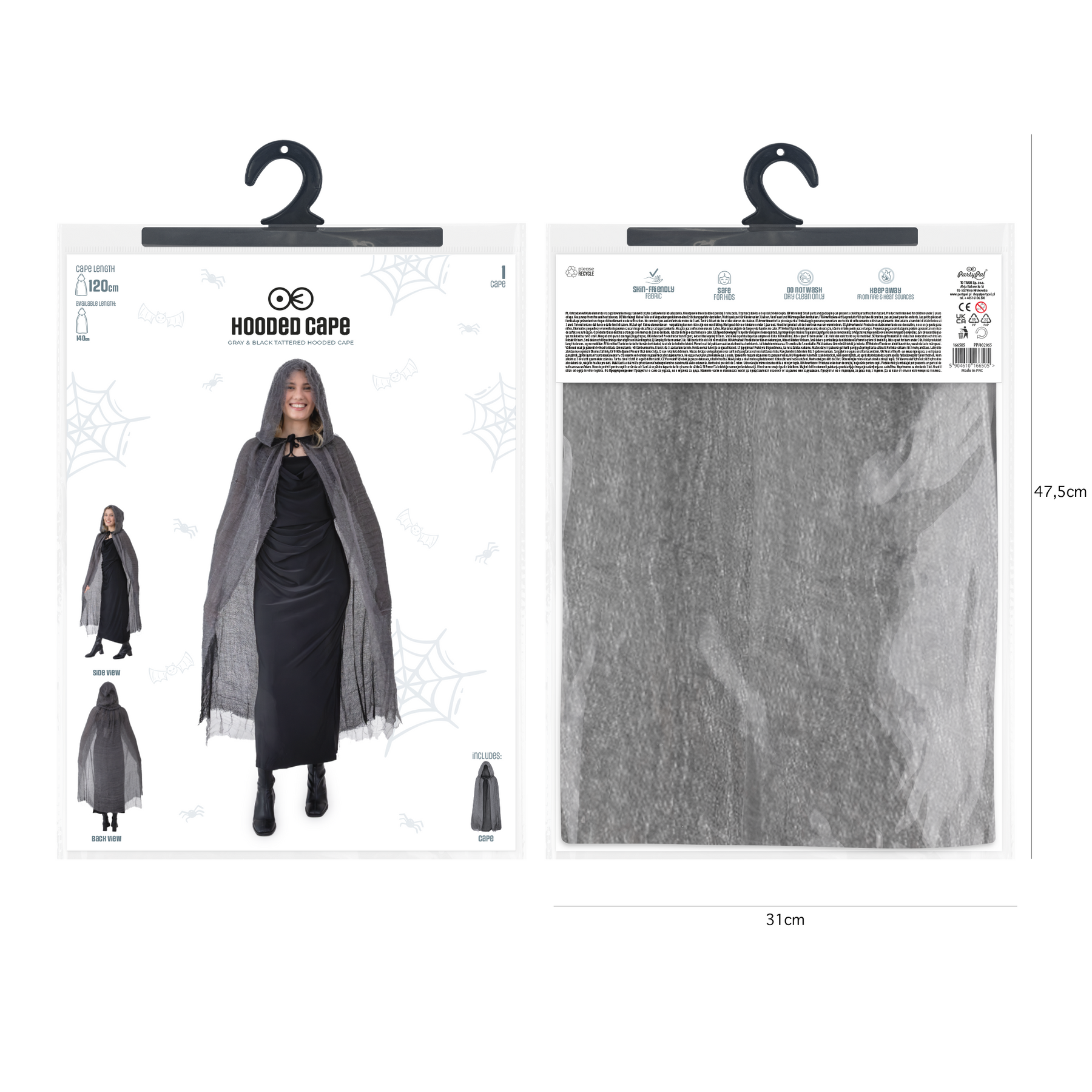 Peleryna z kapturem wykonana z dwuwarstwowej siateczki. Spodnia część jest w kolorze czarnym, a wierzchnia warstwa w kolorze szarym.