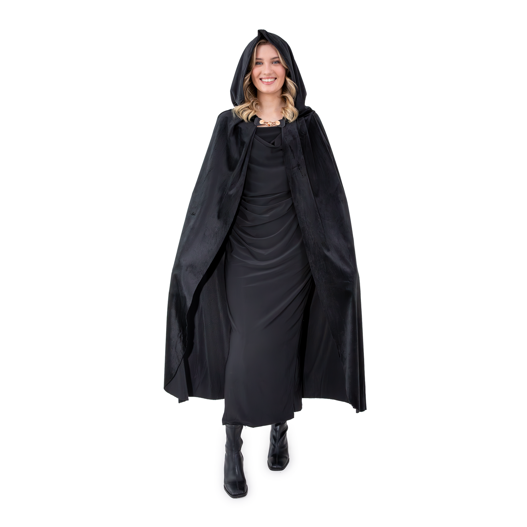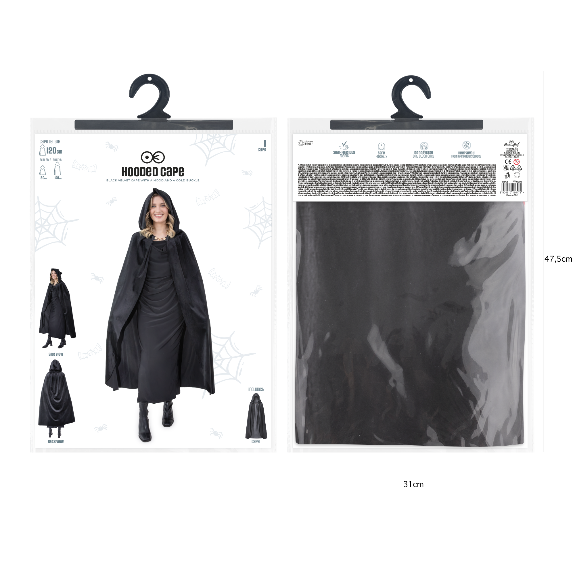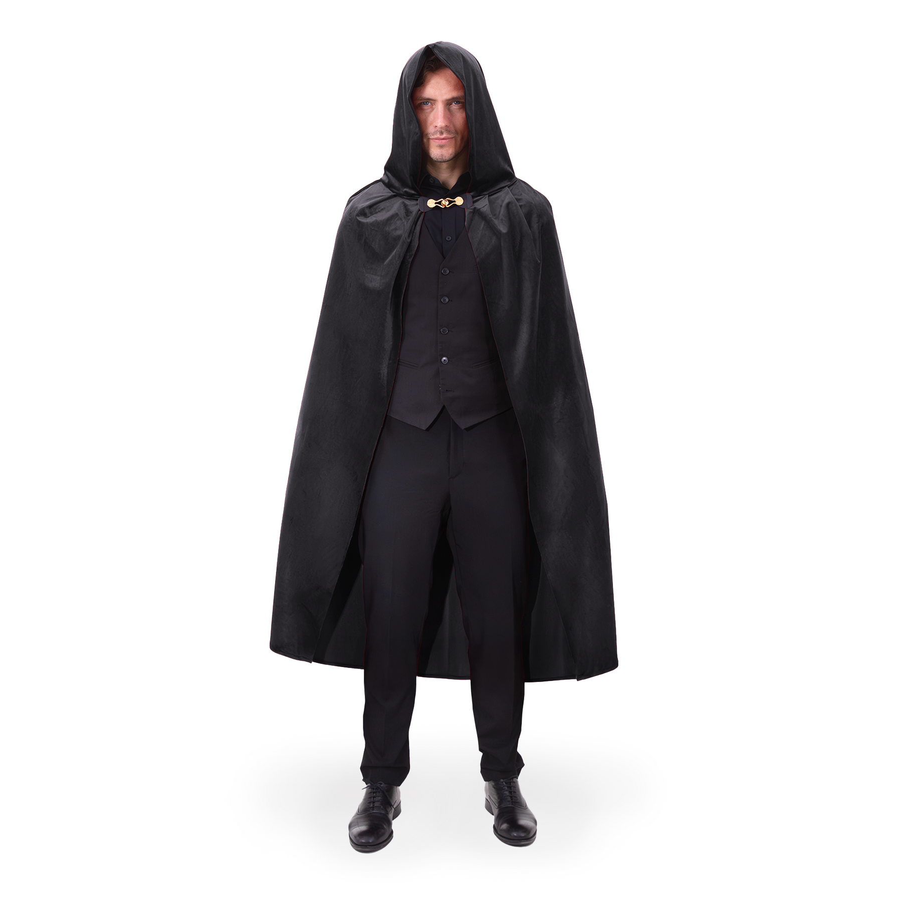 Aksamitna peleryna w kolorze czarnym z ozdobnym metalowym zapięciem pod szyją w kolorze złotym.