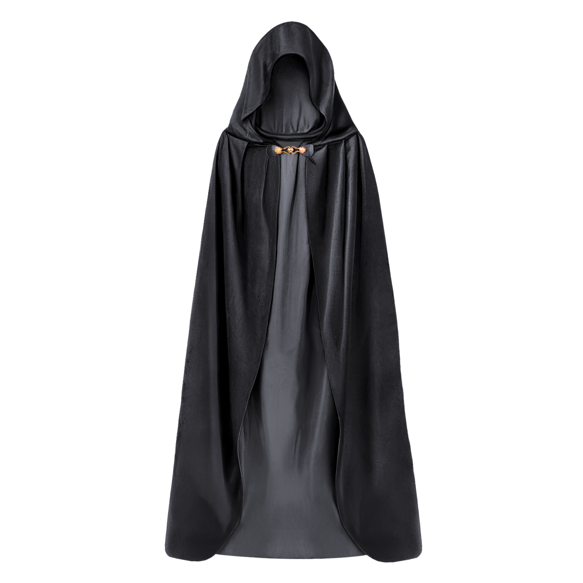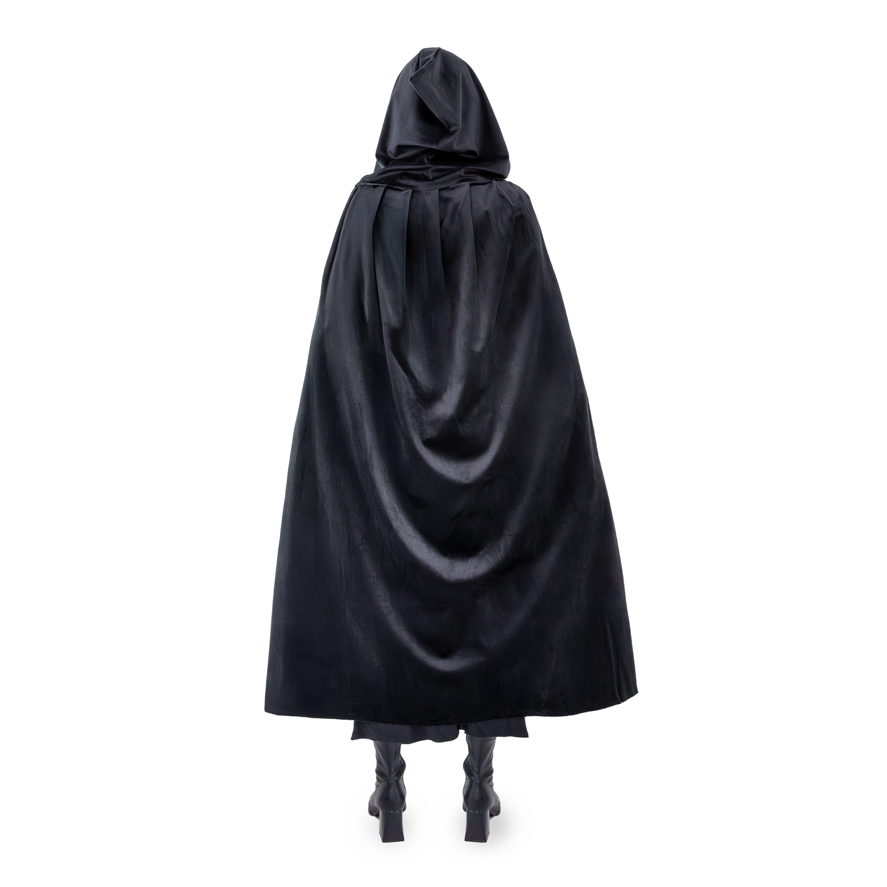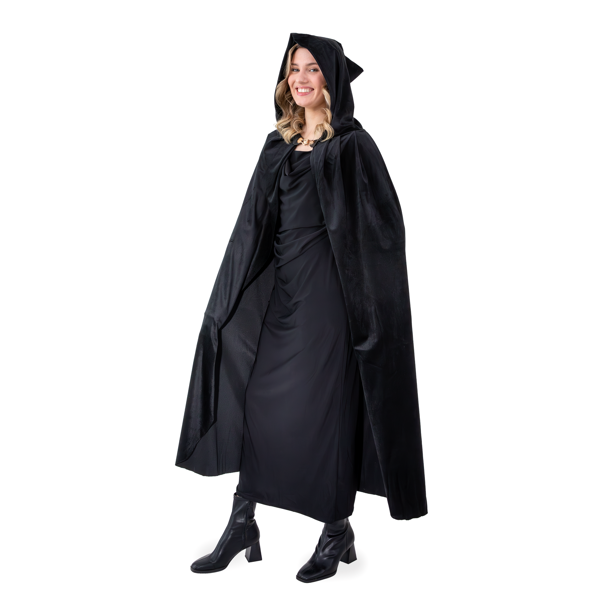 Aksamitna peleryna w kolorze czarnym z ozdobnym metalowym zapięciem pod szyją w kolorze złotym.