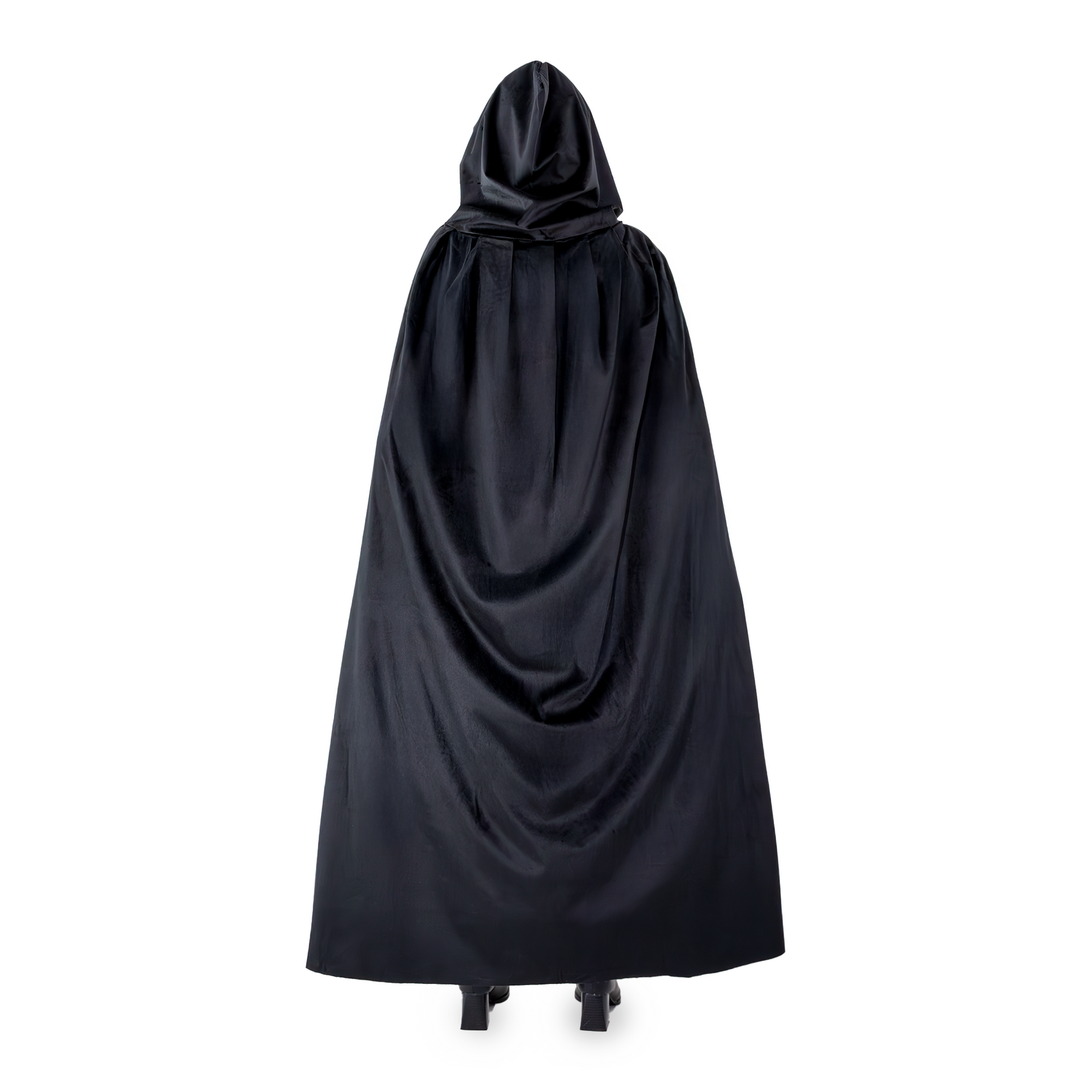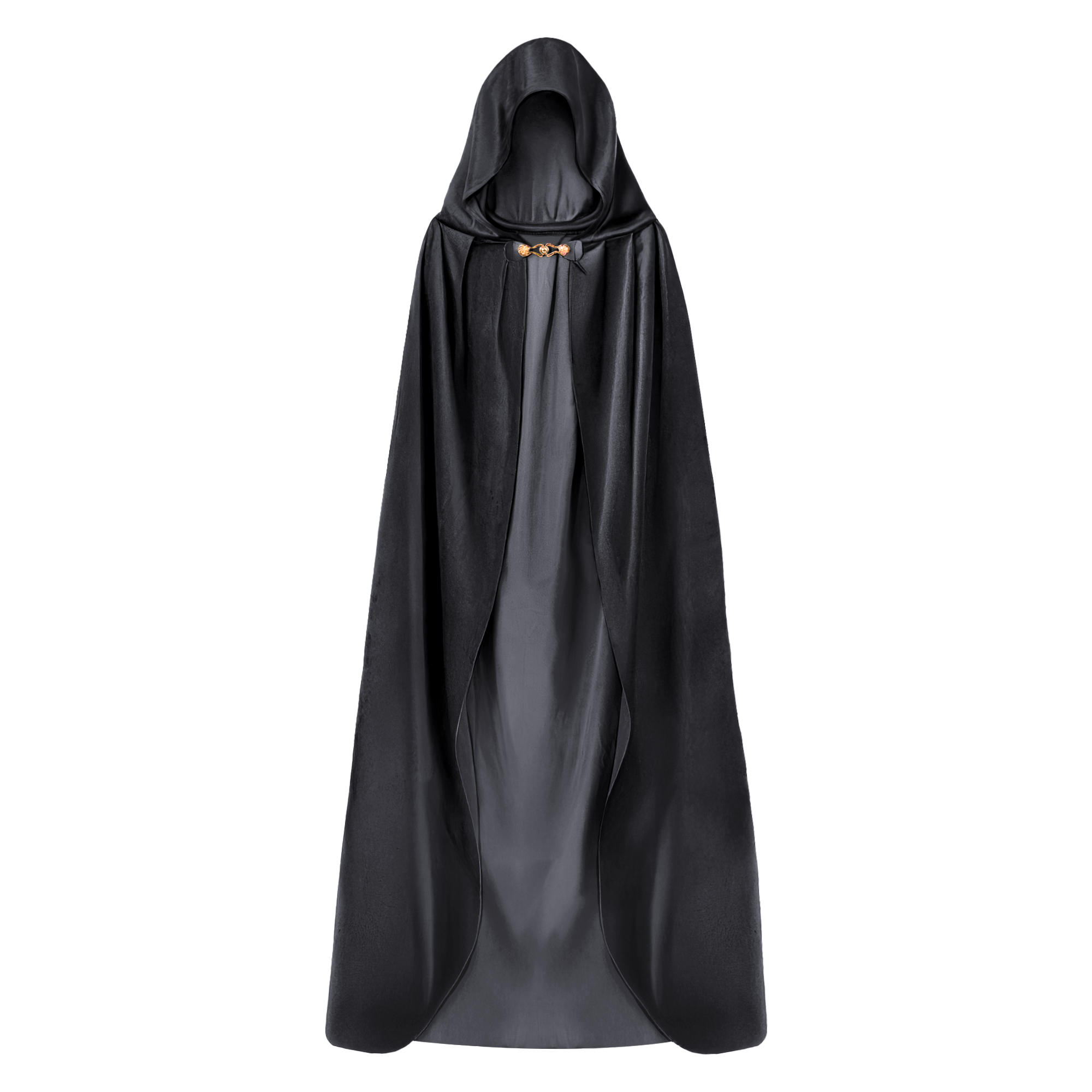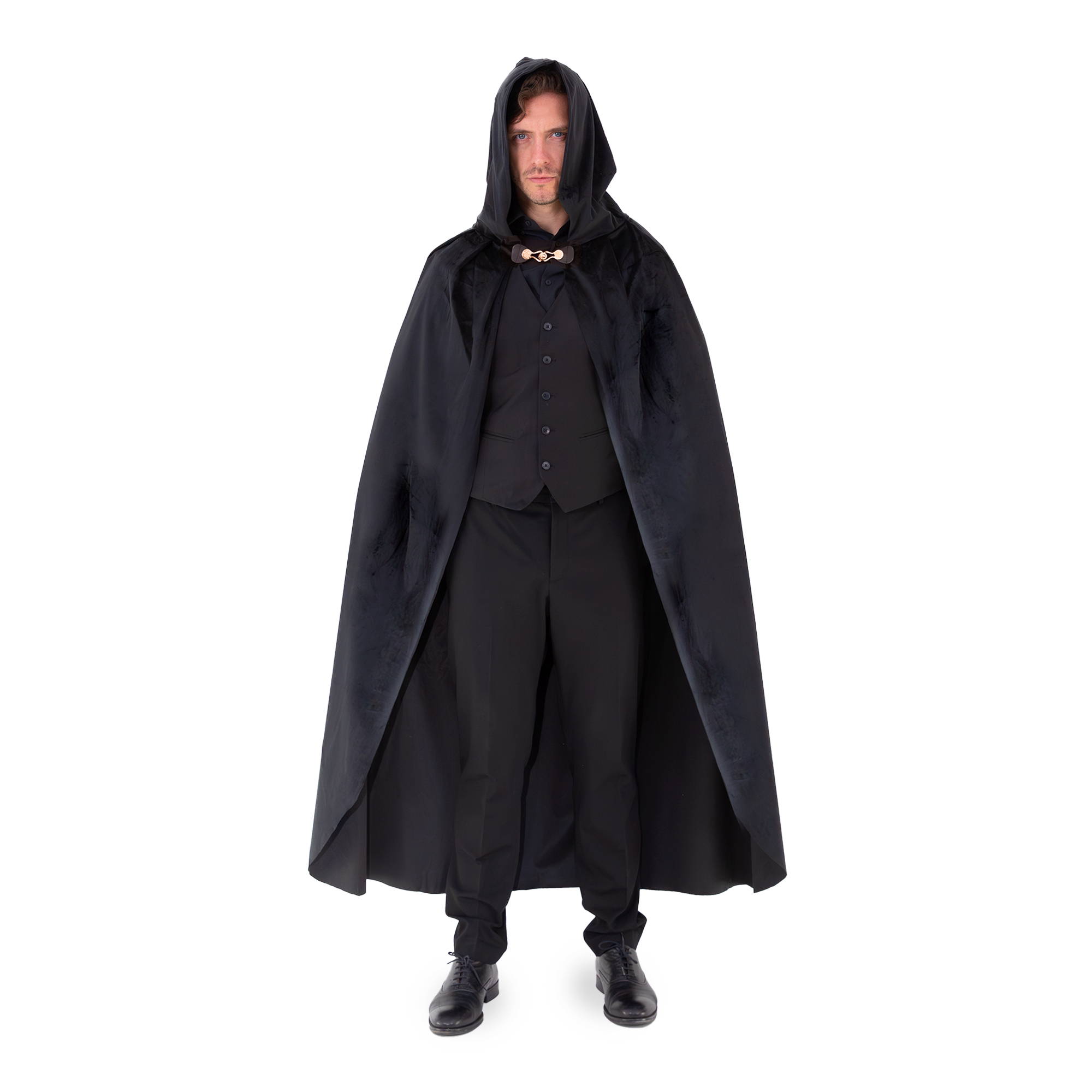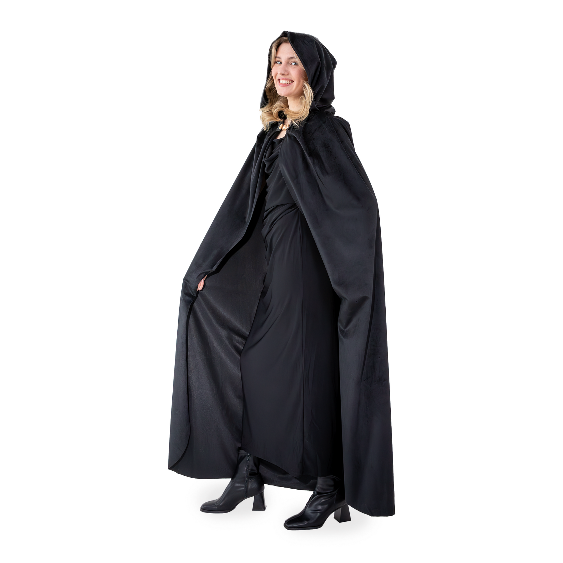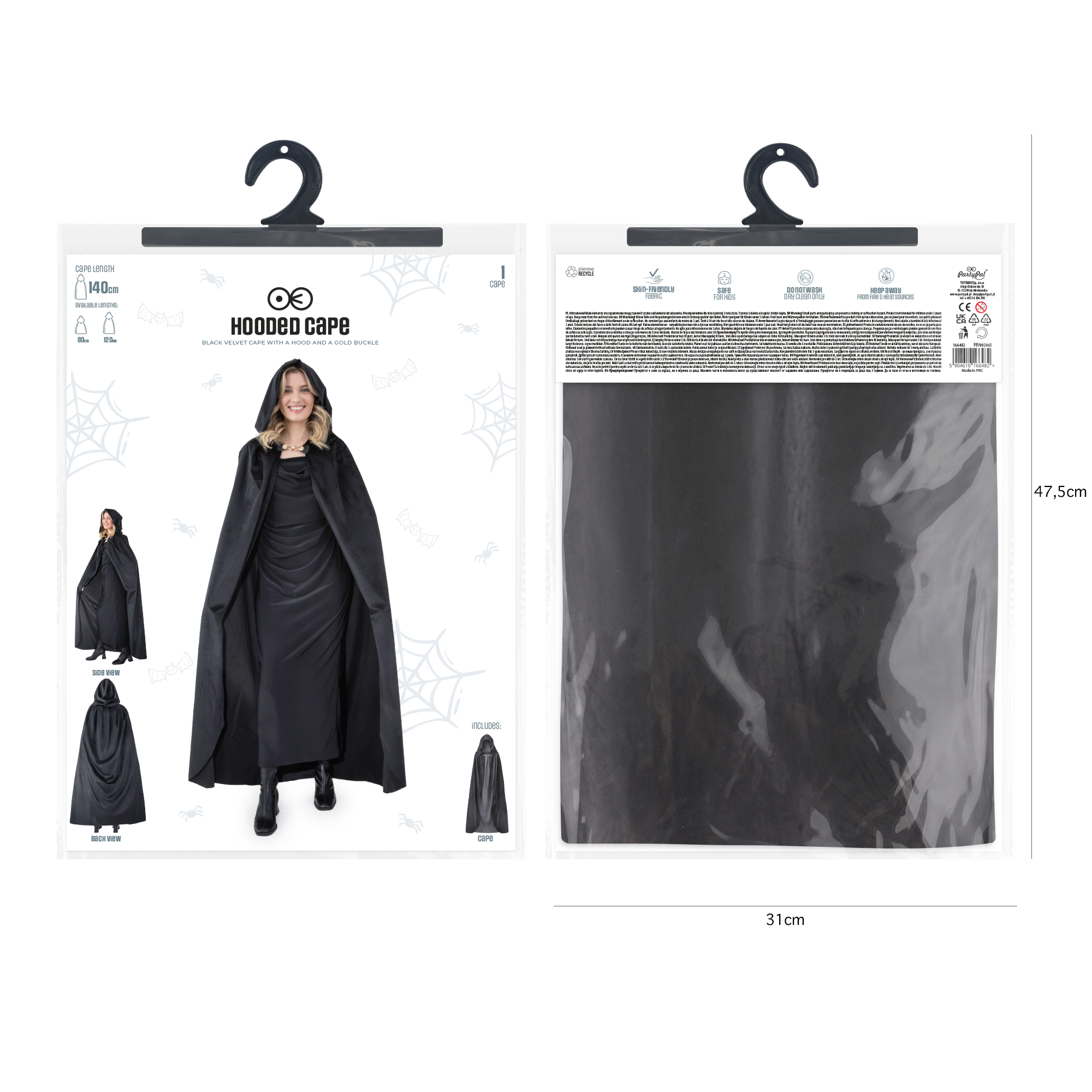 Aksamitna peleryna w kolorze czarnym z ozdobnym metalowym zapięciem pod szyją w kolorze złotym.