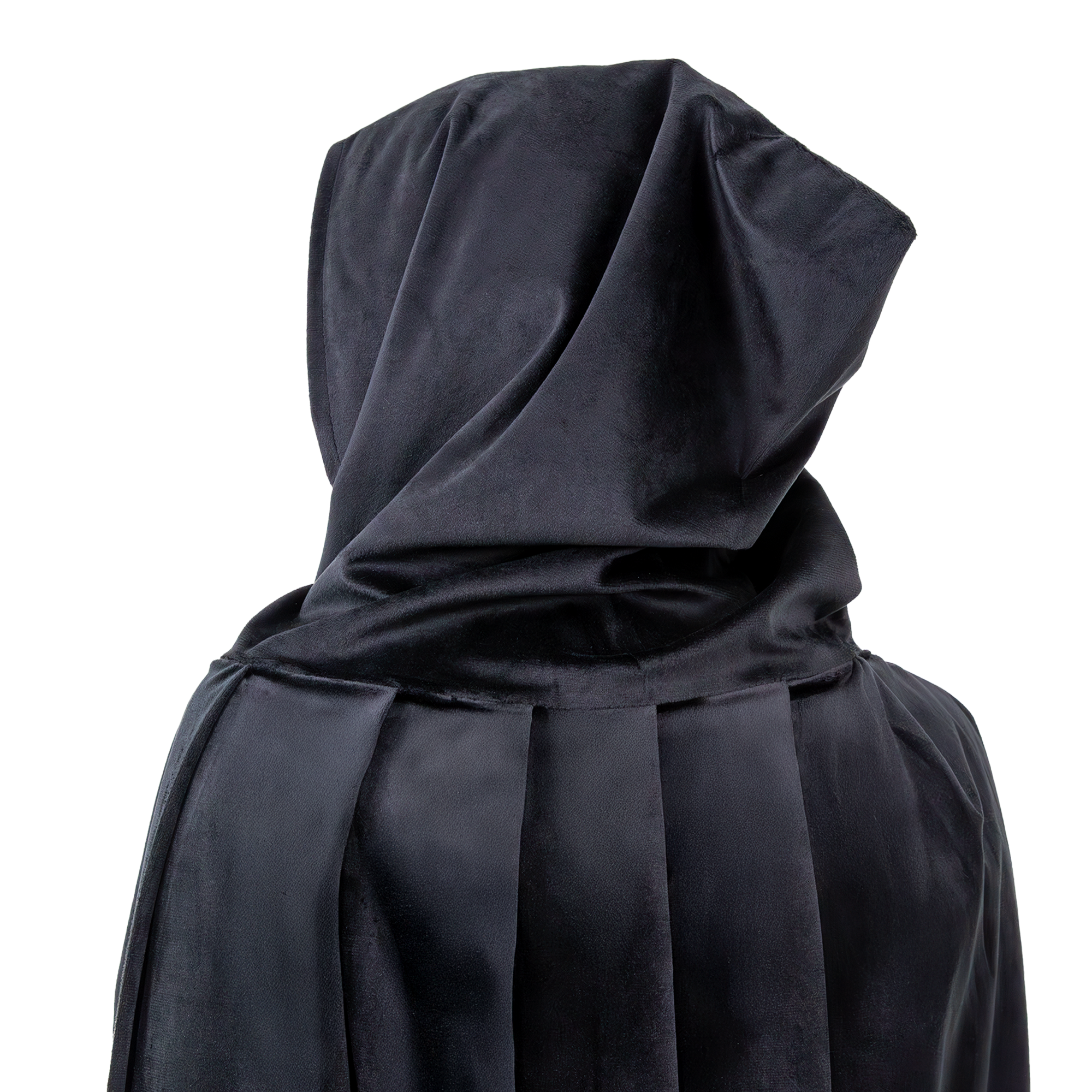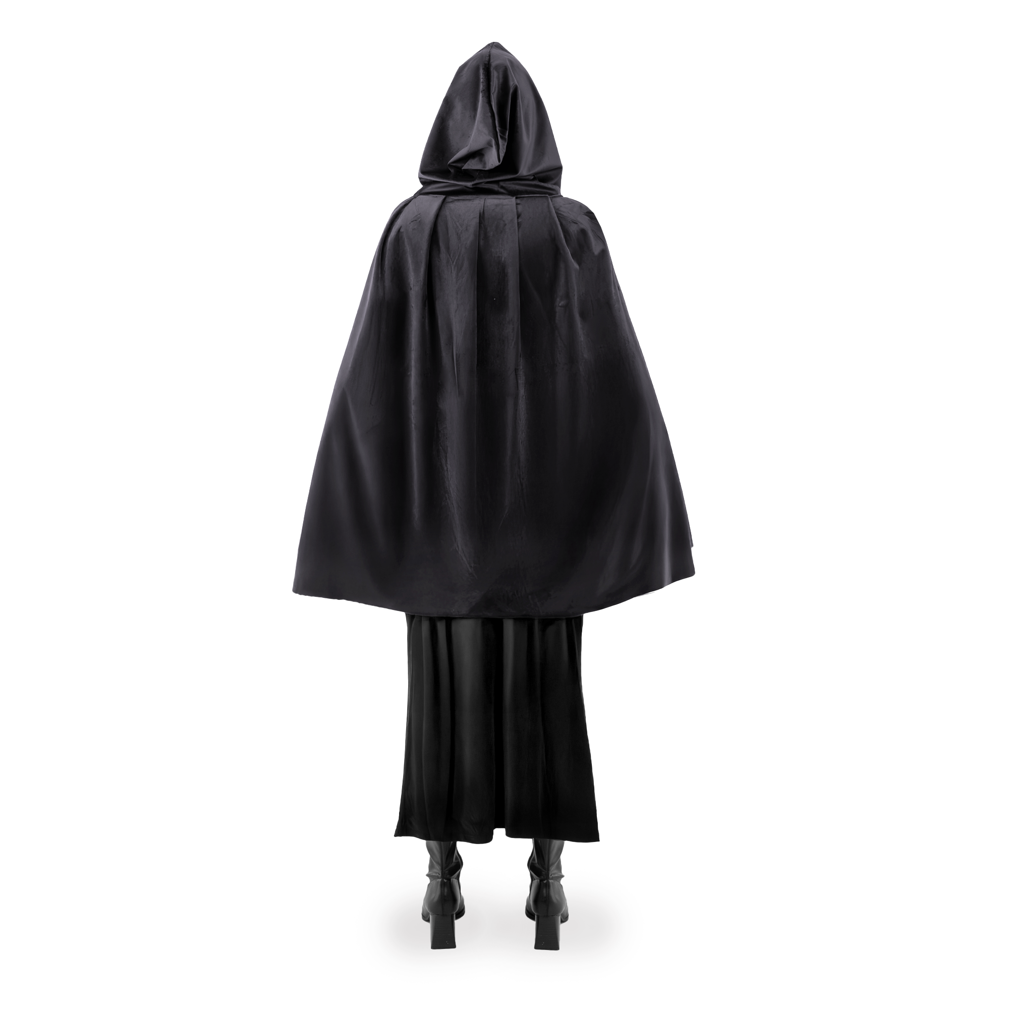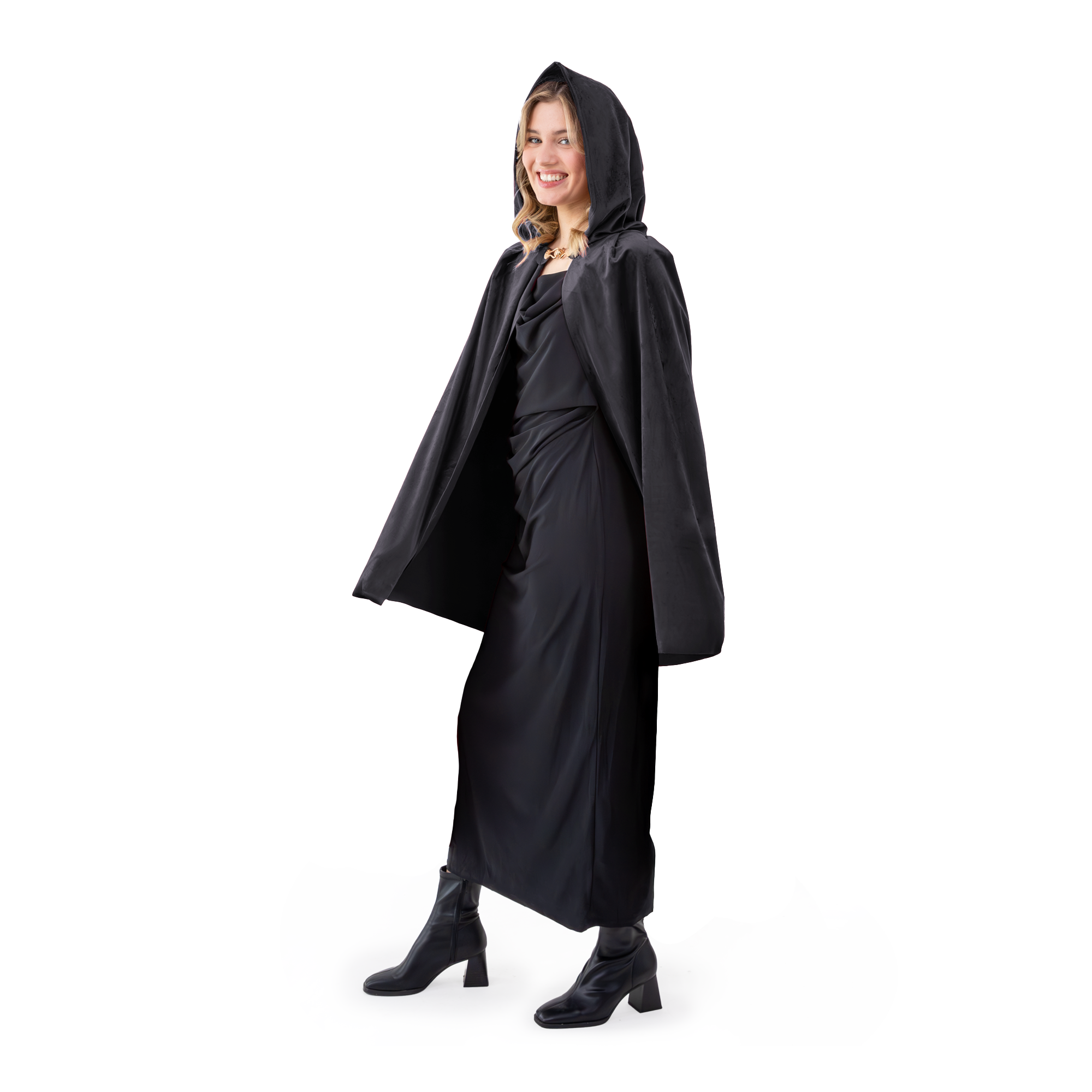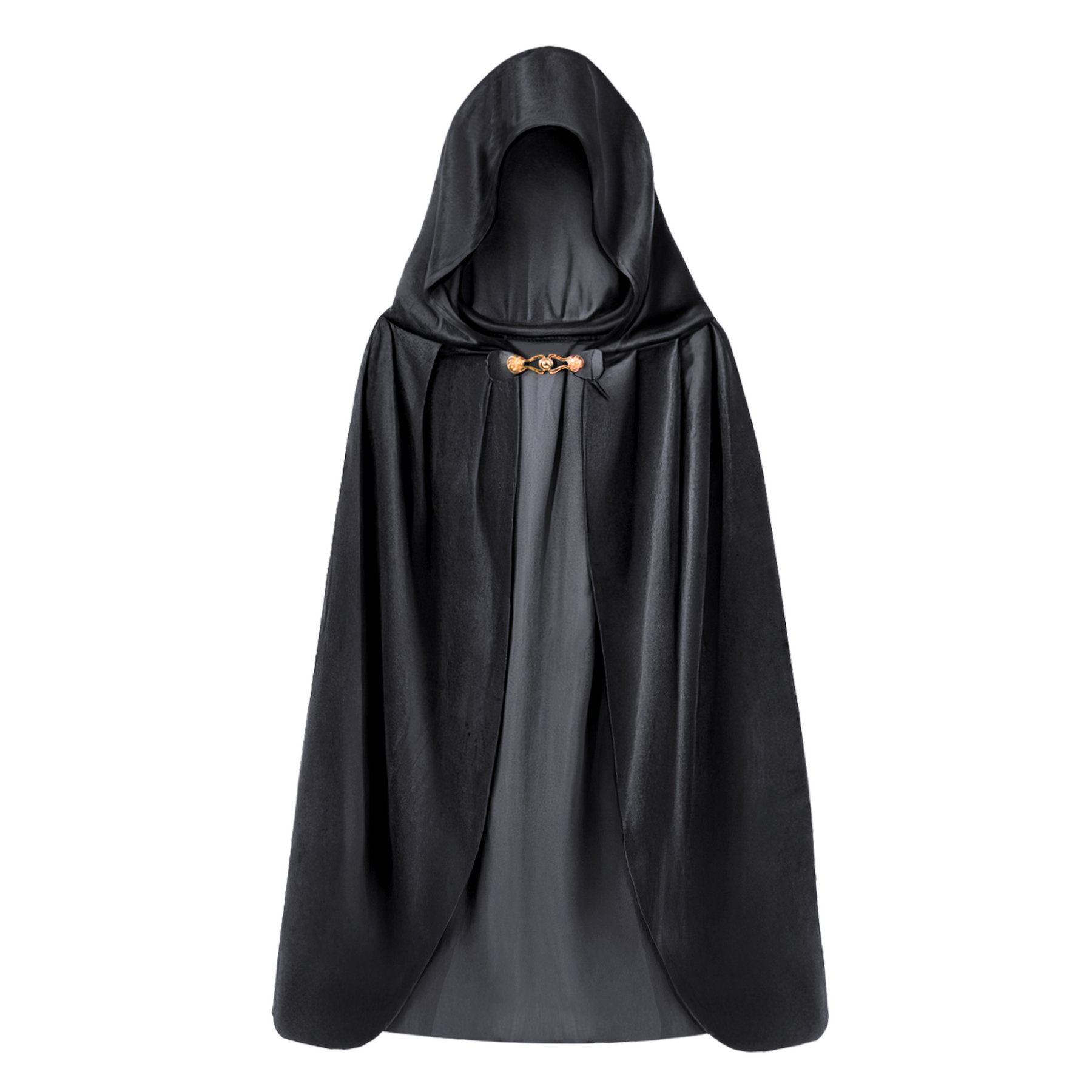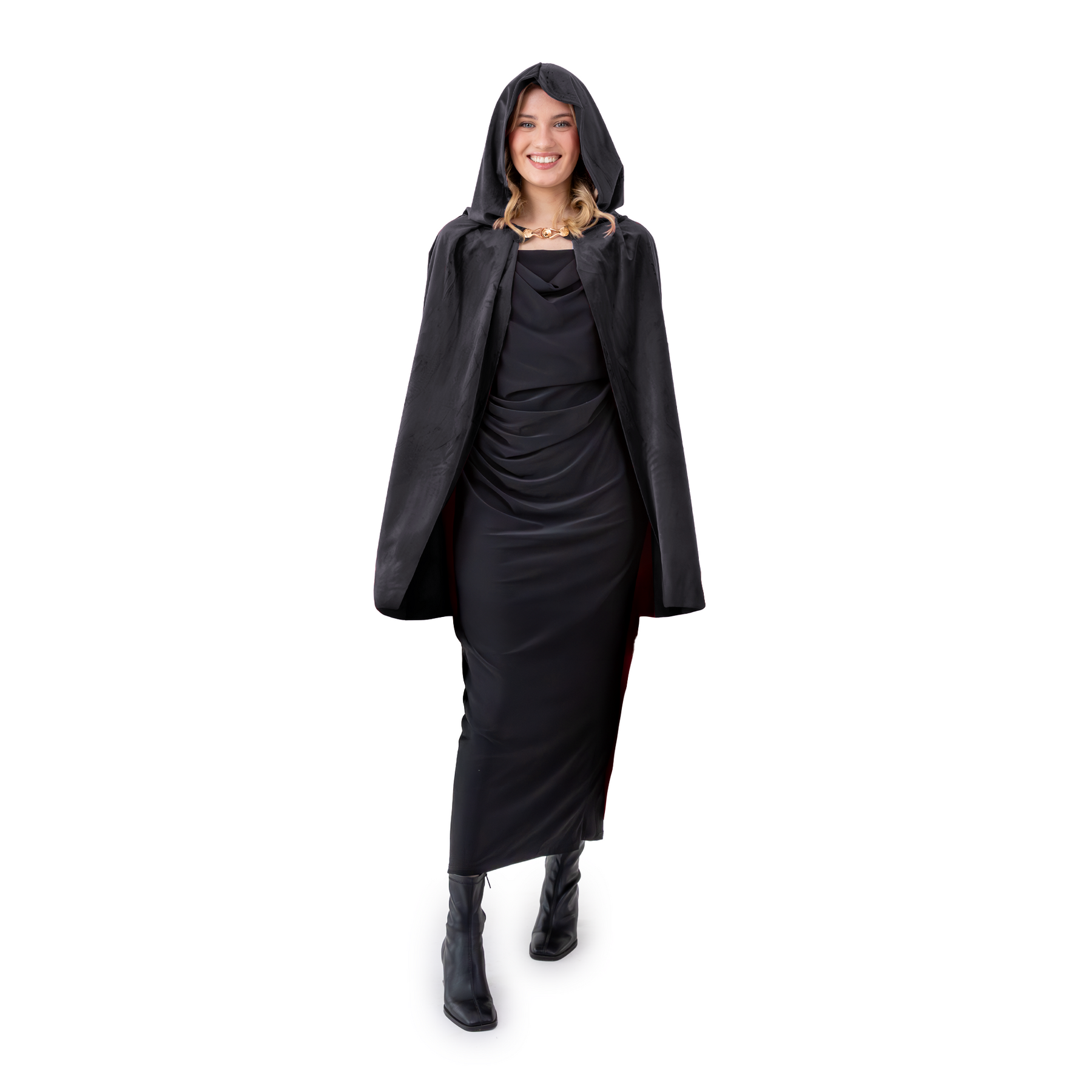 Aksamitna peleryna w kolorze czarnym z ozdobnym metalowym zapięciem pod szyją w kolorze złotym.