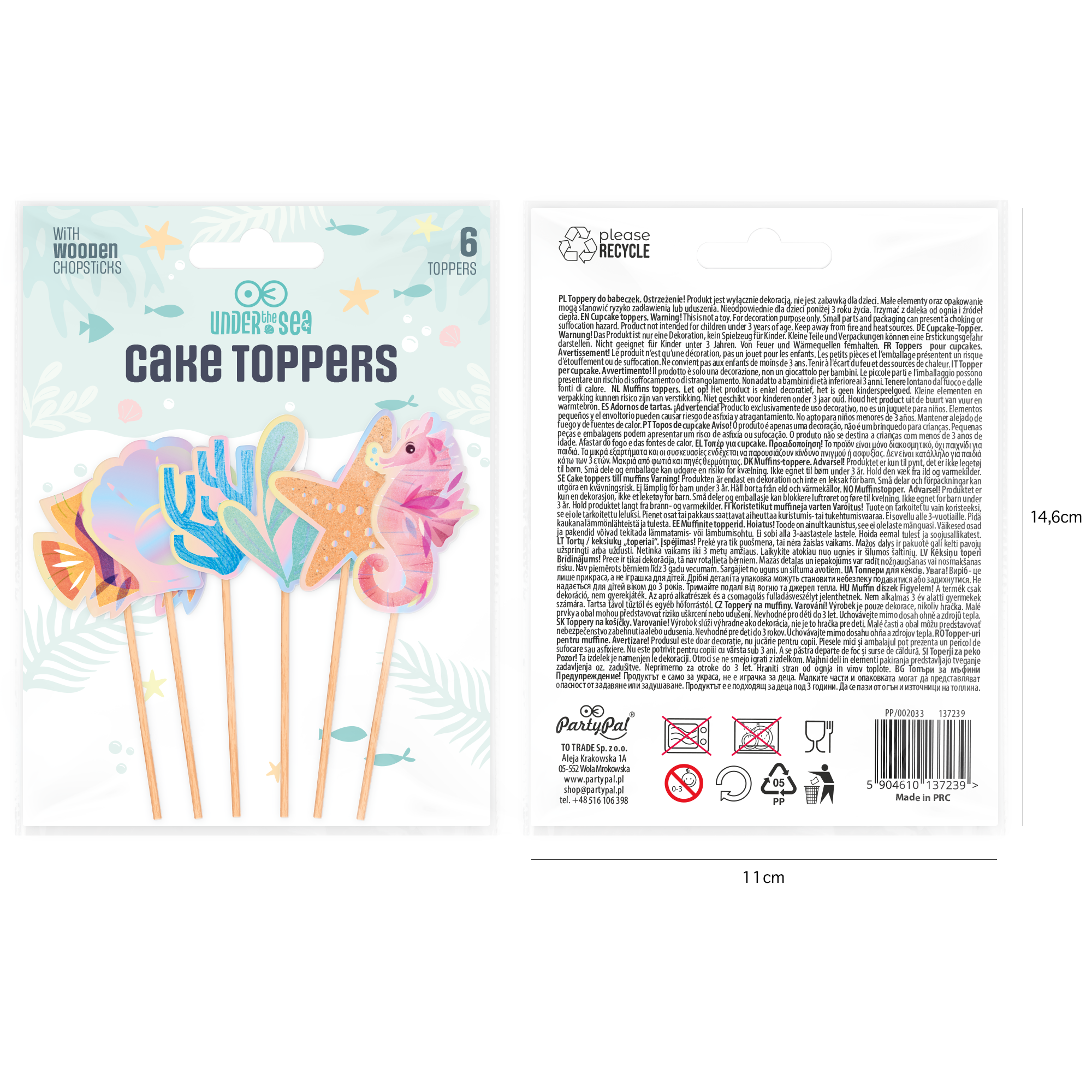 Śliczne toppery pomogą stworzyć na torcie lub babeczkach wspaniały podwodny świat. Wyróżniają je pastelowe kolory podkreślone przez opalizujące elementy graficzne, stwarzające efekt załamania promieni słonecznych pod wodą.