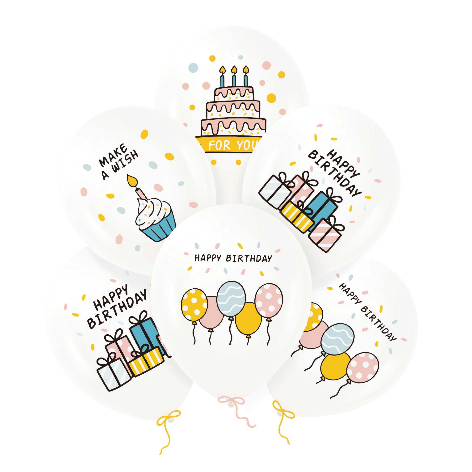Delikatne pastelowe wzory podkreślone czarną kreską tworzą subtelne kompozycje urodzinowe. W zestawie znajdują się 2 balony z prezentami i 2 balony z kolorowymi balonikami, wszystkie z napisami Happy Birthday. Balon z tortem urodzinowym posiada napis For you a z muffinką ozdobioną świeczką - Make a wish.