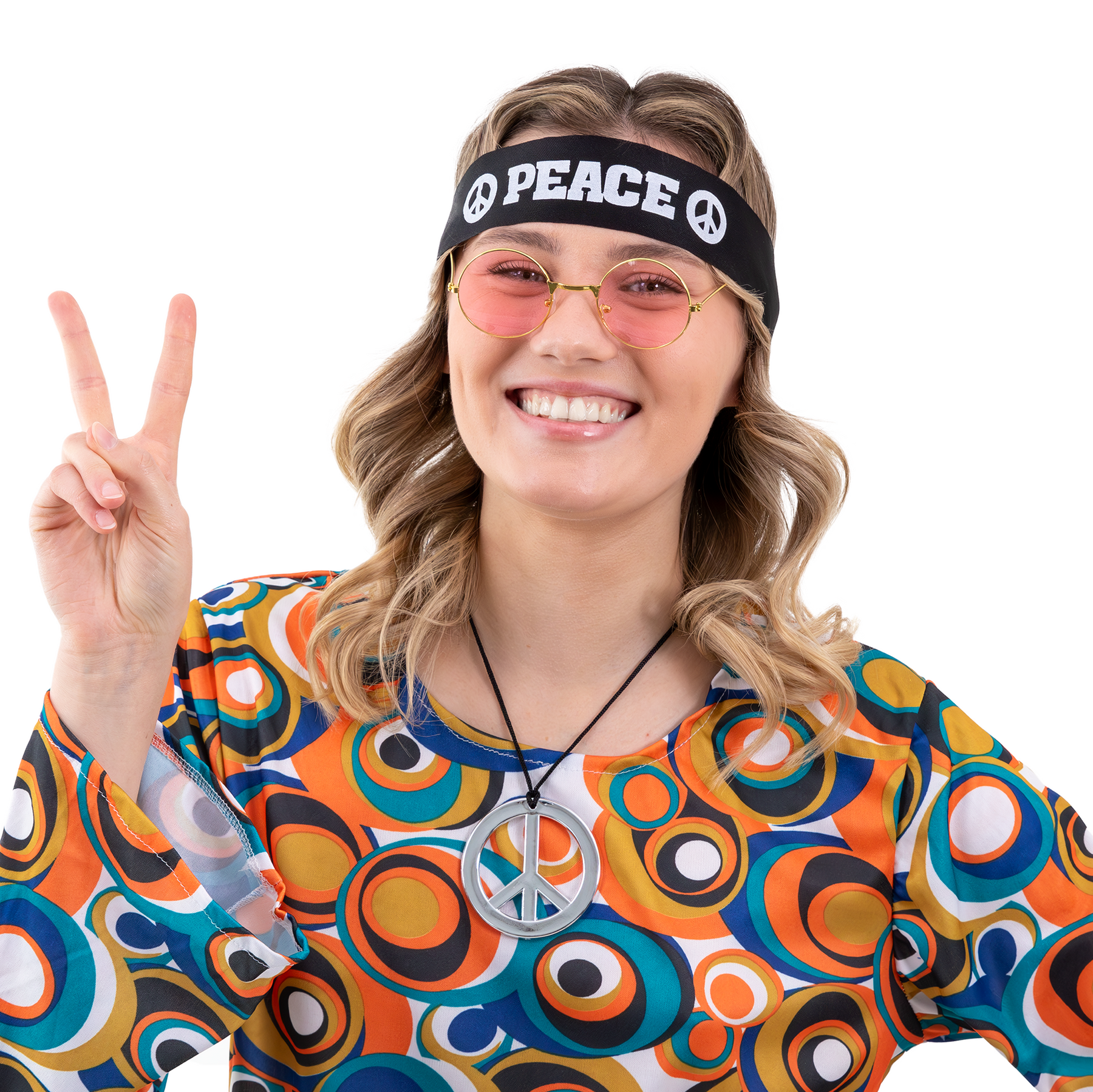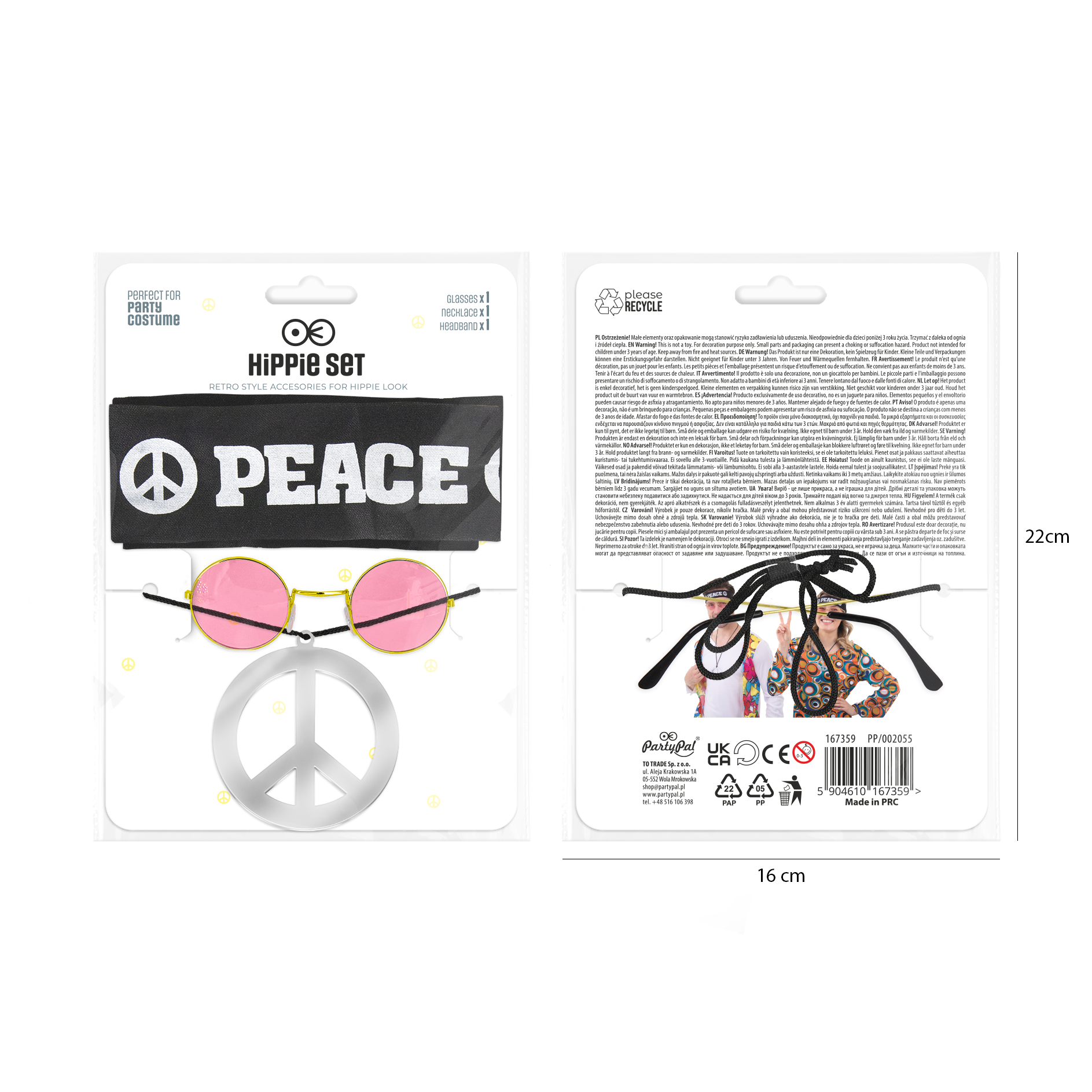 • W zestawie: opaska na głowę w kolorze czarnym z pacyfką i napisem Peace, okulary lenonki w kolorze różowym i naszyjnik srebrny z pacyfką