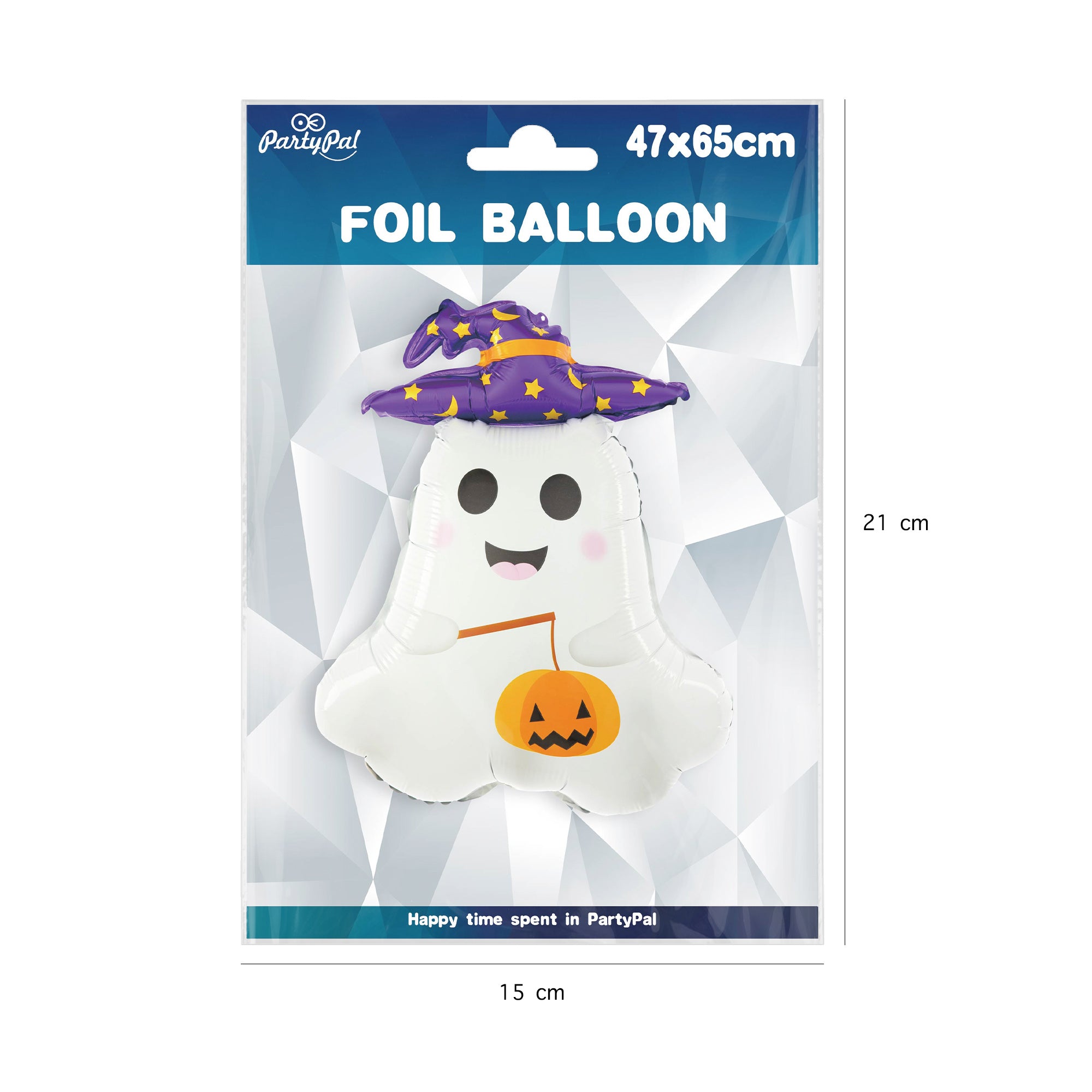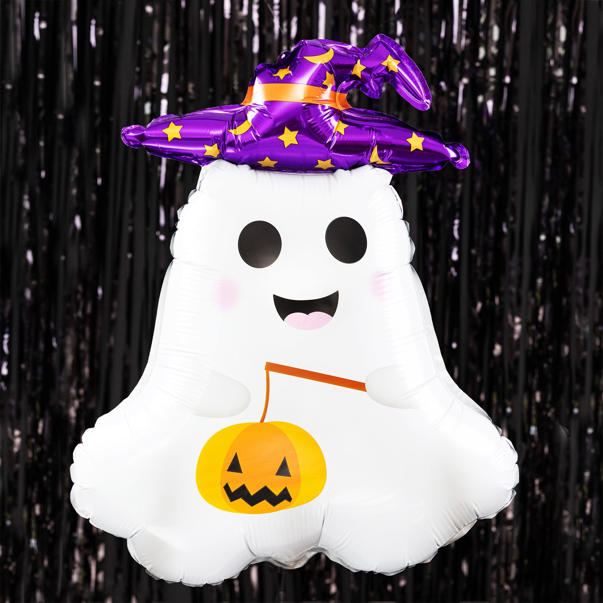 Balon foliowy Duszek to sympatyczna propozycja dla najmłodszych w czasie Halloween. Biały uśmiechnięty duszek z czarnymi oczkami, ma na głowie fioletowy kapelusz wiedźmy a w łapce trzyma dynię. Trzy symbole Halloween w jednym produkcie.