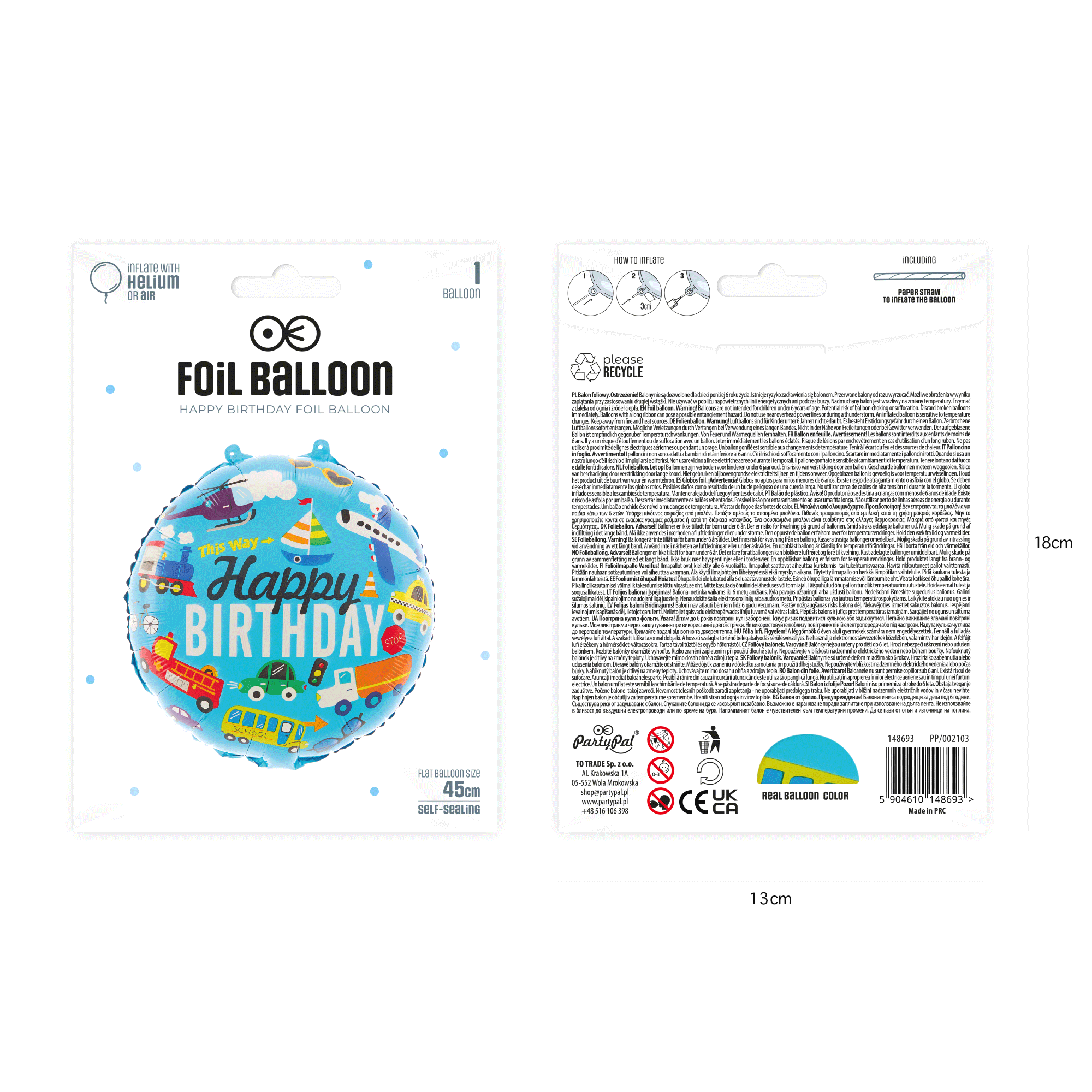 Balon foliowy Happy Birthday Pojazdy 45cm
