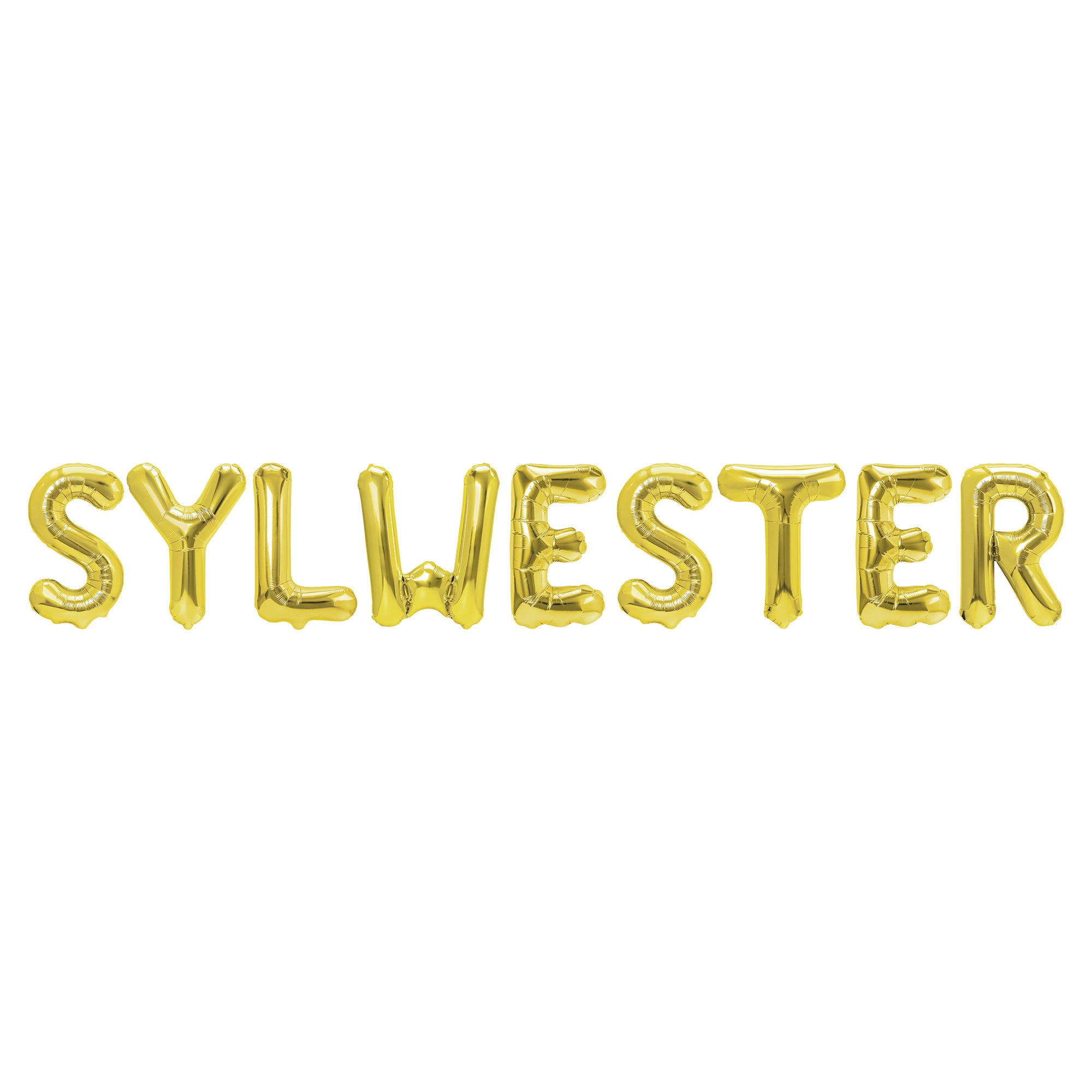 Zestaw balonów foliowych tworzących napis Sylwester. Złoty kolor liter idealnie wpisuje się w atmosferę noworocznych przyjęć.