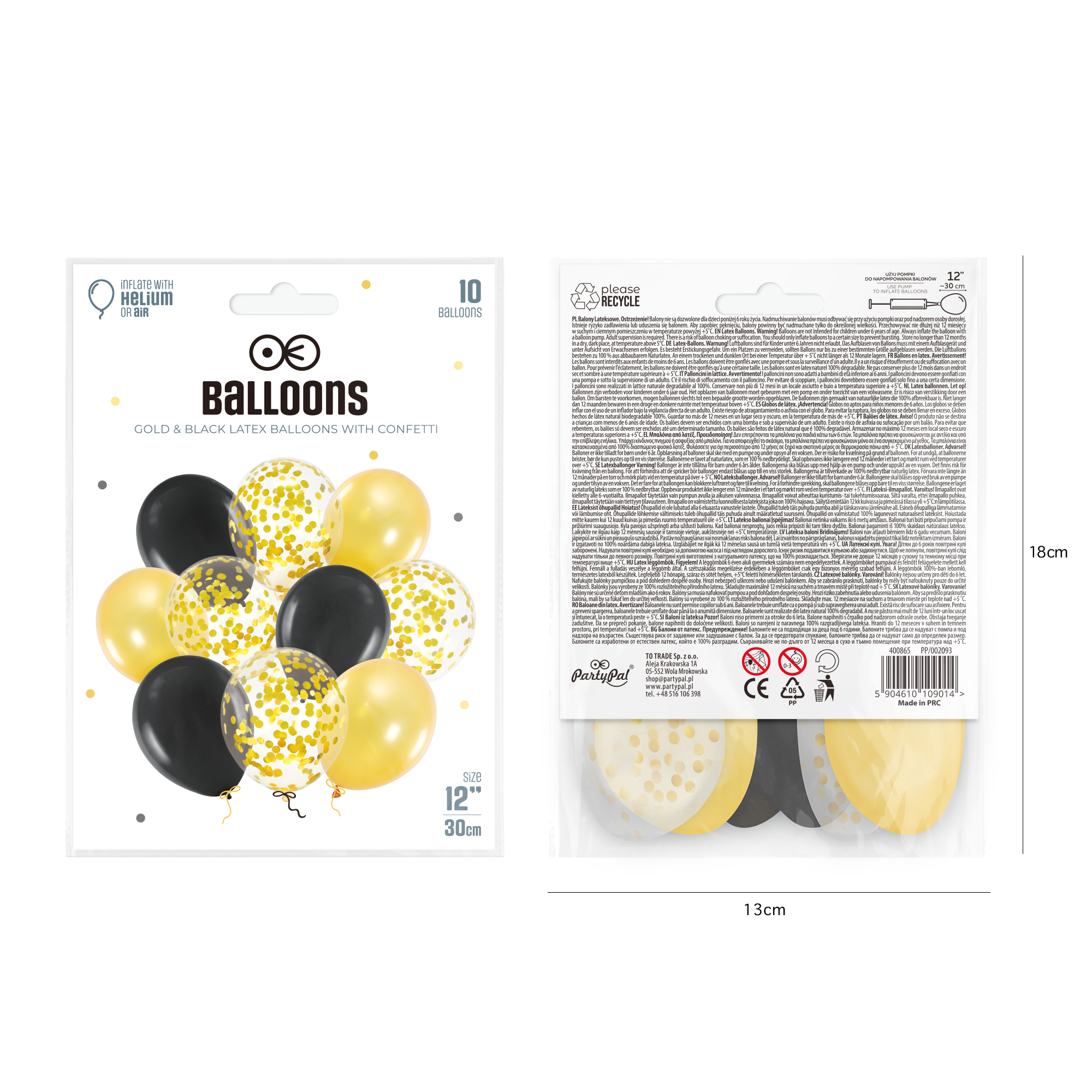 Balony 12 cali złoto-czarne mix z konfetti 10szt.