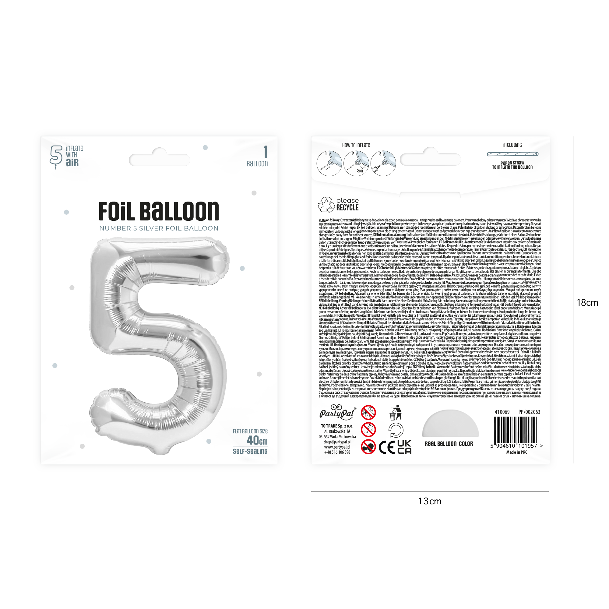 Balon foliowy cyfra 5 srebrny 40cm