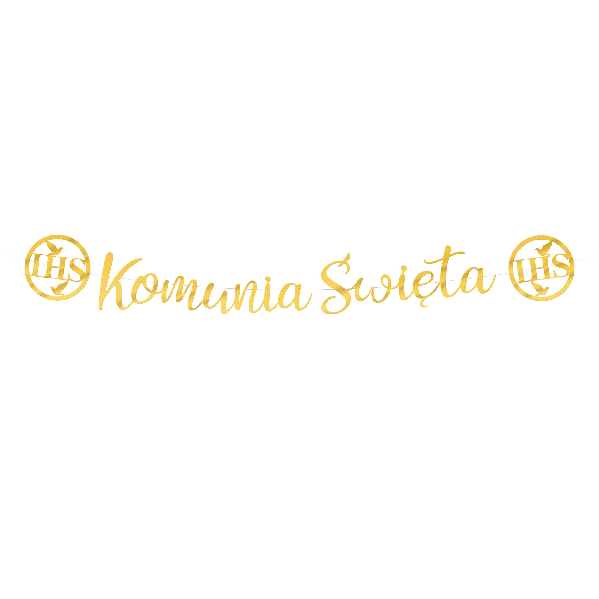 Elegancki, papierowy baner na komunię składa się z czterech części: napisu Komunia Święta i dwóch symboli IHS z gołąbkami. Tradycyjny złoty kolor oraz finezyjna czcionka napisu, podkreślą wagę tego istotnego wydarzenia.