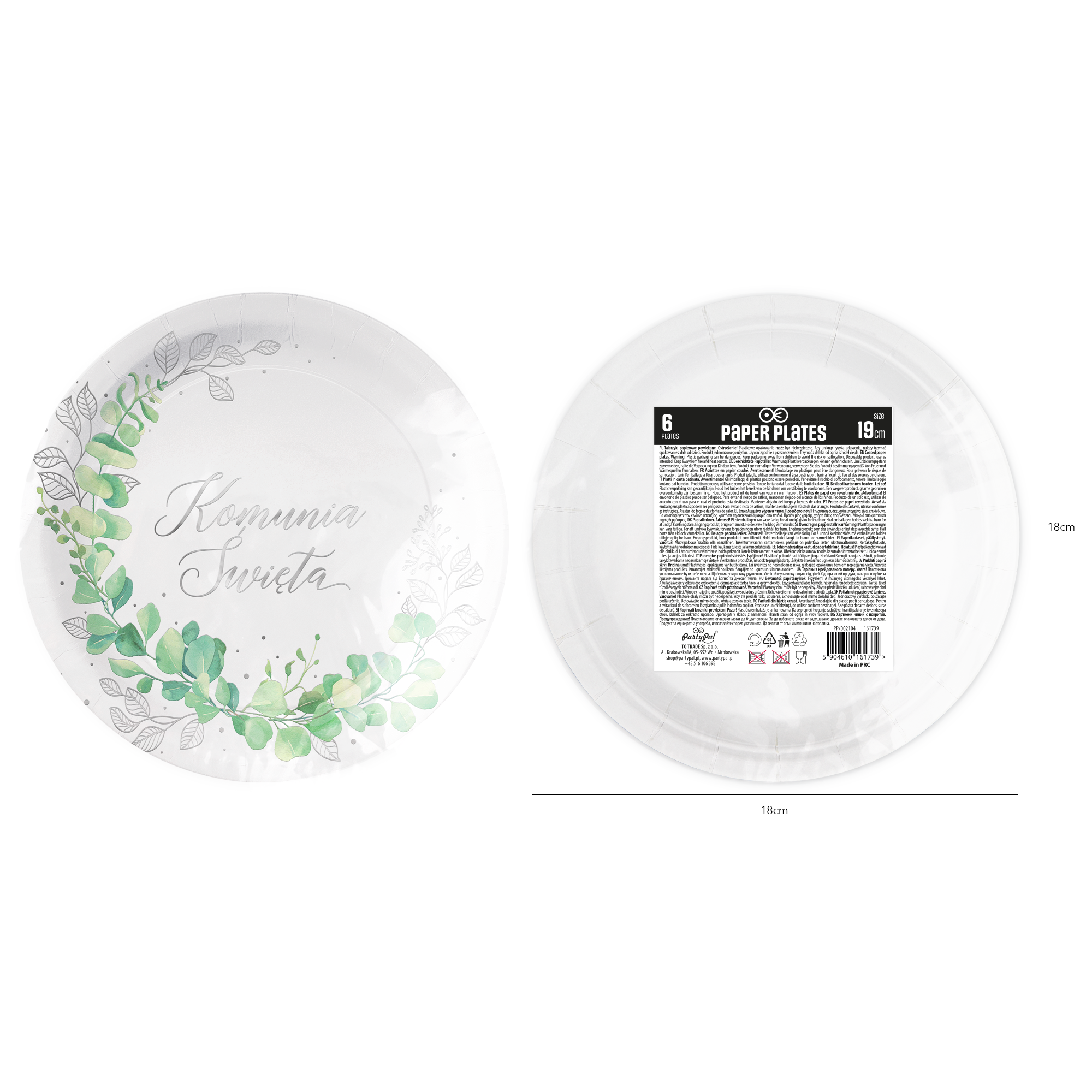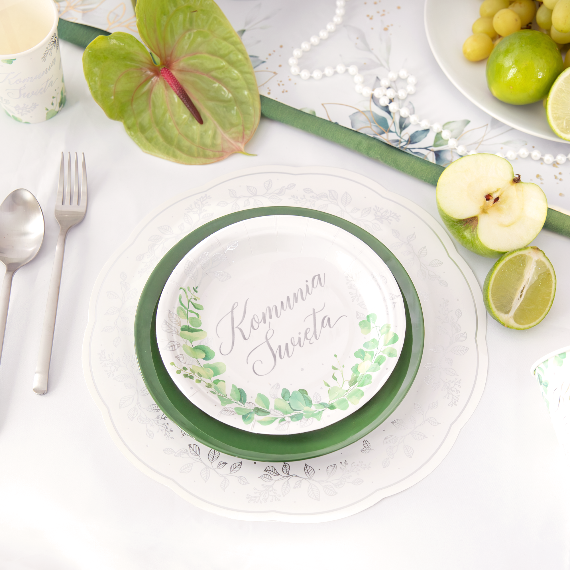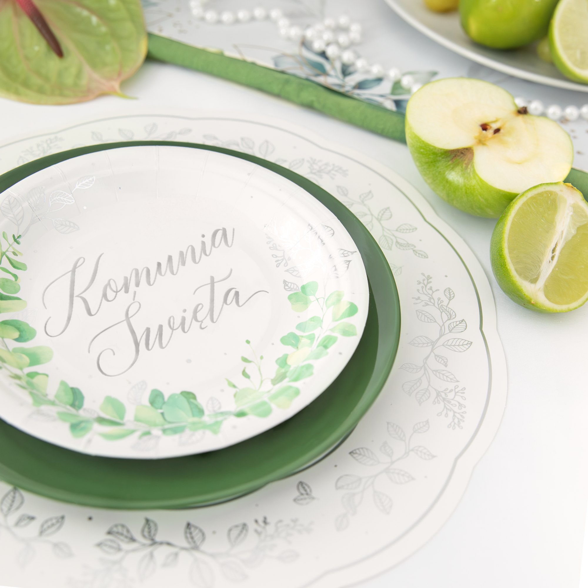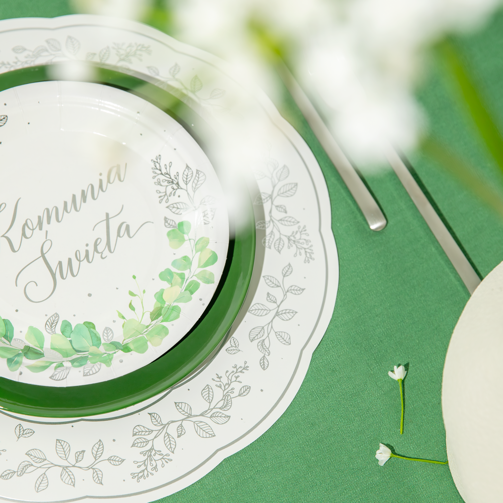 Białe talerzyki papierowe z motywem roślinnym zielono - srebrnym eukaliptusem oraz z napisem Komunia Święta.