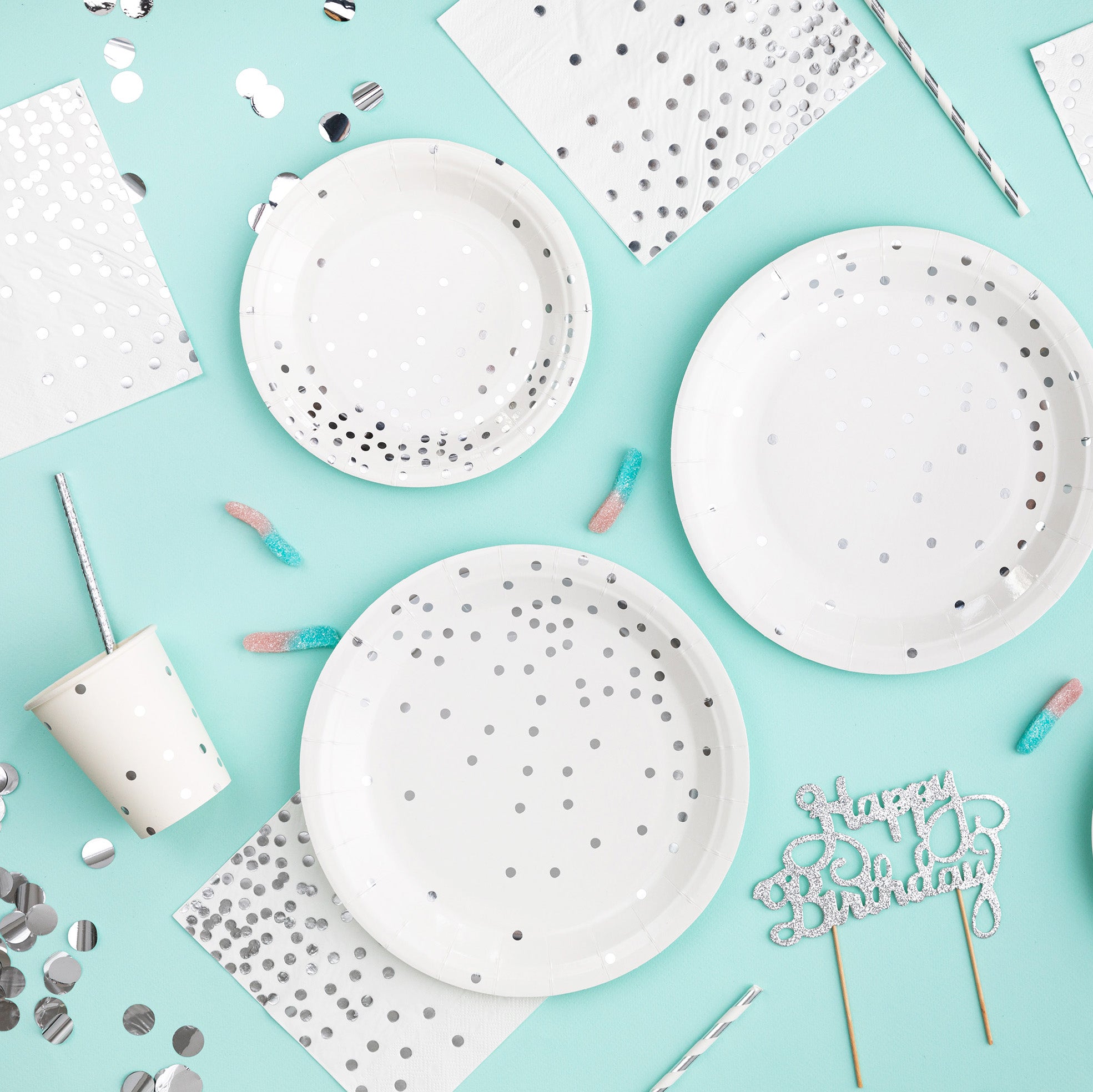 Talerzyk papierowy biały w srebrne kropki 9cali 6szt.