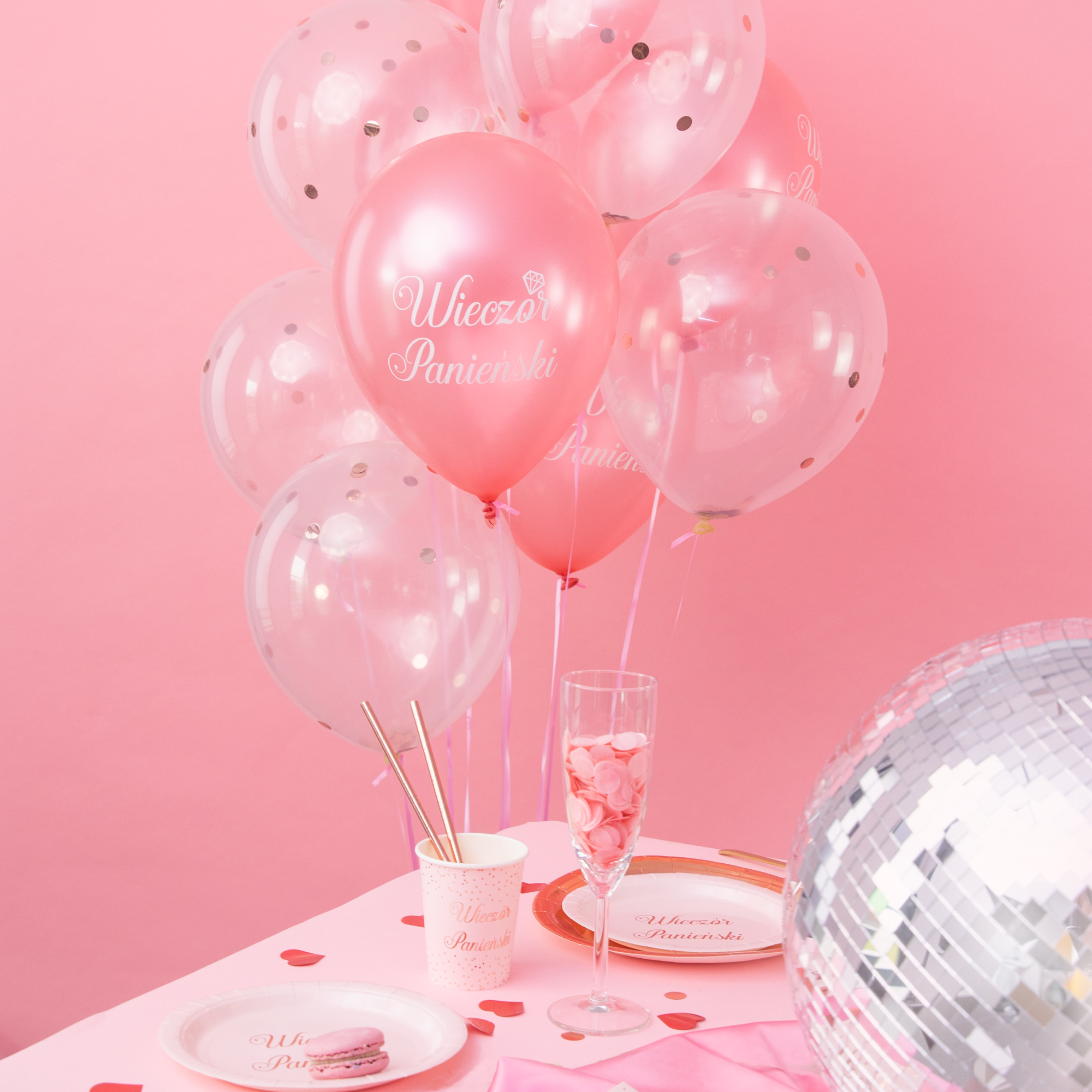 Przykładowe nakrycie stołu na wieczór panieński z zestawem balonów w tle
