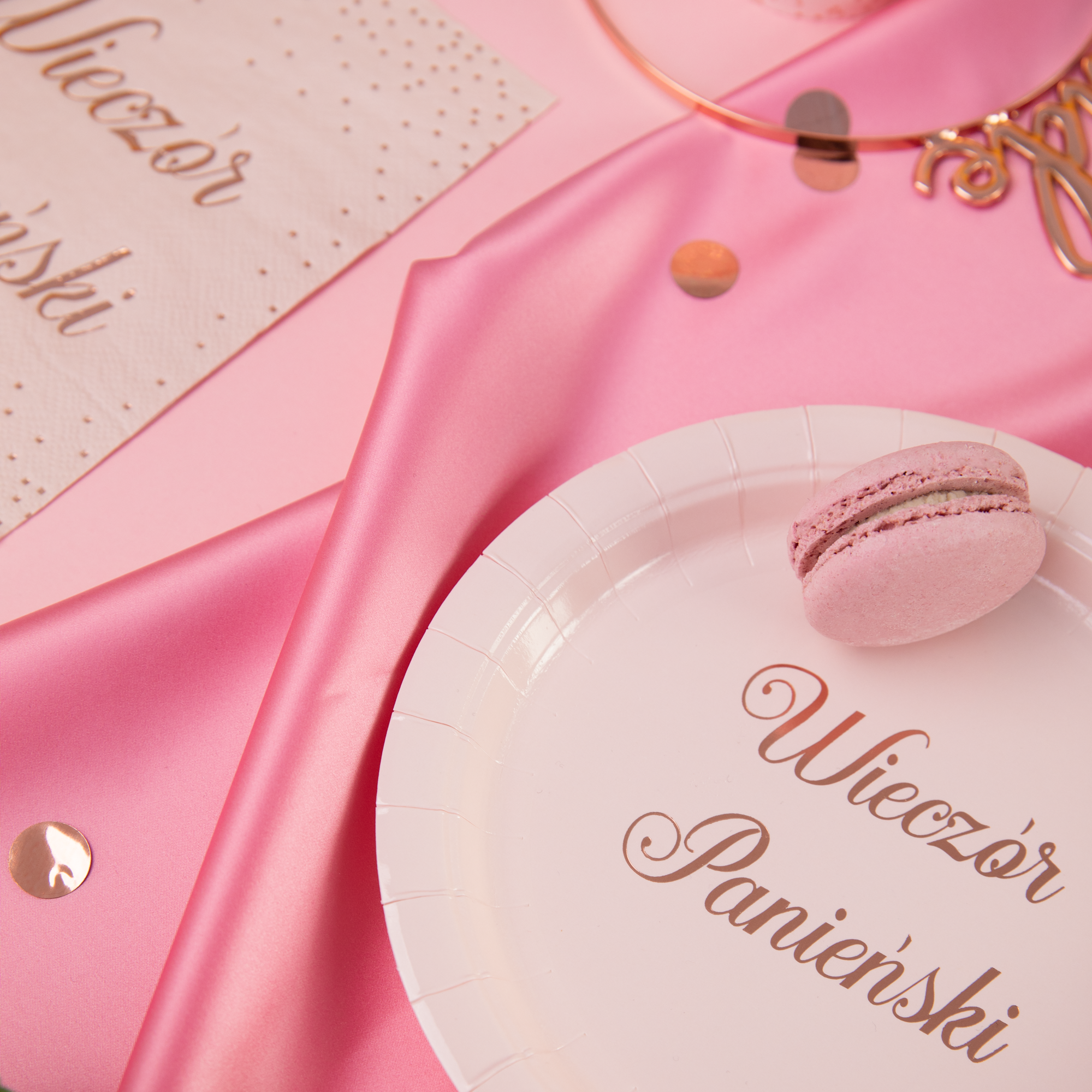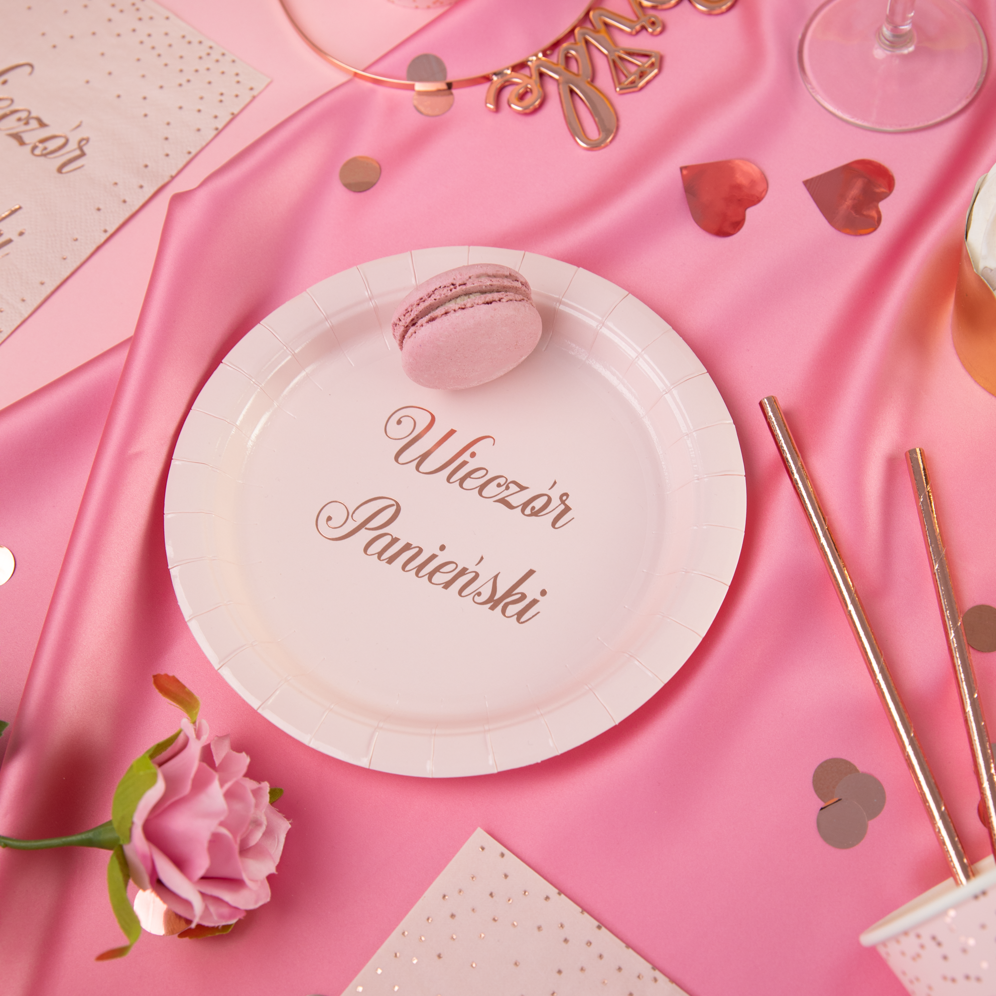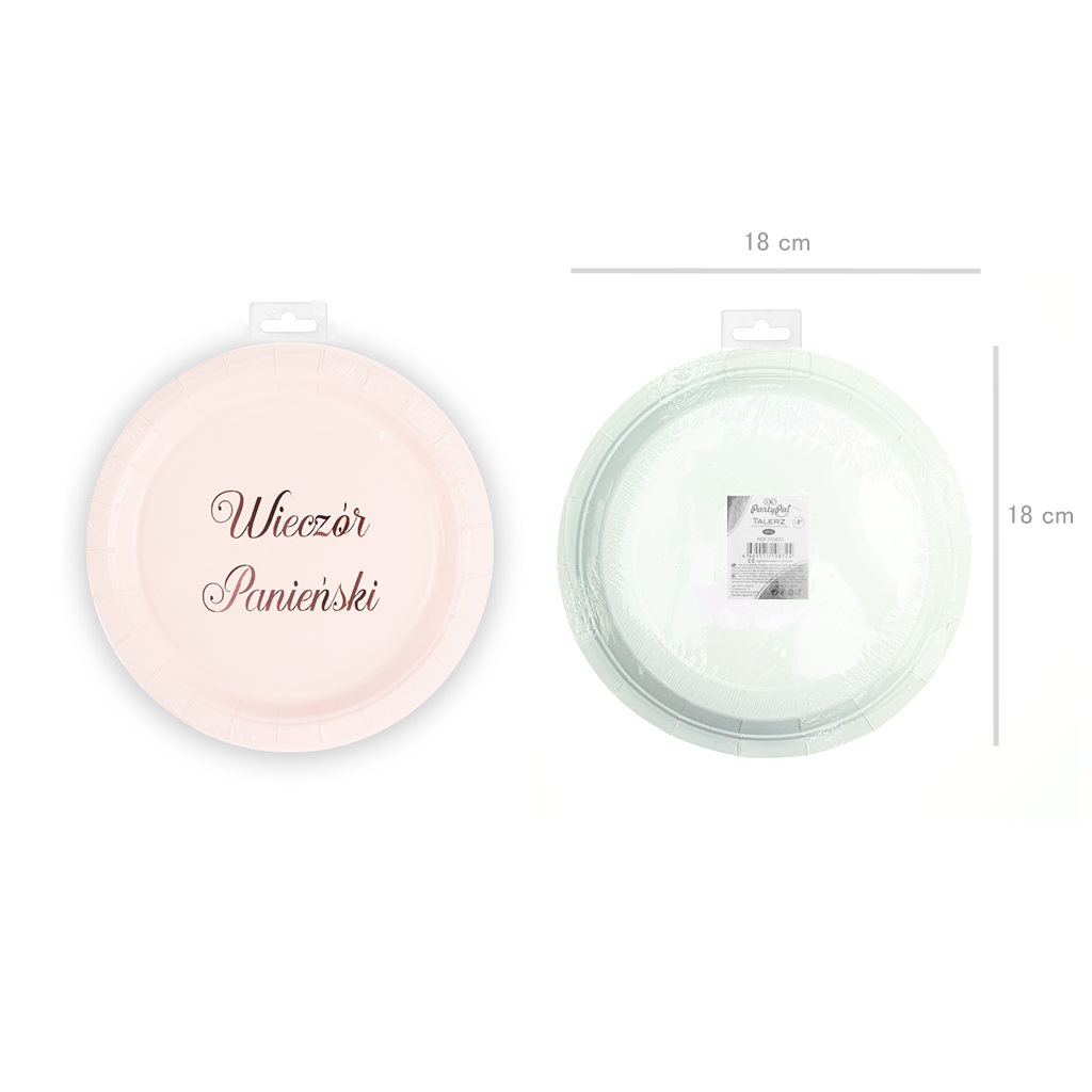 Talerzyki w pięknym odcieniu pudrowego różu z połyskującym różowym złotem napisem Wieczór Panieński. Niewątpliwie będą ozdobą imprezowego stołu.