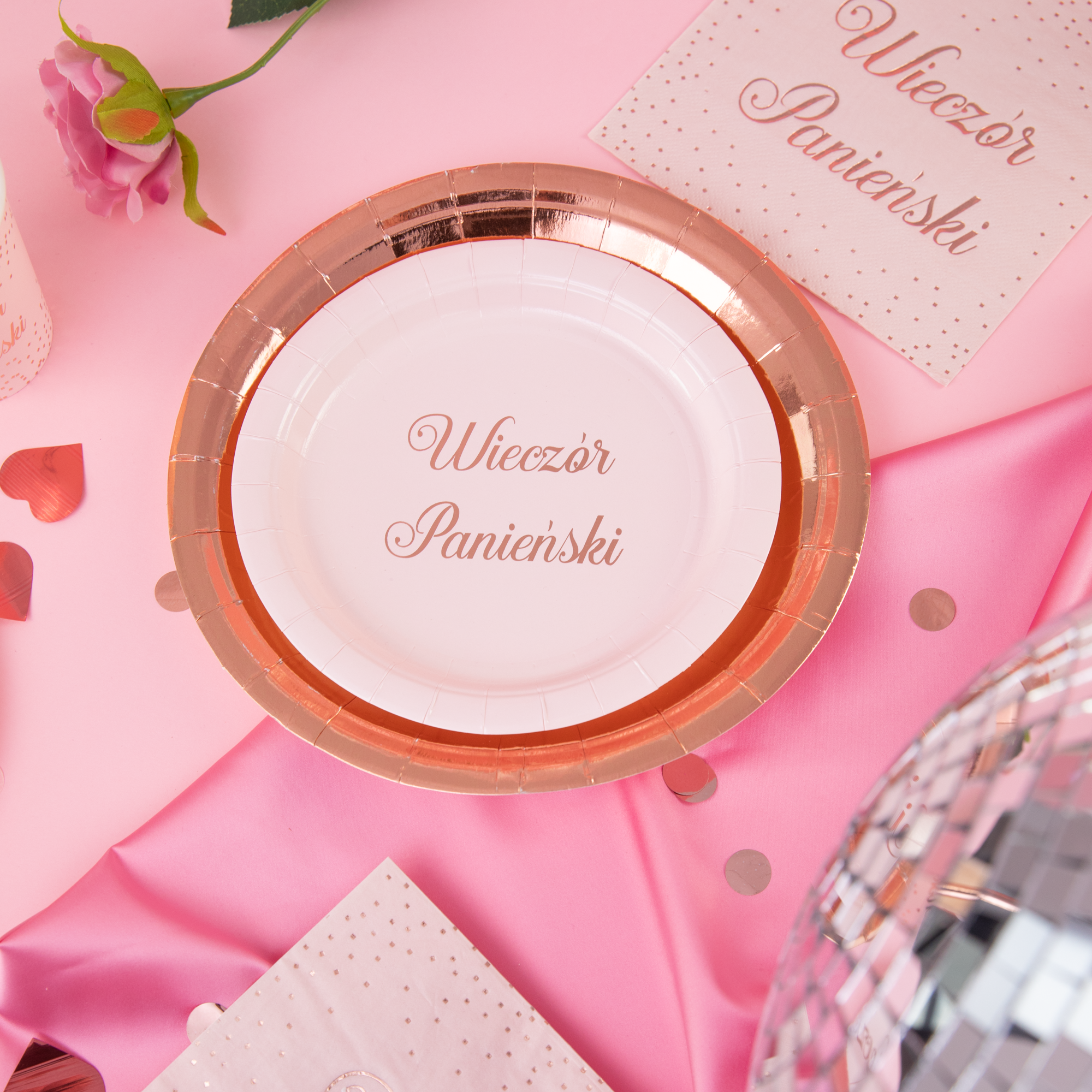 Różowy talerzyk z napisem Wieczór Panieński na  większym talerzyku w kolorze rose gold - zdjęcie kompozycyjne