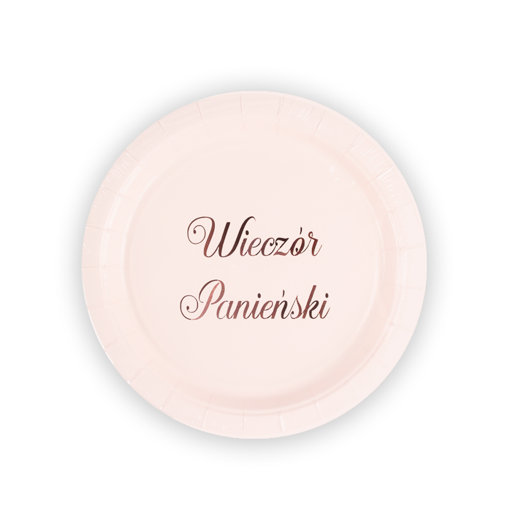 Różowy talerzyk papierowy z napisem Wieczór Panieński w kolorze rose gold