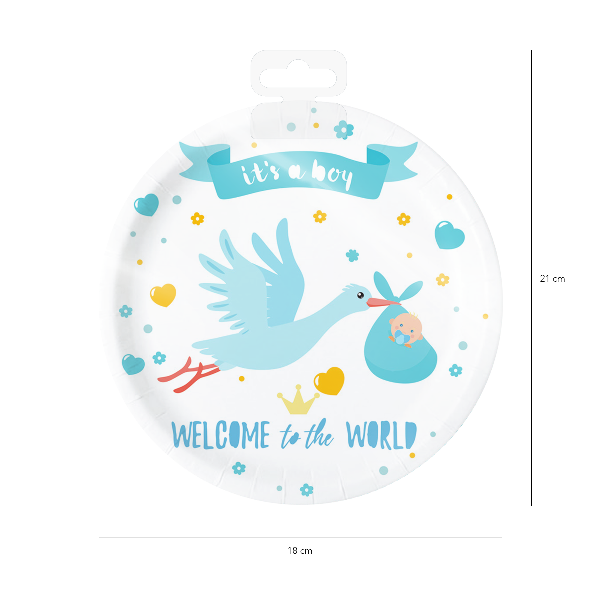 Talerzyk papierowy Baby Shower Bocian niebieski 7cali 6szt.
