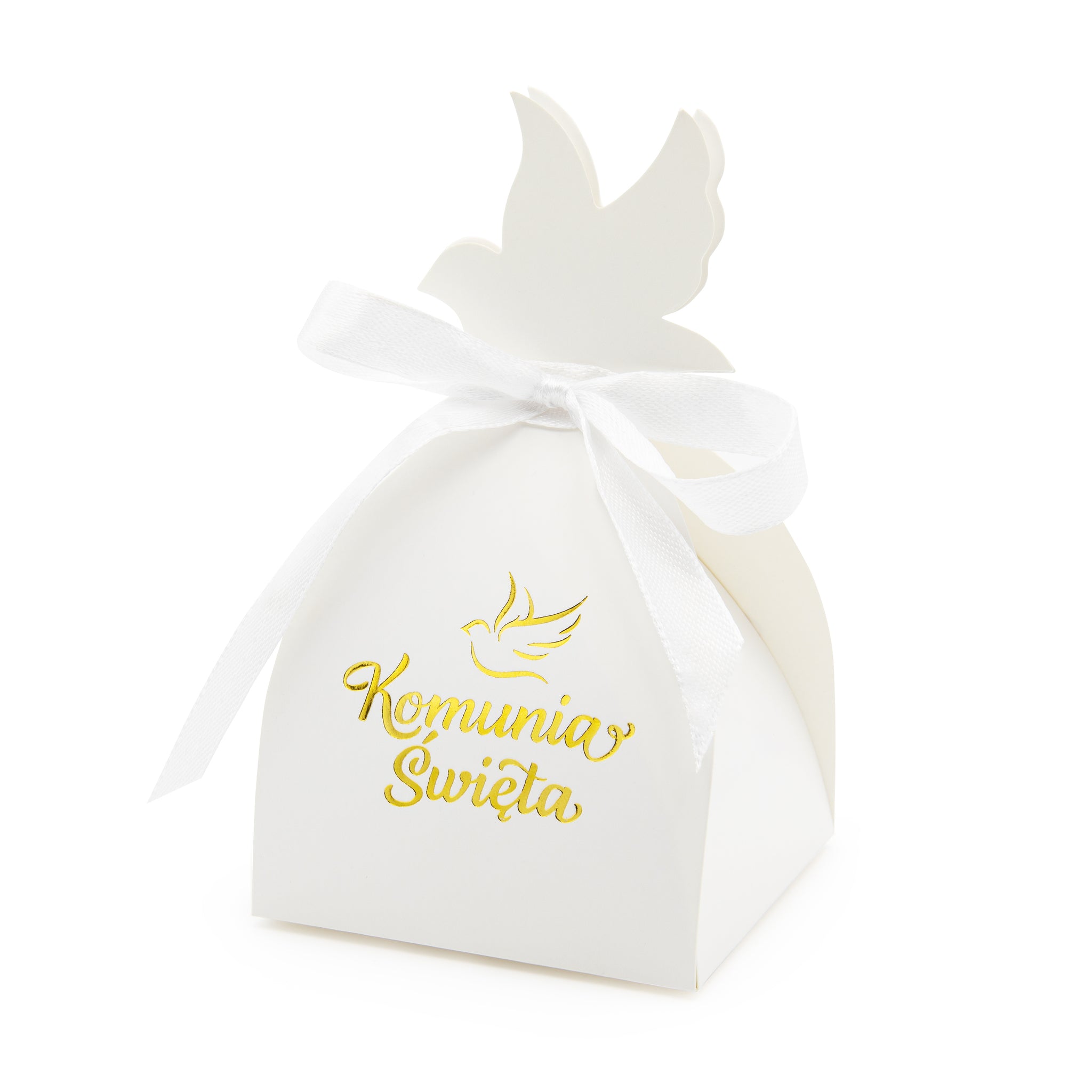 Na dwóch ściankach białego pudełka na upominki, umieszczono złoty napis Komunia Święta oraz gołąbka. Na szczycie, podobnie jak w przypadku pudełka na prezent ze złotą hostią, znajduje się powstały po złożeniu biały gołąbek. Całości dopełnia kokardka z białej wstążeczki dołączonej w komplecie.