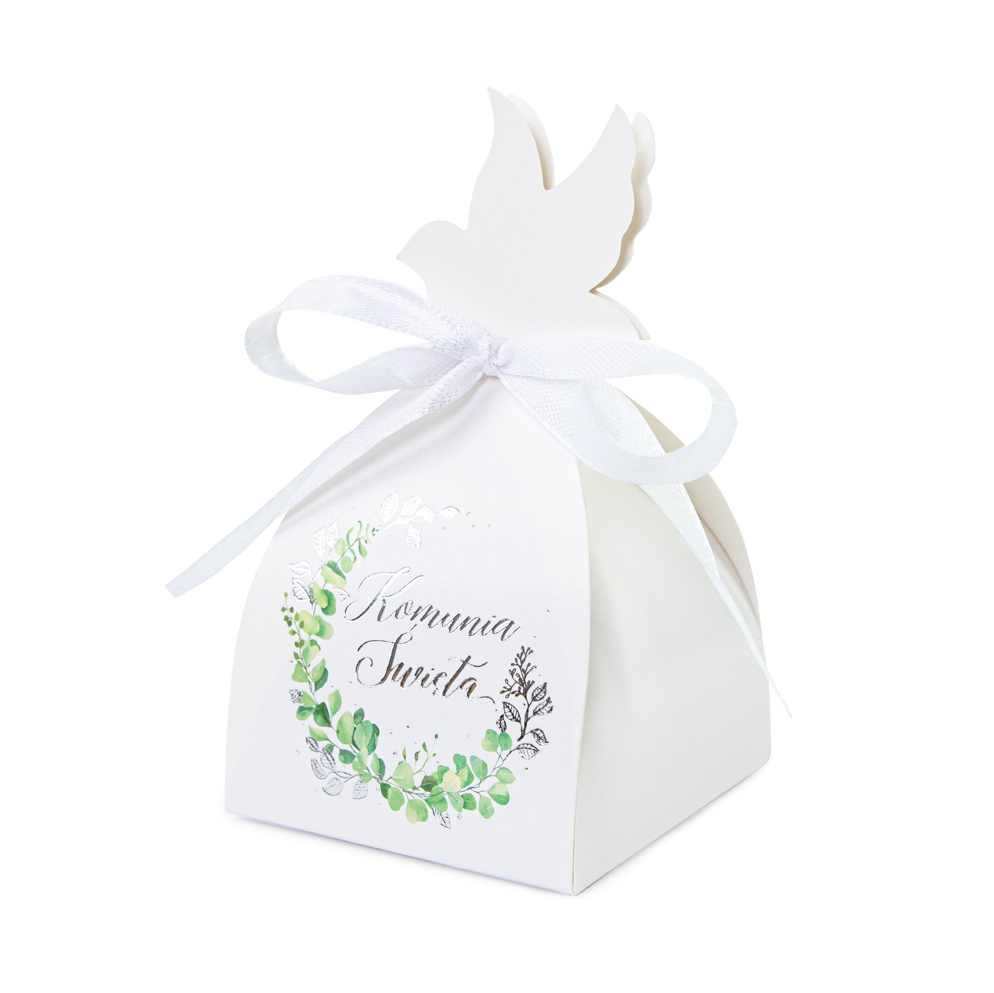 Drugi rodzaj pudełek na prezenty z serii srebrny Eukaliptus z gołąbkiem na szczycie i kokardką z białej wstążeczki. Subtelną grafikę umieszczoną na pudełku tworzy srebrny napis Komunia Święta otoczony wianuszkiem zielonych i srebrnych listków eukaliptusa.