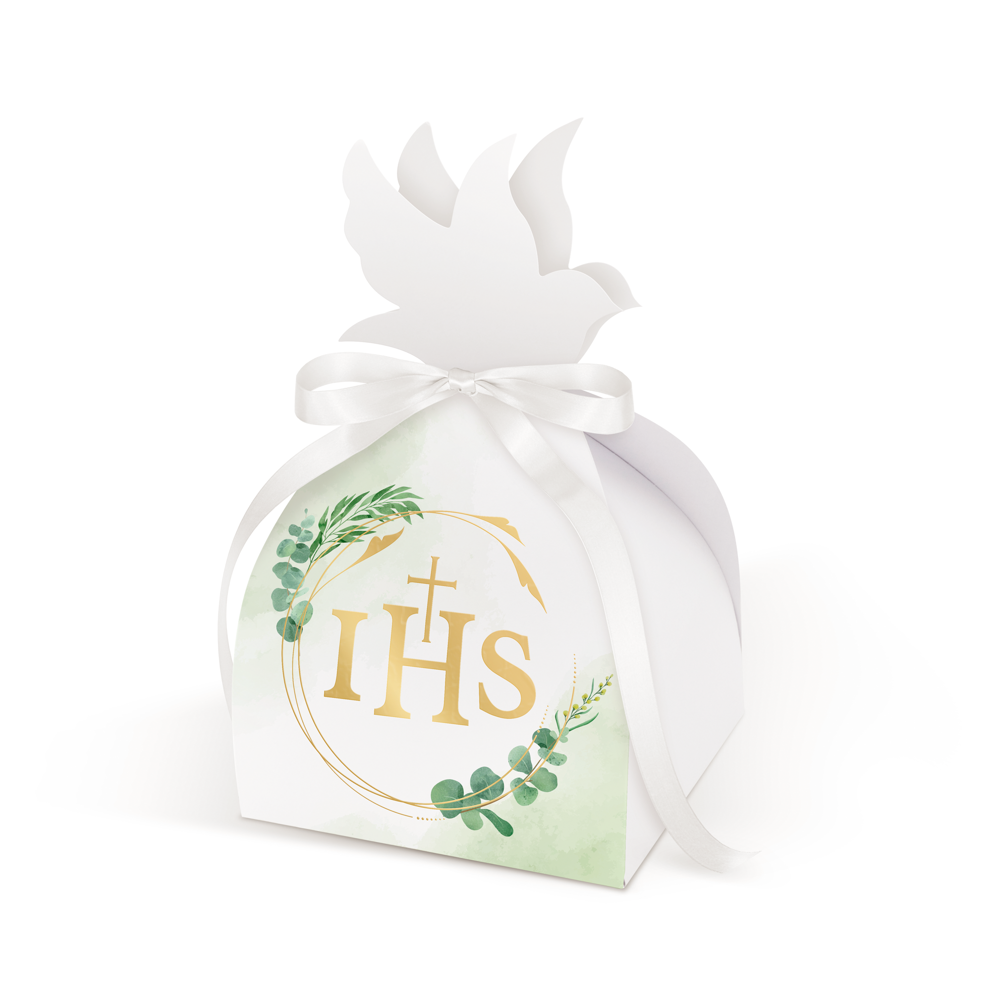 Wyjątkowe, proste do złożenia pudełka na prezenty dla gości. Białe pudełeczko ze ślicznym, subtelnym gołąbkiem na szczycie, złotym napisem IHS podkreślonym przez zieleń gałązek oraz satynową białą wstążką, będzie wspaniałym opakowaniem upominków dla uczestników komunijnego przyjęcia.