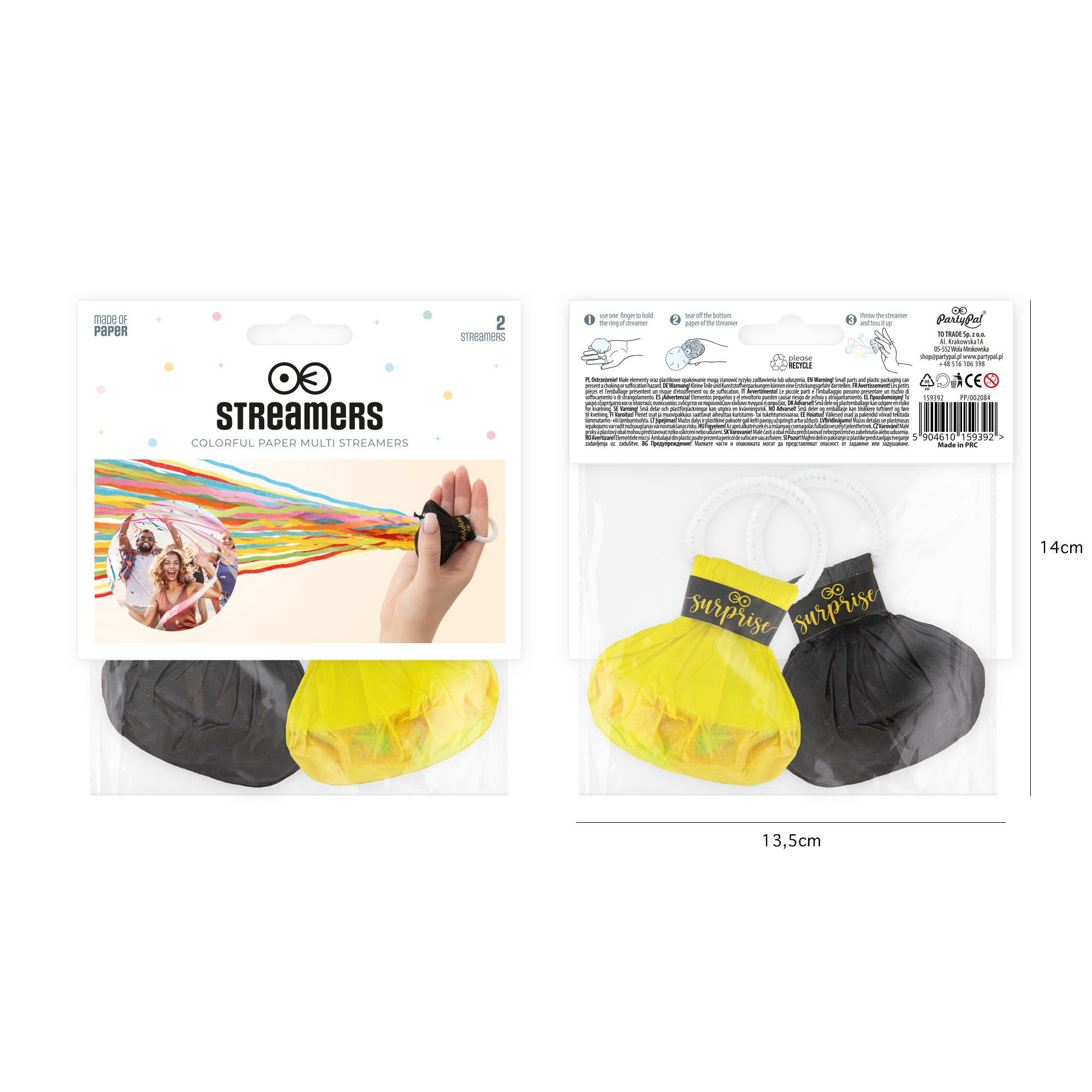 W zestawie znajdują się 2 woreczki z papierowymi serpentynami z zawieszką. Każdy woreczek zawiera 29 szt. papierowych serpentyn. Idealne rozwiązanie dla osób, które chcą zachować czystość w miejscu użycia.