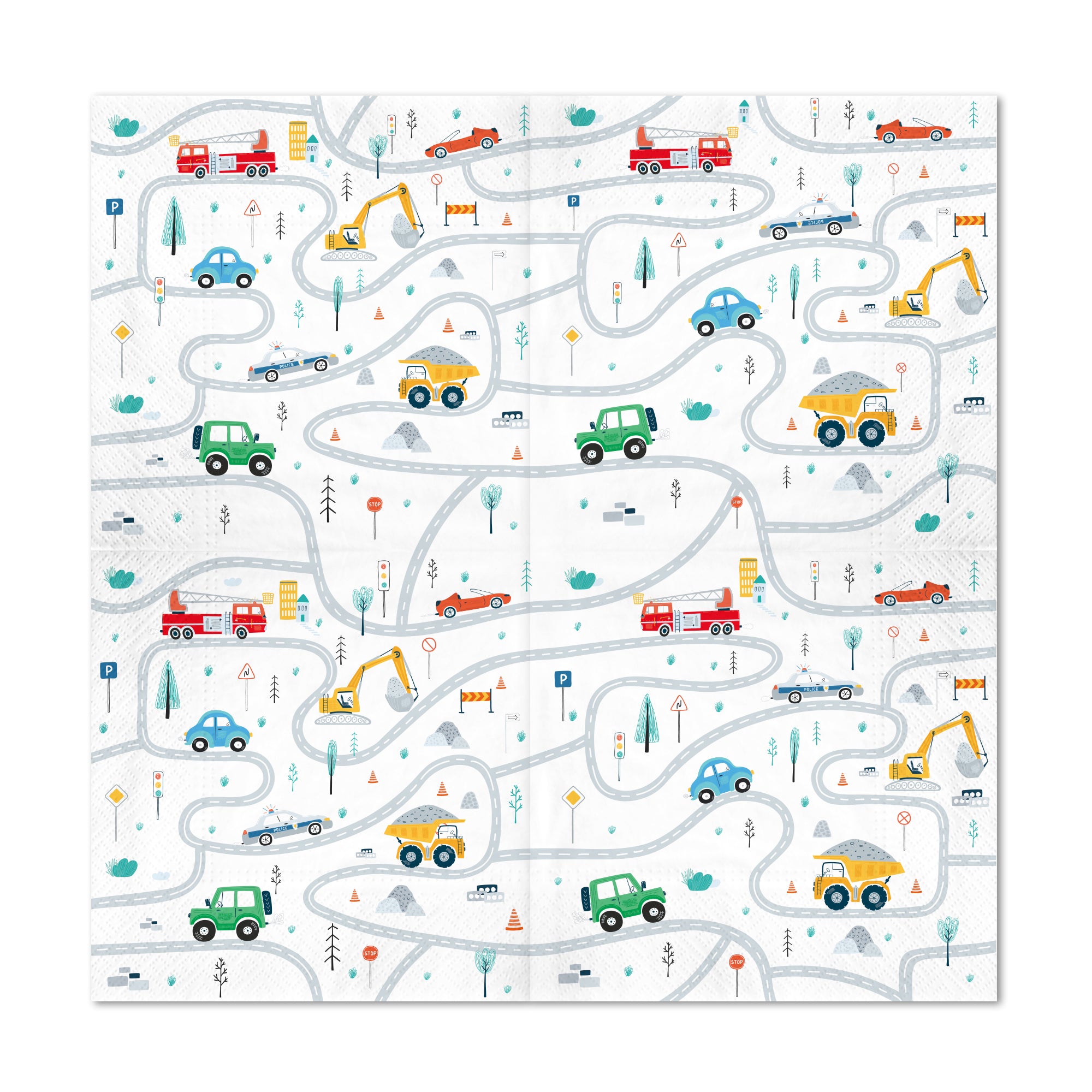 Na serwetce z kolekcji Auta wiele się dzieje. Samochody jadą po krętych drogach, a każdy z nich ma do wykonania zadanie. Radiowóz i wóz strażacki pędzą na sygnale, wywrotka i koparka remontują drogę. Dokąd jadą jeep, garbus i kabriolet? Dzieci będą miały wiele odpowiedzi na to pytanie.
