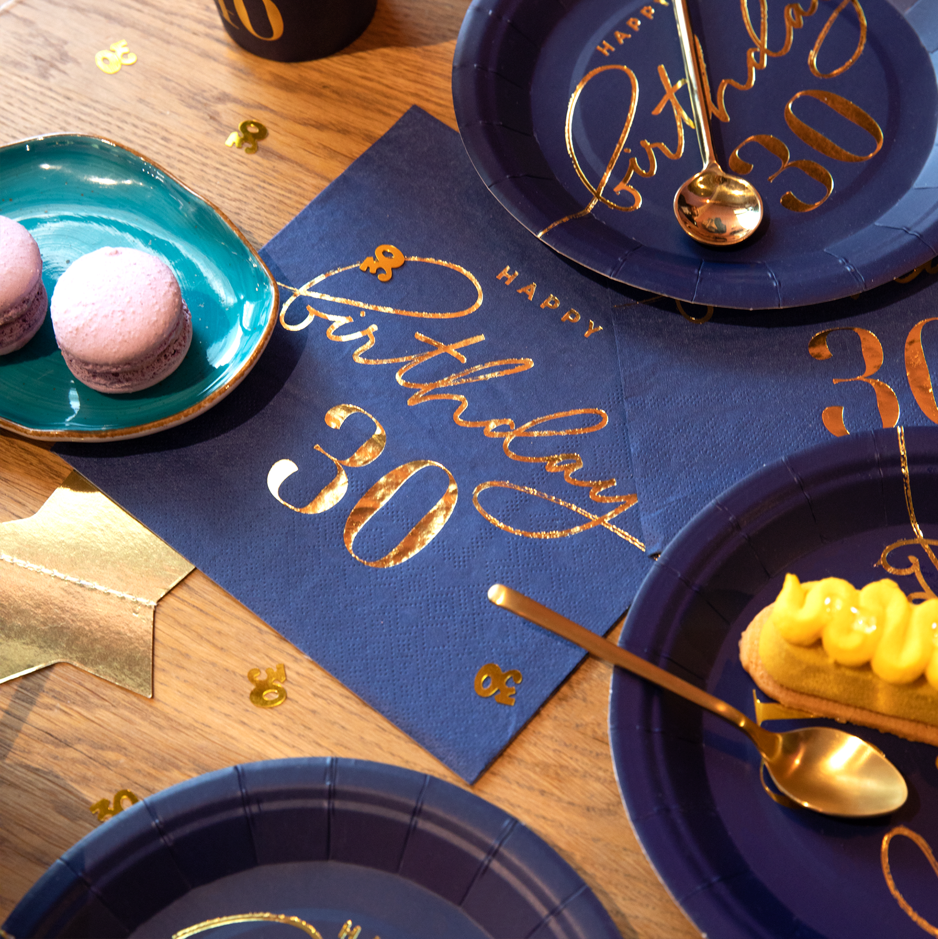 Granatowe tło i złote napisy tworzą bardzo eleganckie zestawienie kolorystyczne. Razem z kubkiem i talerzykiem z kolekcji na 30 urodziny, serwetki podkreślą uroczyście obchodzone chwile.